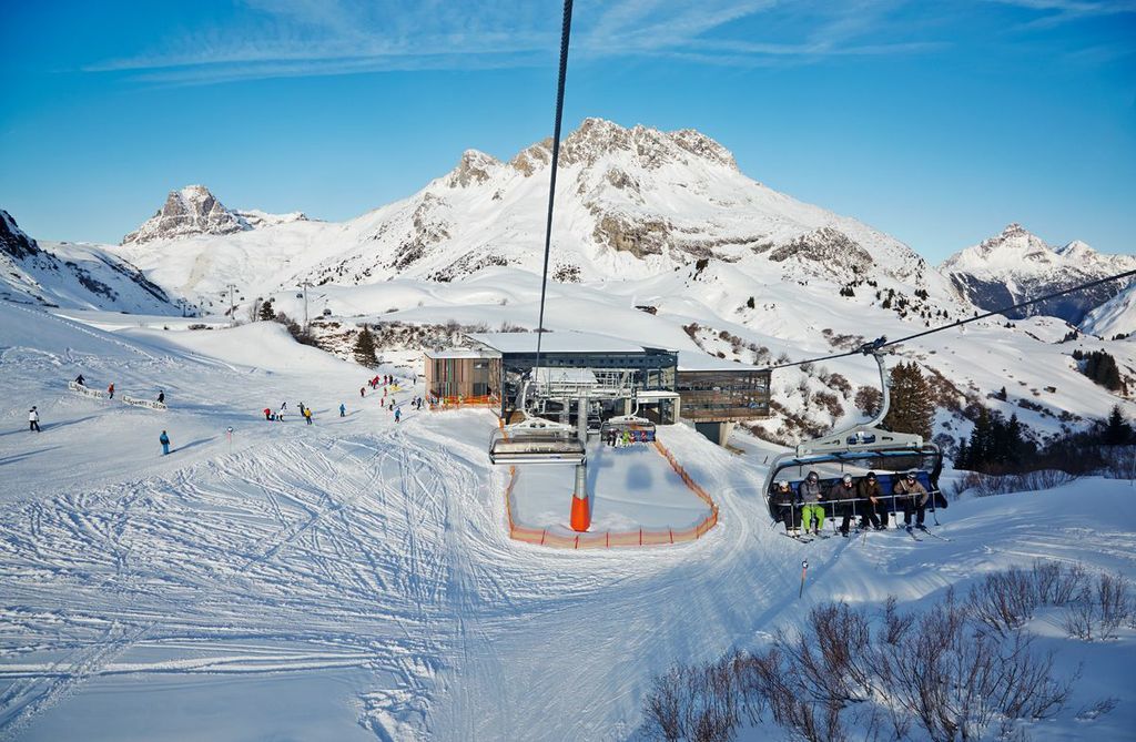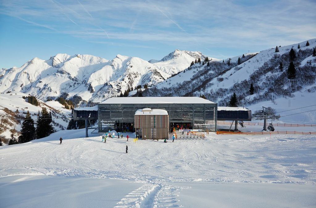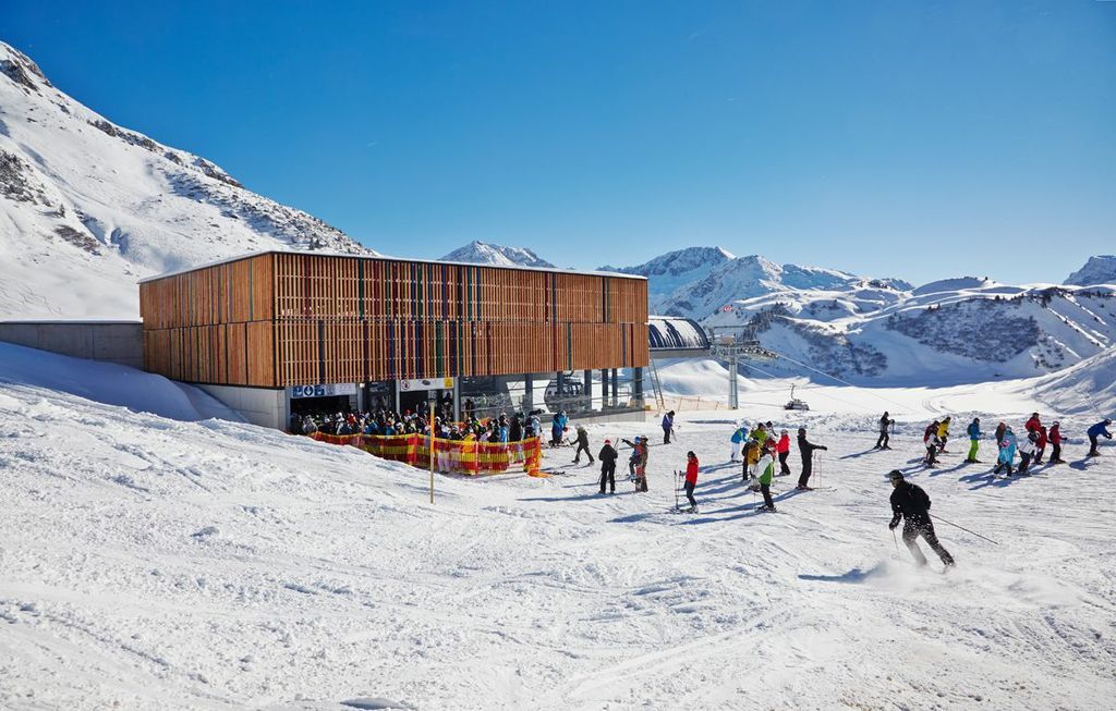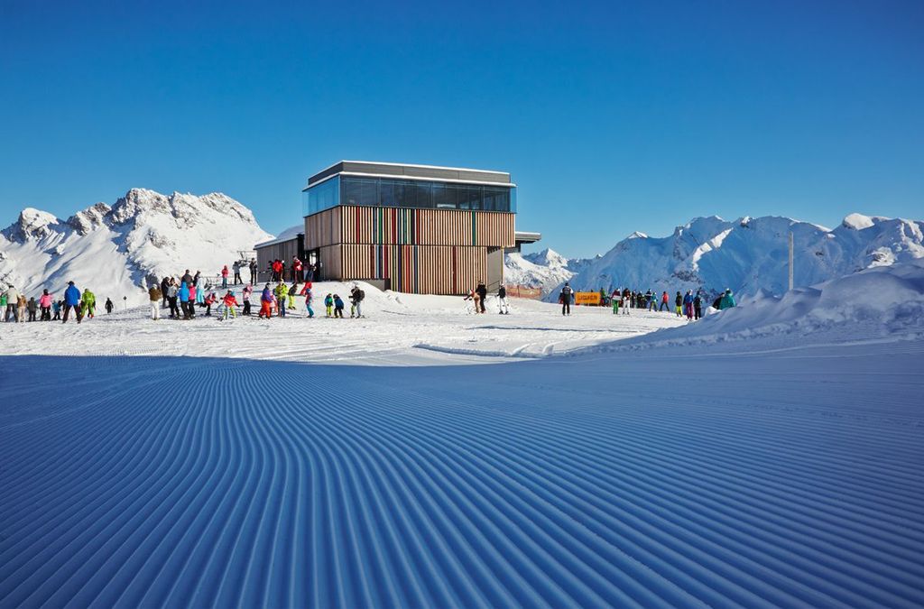 Kunst am Bau: Franz Türtscher ersetzte die gehobelten Lärchenlatten der Fassade teilweise durch verschieden farbige Aluprofile. Die dynamisch verteilten Farbstreifen können als Referenz an die bunte Bekleidung der Schifahrer auf der Piste gesehen werden oder im Sommer an die Farben der Bergflora erinnern. Das Konzept beruht auf Variationen der drei Grundfarben, deren ästhetische Wirkung sich mit dem fortschreitenden Vergrauen der Holzlatten im Lauf der Jahre noch intensivieren wird. (Text: Tobias Hagleitner)