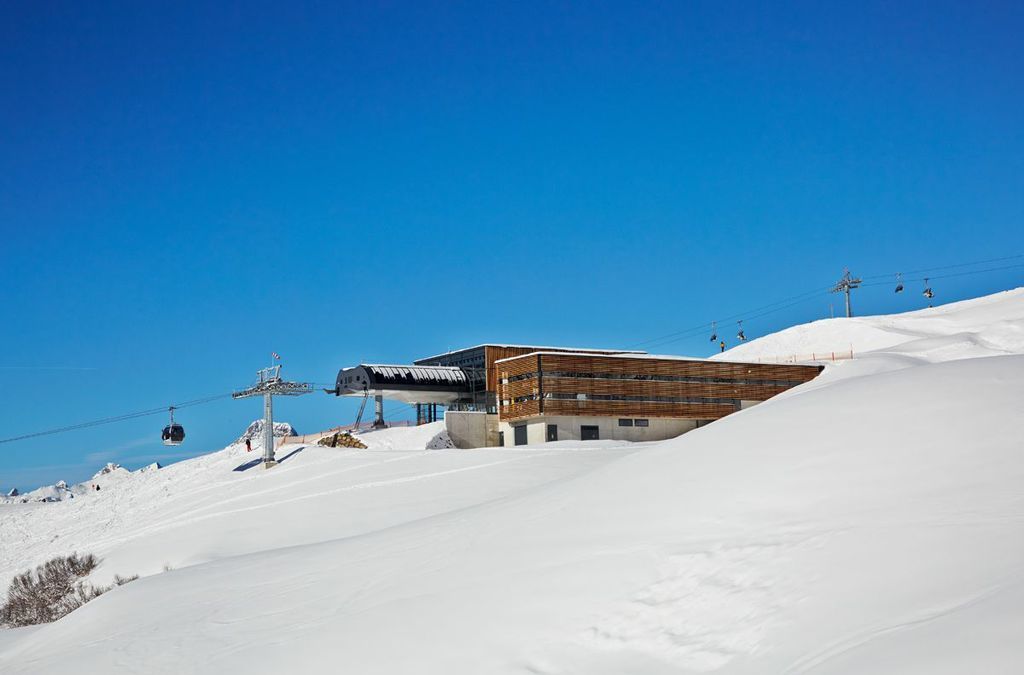 Die Bergstation in Oberlech - ebenfalls auf der bestehenden Bahnachse der Weibermahdbahn - unterscheidet sich von der „Hallen“-Typologie der beiden anderen Stationen und wurde im Volumen niedriger gehalten. Das Hauptdach der Seilbahn wird von zwei flach geneigten Dächern als Bahnsteigüberdachungen begleitet. Bergseitig wird die Kubatur durch ein Obergeschoss erweitert. In diesem Info- und Ausstellungsraum für die Skilifte Lech eröffnet sich den Gästen durch das durchlaufende Fensterband das weite Landschaftspanorama.