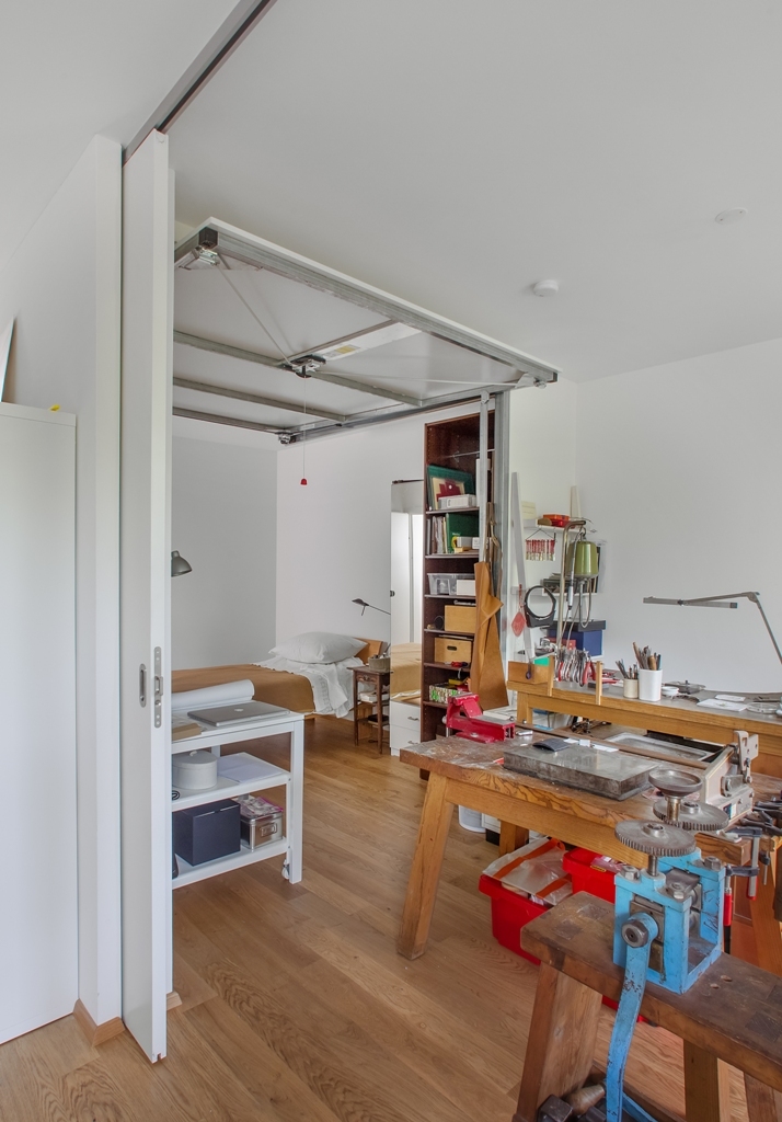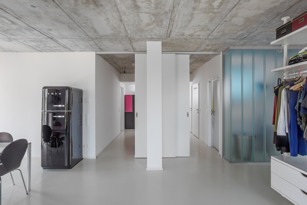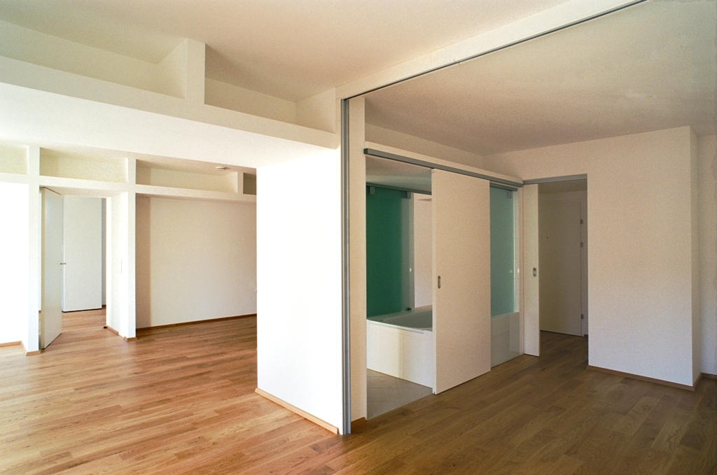 Die Idee des Fließenden, des Veränderbaren wird ganz konsequent im Inneren der Gebäude weitergedacht. Die einfache bauliche Struktur mit tragenden Außen- und Mittelwänden sowie ein effizientes Haustechniksystem der „horizontalen“ Sammelschächte bietet ein Höchstmaß an Flexibilität im Konfigurieren der Wohnungen. Zentrale Idee dahinter: Die Wohnung verharrt nicht im Status eines starren Regelwerks in den Beziehungen zwischen den Menschen. Das Team von RLP Rüdiger Lainer Partner entwickelt vielmehr ein Beziehungsgefüge, das sich den unterschiedlichen Wohnungsnutzungen anpassen lässt. Räume können zugeschaltet („Familienfeste“) oder abgetrennt („temporäre Arbeitsplätze“) werden. Selbst jene Bereiche, die den Baubürokraten als „Nasszellen“ geläufig sind, eröffnen ungewöhnliche Perspektiven, wenn ihre Schiebwände zurückgezogen sind.