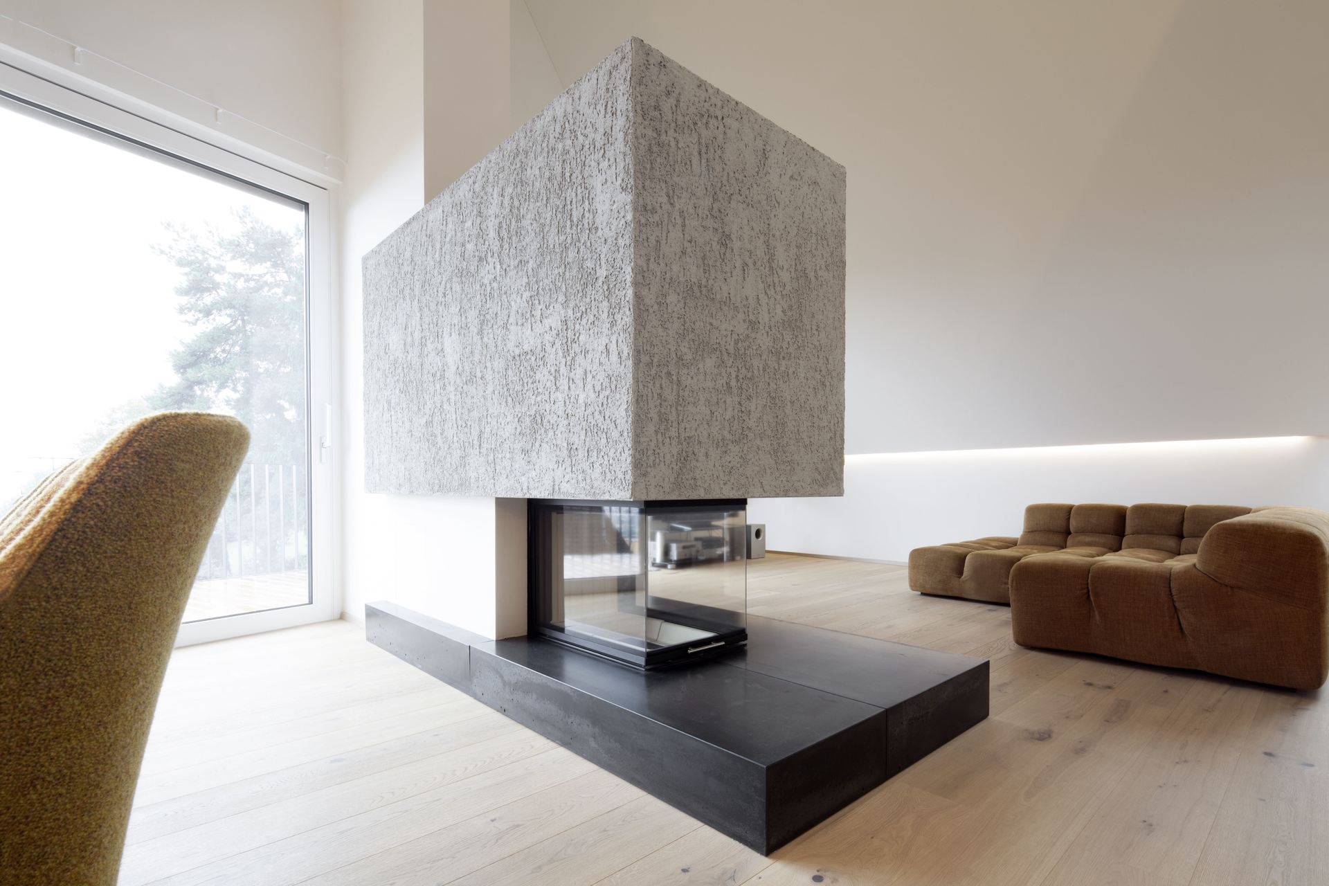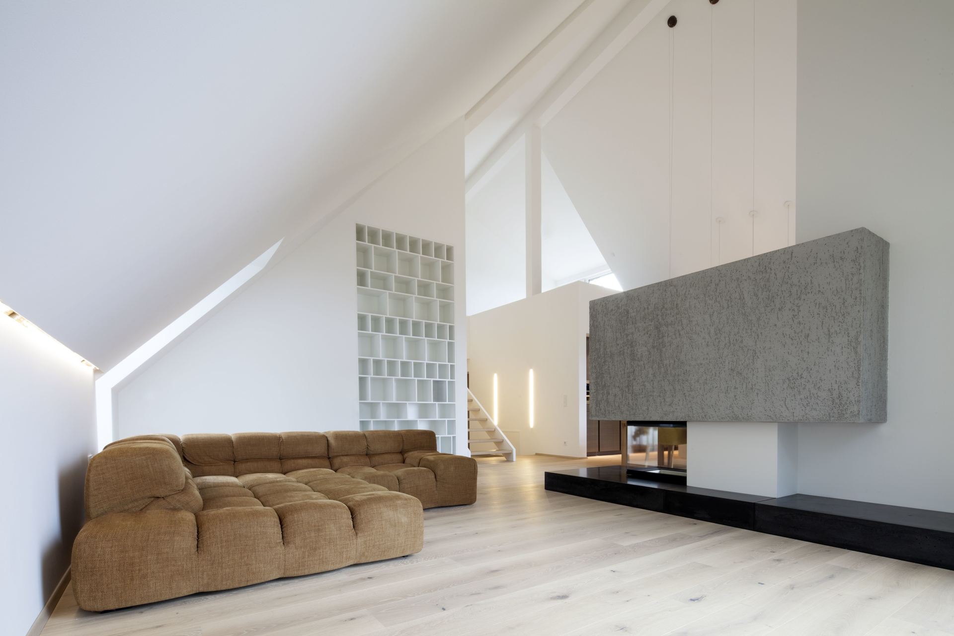 Dem sakral anmutenden Raum wurden mit warmen, grob texturierten Materialien Akzente entgegen gesetzt und dadurch eine wohnliche Atmosphäre geschaffen. Das Zentrum bildet ein mächtiger offener Kamin, eine archaische Feuerstelle in reduzierter Formensprache, mit Betonsockel und Verkleidung aus grobem Rauputz. Im obere Bereich befindet sich neben einem Gästezimmer auch eine Galerie. (Text: Architekten)