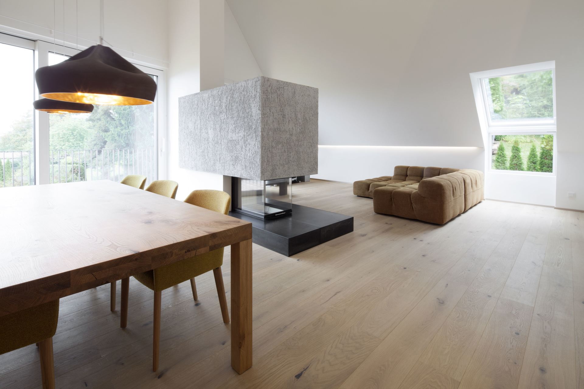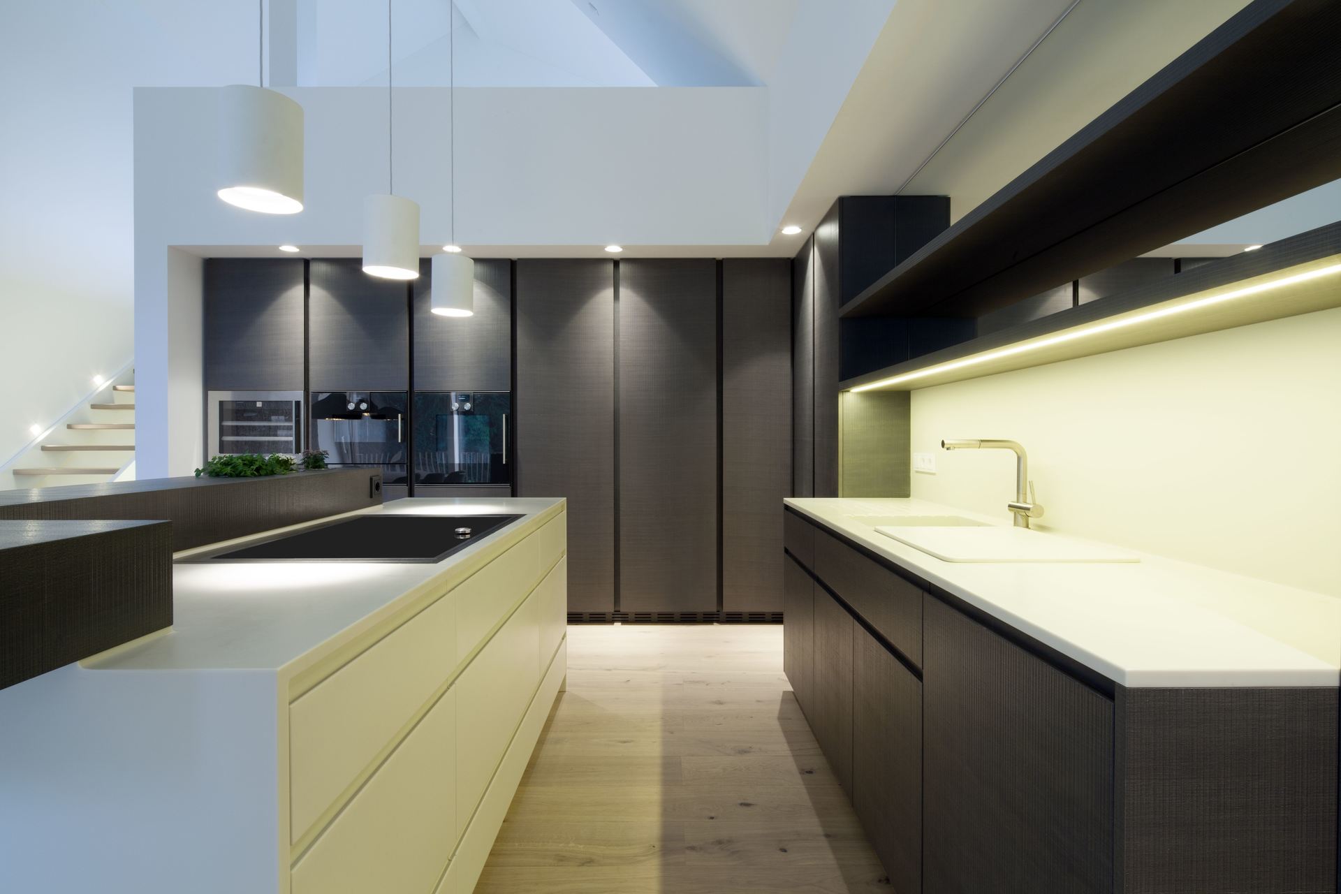Im obersten Geschoß befindet sich das großzugig angelegte Penthouse, welches von destilat geplant wurde. Eine offene, großzügiger Wohnküche mit bis zu 6,5 Meter hohen, offenen Dachschrägen und einer Galerie, wurden auf die Kundenbedürfnisse massgeschneidert gestaltet. Im Zentrum steht die Küche mit den Hochschränken, eine destilat Eigenkreation. Genauso wie der Esstisch aus Eiche, der von destilat eigens für den Bauherrn entworfen wurde.