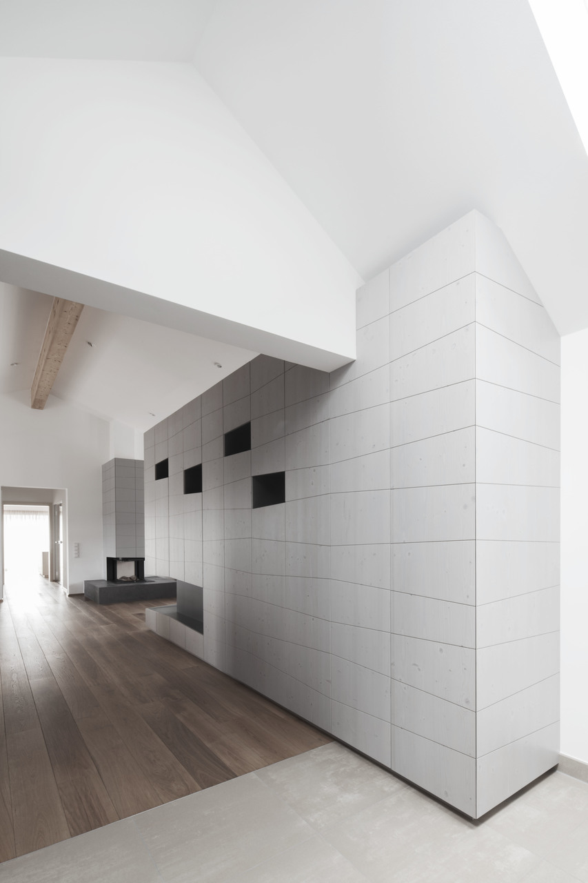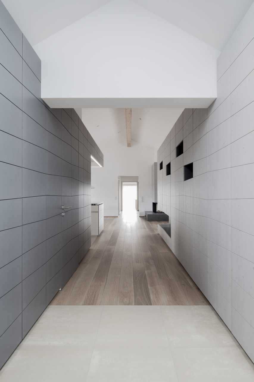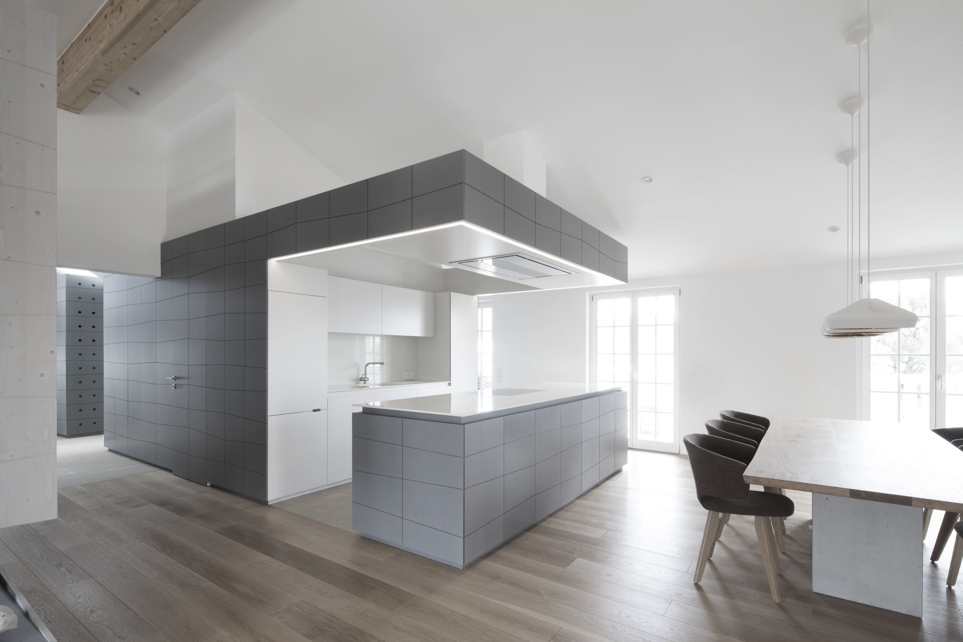 Das Interior Design Konzept ist inspiriert von Strukturen, Texturen und der Dynamik von Dachlandschaften. Mit der Verwendung von gefrästen Eternit Fassadentafeln in den Möbelfronten, auch abseits des Küchenbereichs, zitiert es auch ein Spezifikum der österreichischen Nachkriegsarchitektur. (Text: Architekten)