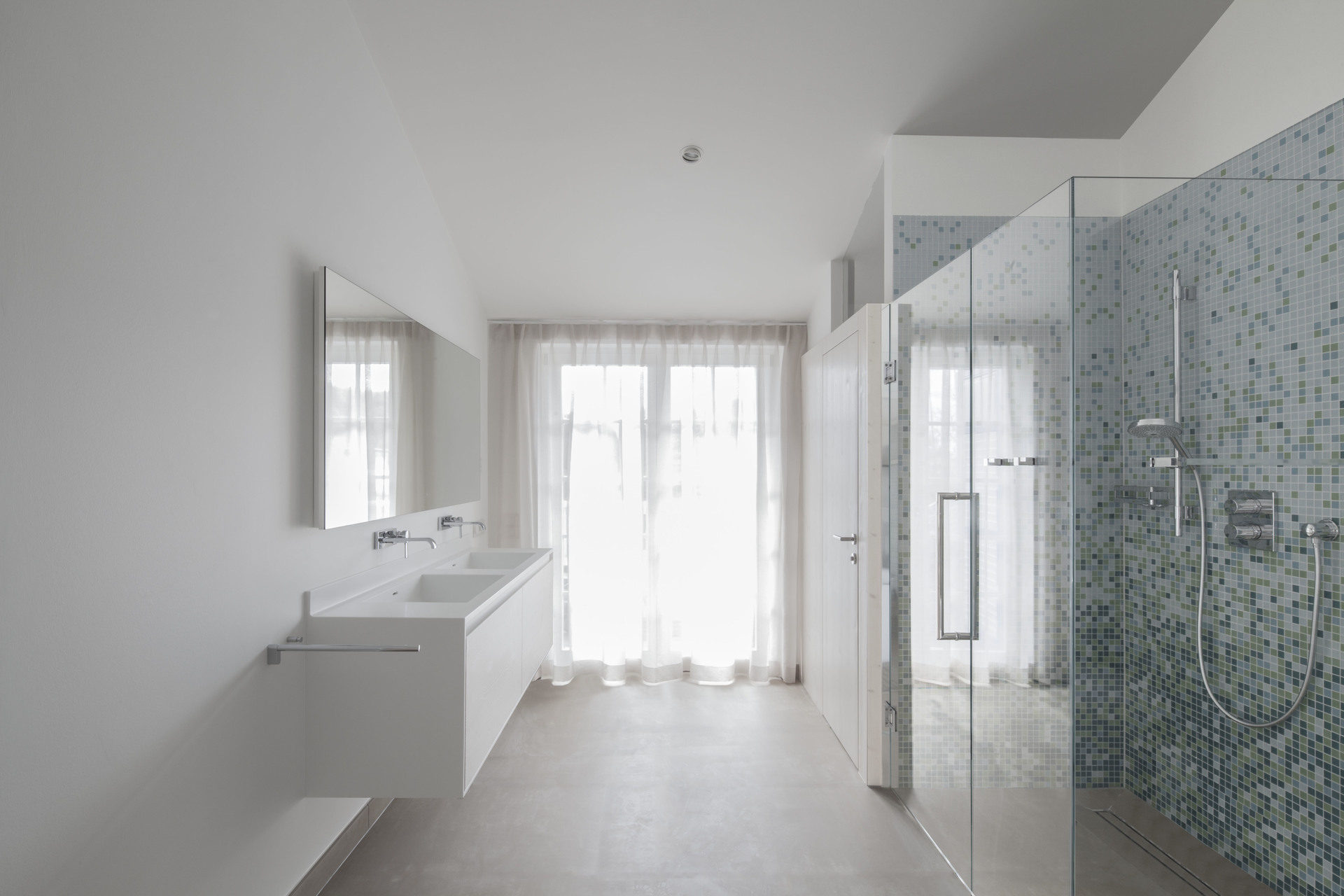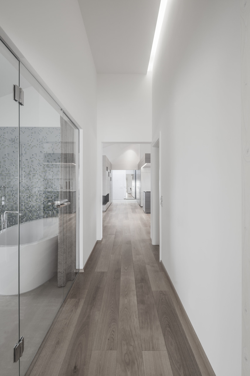 Insgesamt entstand ein Penthouse mit 250 m² Wohnfläche, das einer sieben-köpfigen deutschen Unternehmerfamilie als Ferien Domizil dient. Die ruhige, harmonische Stimmung in diesem Apartment entsteht hier durch helle Böden, behagliche Grautöne und großzügige, weiße Flächen.