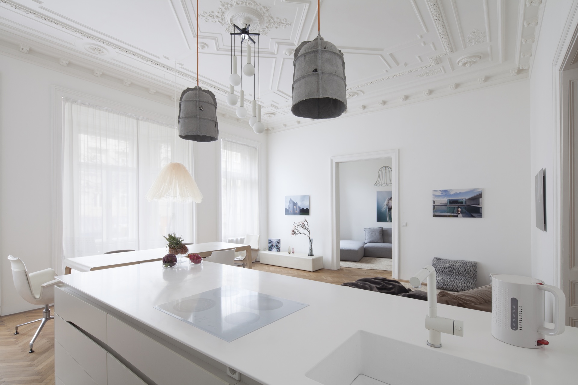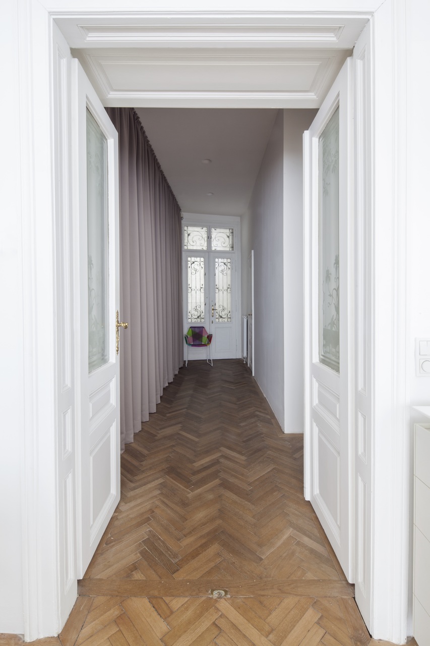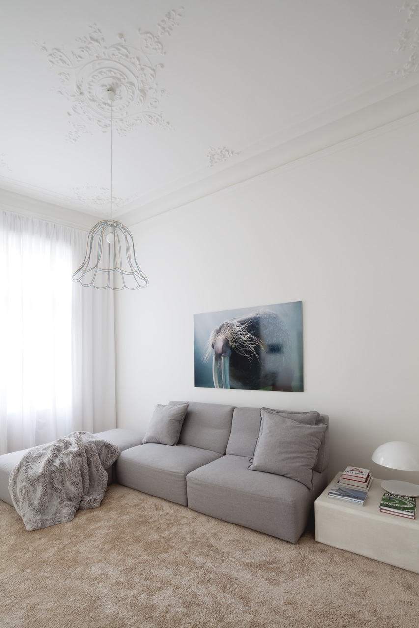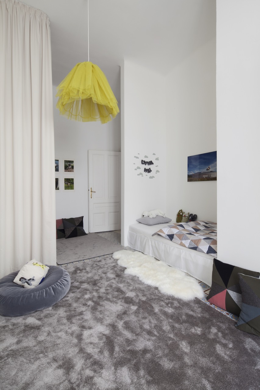 Die typische Altbau-Raumstruktur wurde den Anforderungen an einen modernen Wohnstil angepasst. Die Küche wurde in den Wohnbereich integriert, um ein zusätzliches hofseitiges Kinderzimmer zu erhalten. Auch das ehemalige winzige Badezimmer wurde als Bettnische in das neu geschaffene Kinderzimmer integriert.