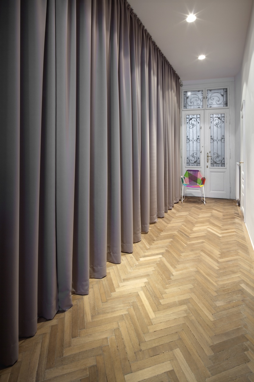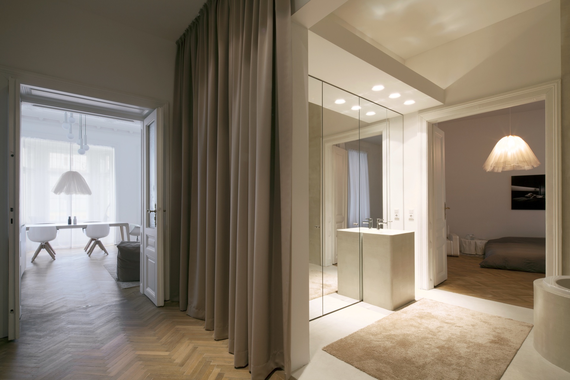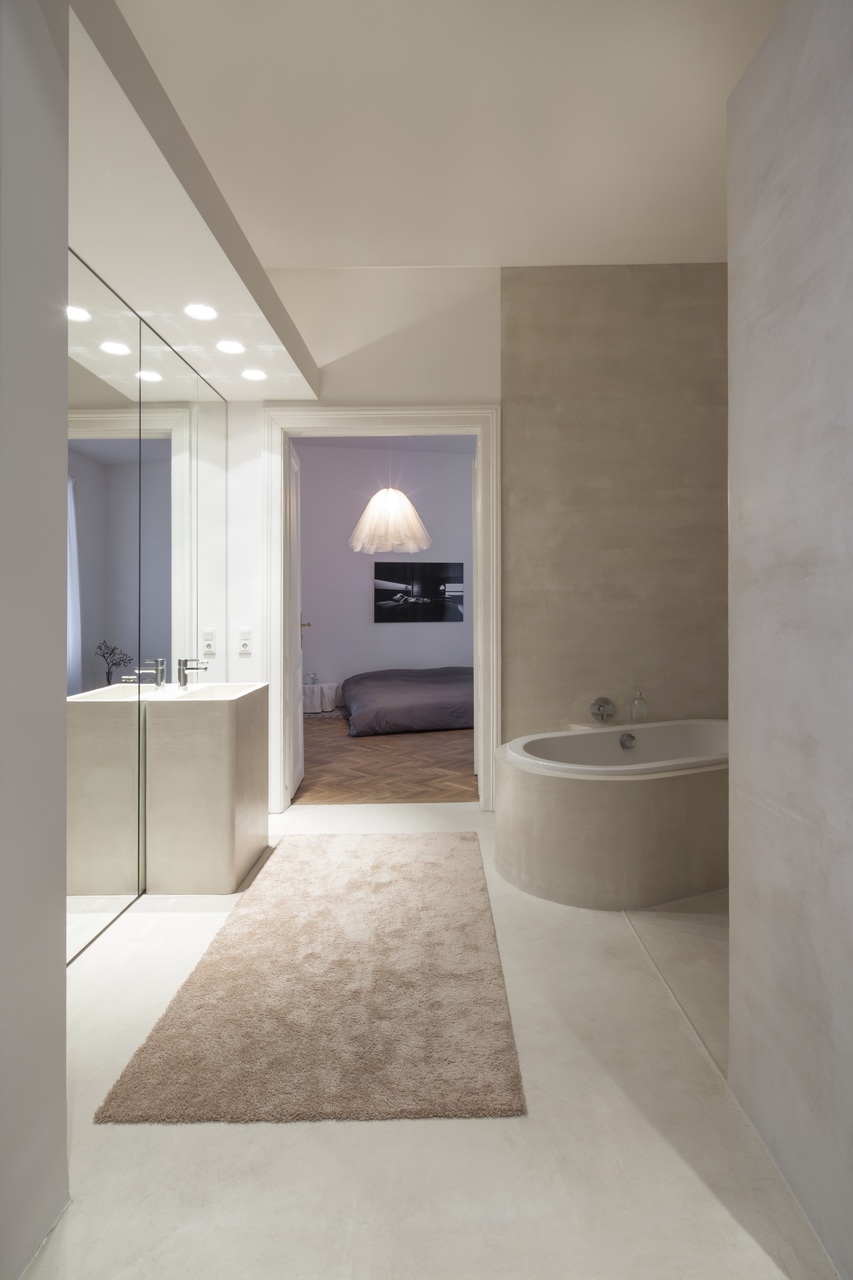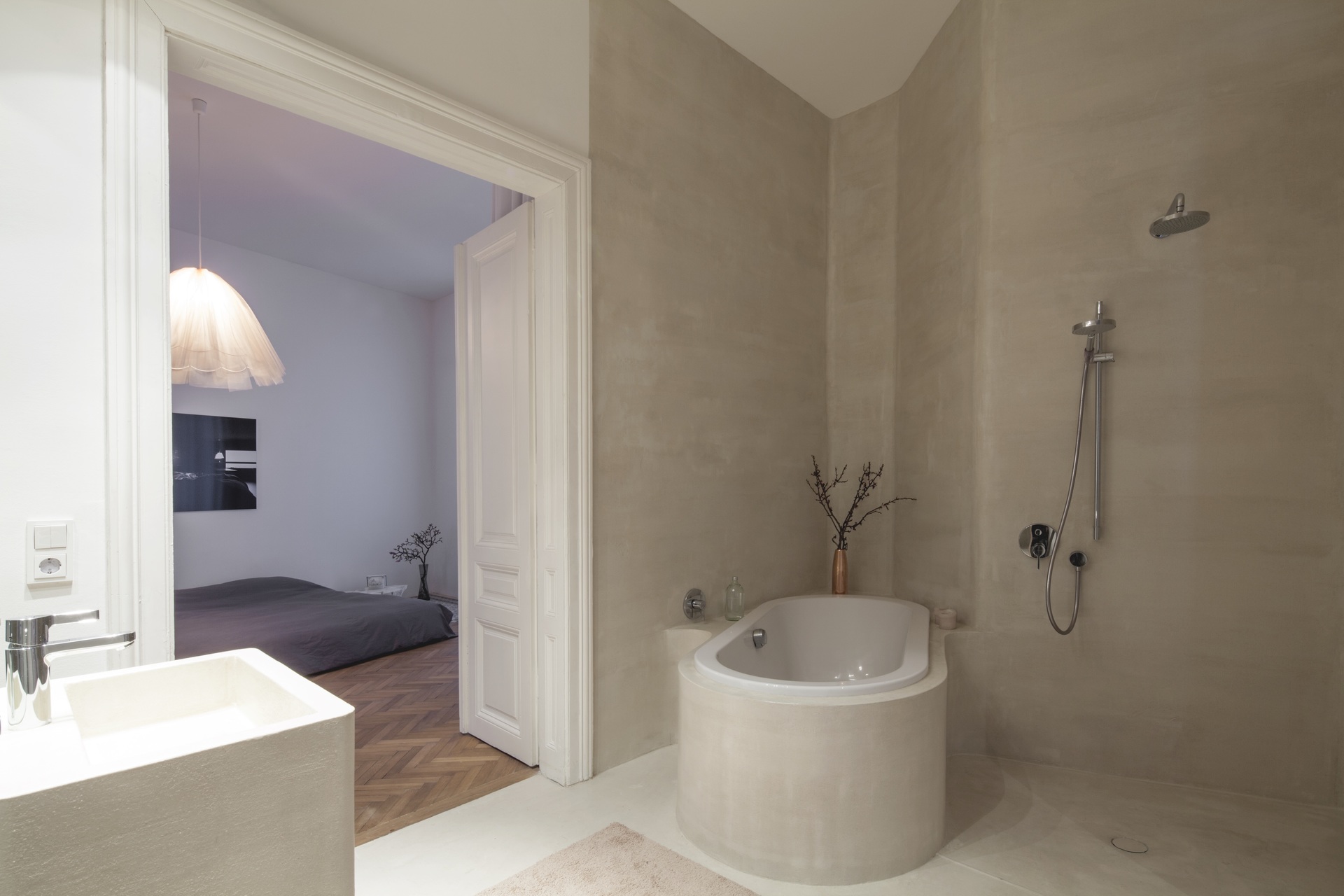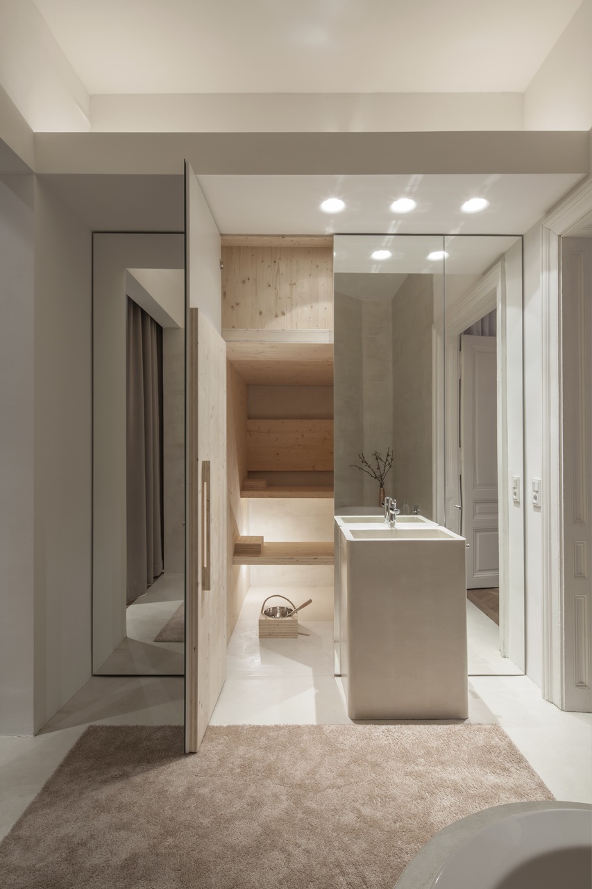 Der ehemalige Eingangsbereich wurde gemeinsam mit einem WC und einem Schrankraum in ein großzügiges Wellnessbad mit Sauna umgestaltet, wobei auf eine Wand zum Vorraum verzichtet wurde. Als Raumtrenner dient nun ein Vorhang, der bei Bedarf geschlossen werden kann. Wände, Boden und Waschtisch im Badezimmer wurden mit weißem Fliesenkleber gespachtelt und versiegelt. Dadurch entstand eine homogene, monolitische und nahezu fugenlose Raumstruktur.
