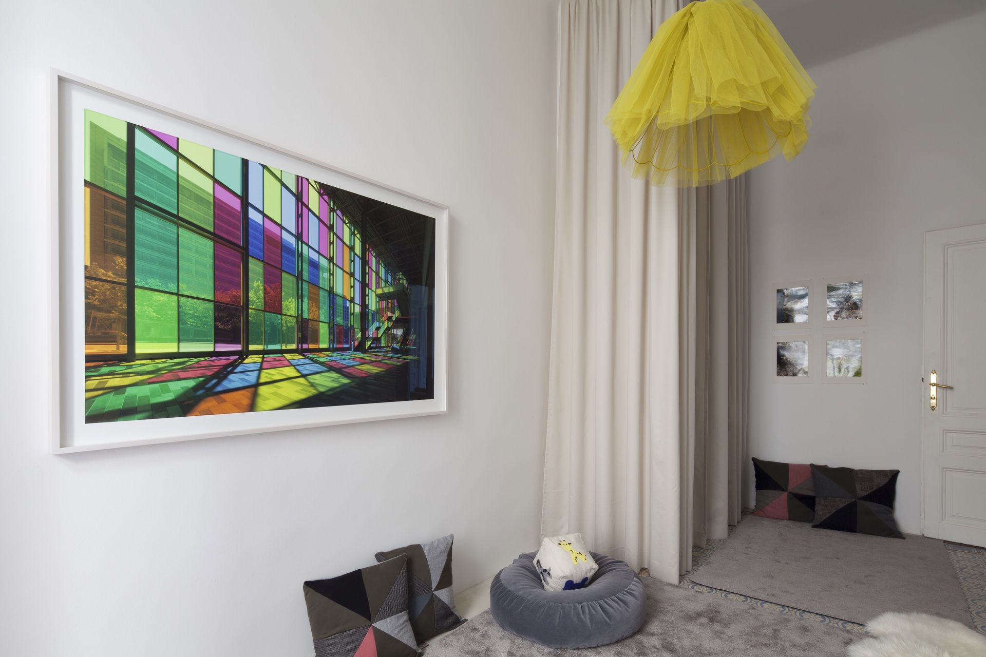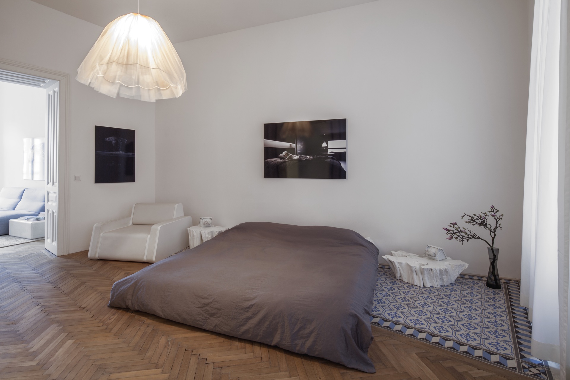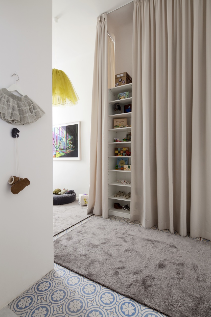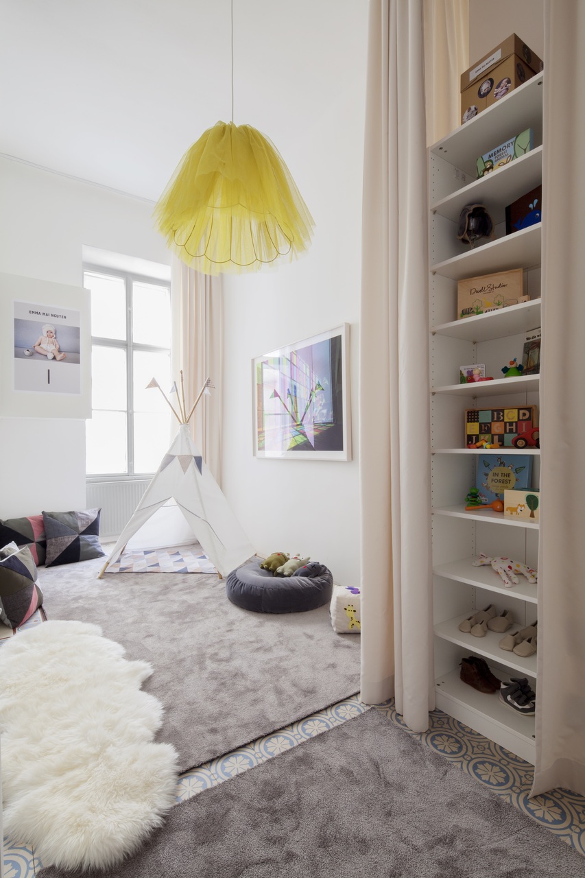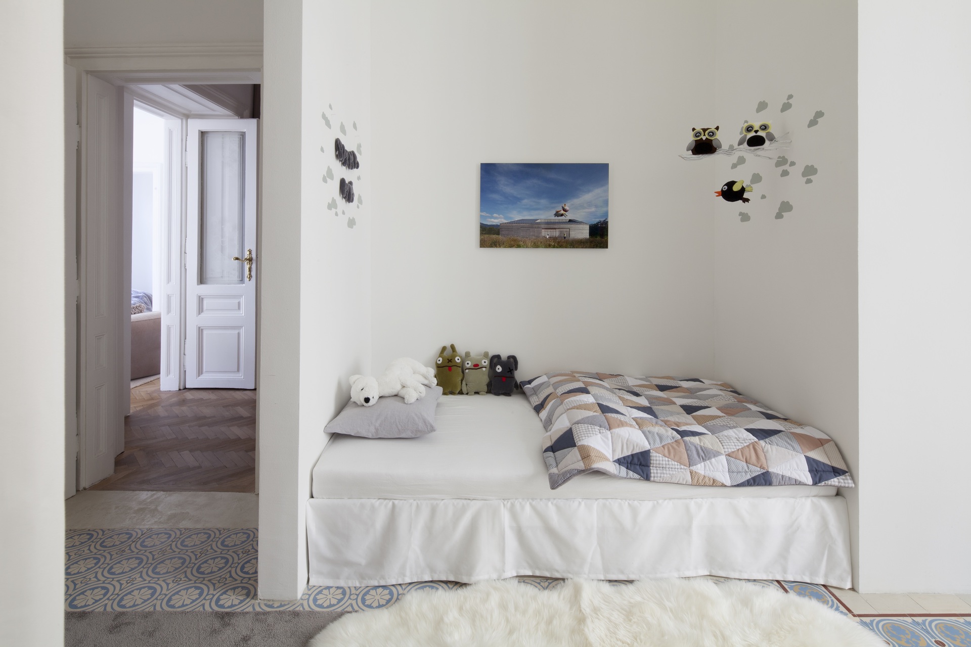 Die Restaurierung bzw. Freilegung von originalen Zementfliesen in Kinderzimmer und Teilen des Schlafzimmers setzt farbige Akzente im ansonsten in schlichten, hellen Farbtönen gehaltenen Konzept.