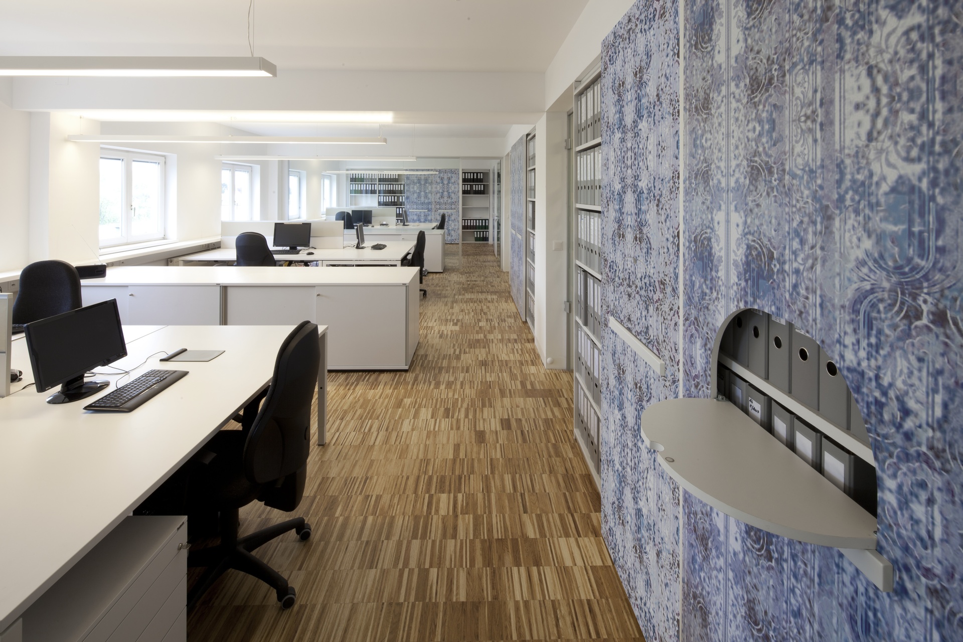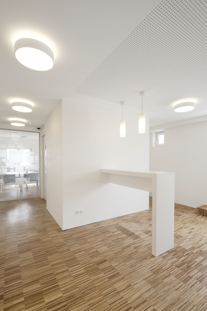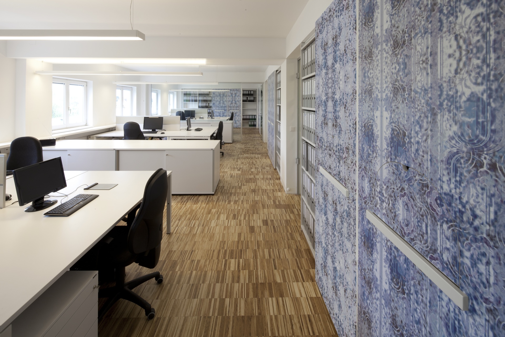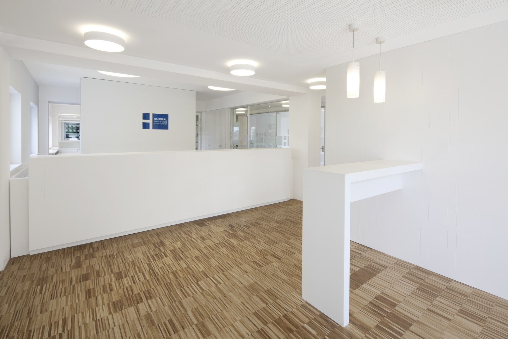 So wurden großflächige Panele als Schiebetüren ausgeführt, die speziell entwickelte grafische Muster zieren, welche aus der Überlagerung verschiedener Tapetenmuster aus unterschiedlichsten Epochen entstehen. Diese Gestaltungsidee verweist auf den Arbeitsprozess beim Renovieren von Wohnungen. Weiters wurde das Quadrat aus dem Logo als Folierung auf den Glasflächen der Trennwände variiert, sowie als feine Linienstruktur in diverse Möbel, wie zB. dem Pult eingefräst. Zur Realisierung des Projekts wurde das gesamte oberste Stockwerk des Gebäudes mit seinem Bestand aus den 80er Jahren entkernt und mit neuer Raumaufteilung wiederhergestellt. (Text: Architekten)