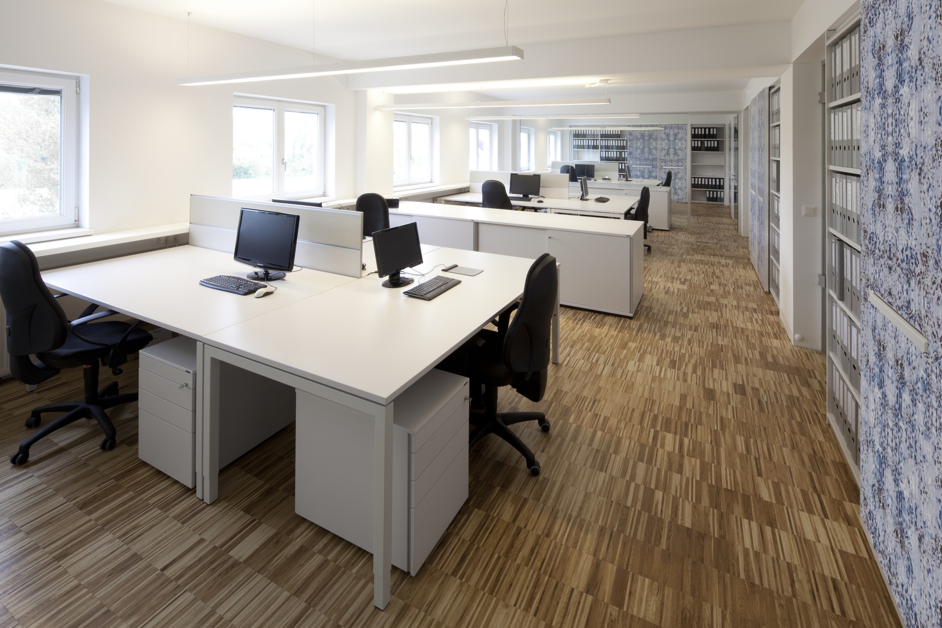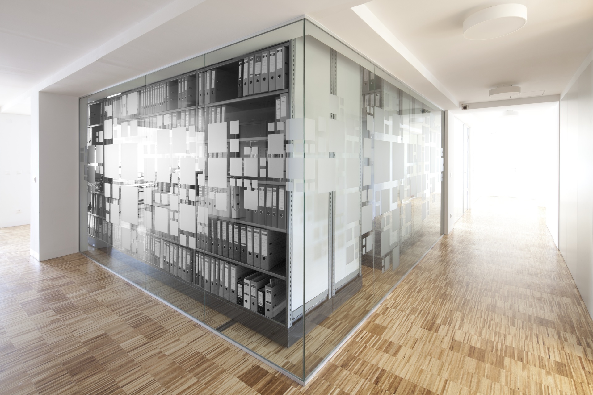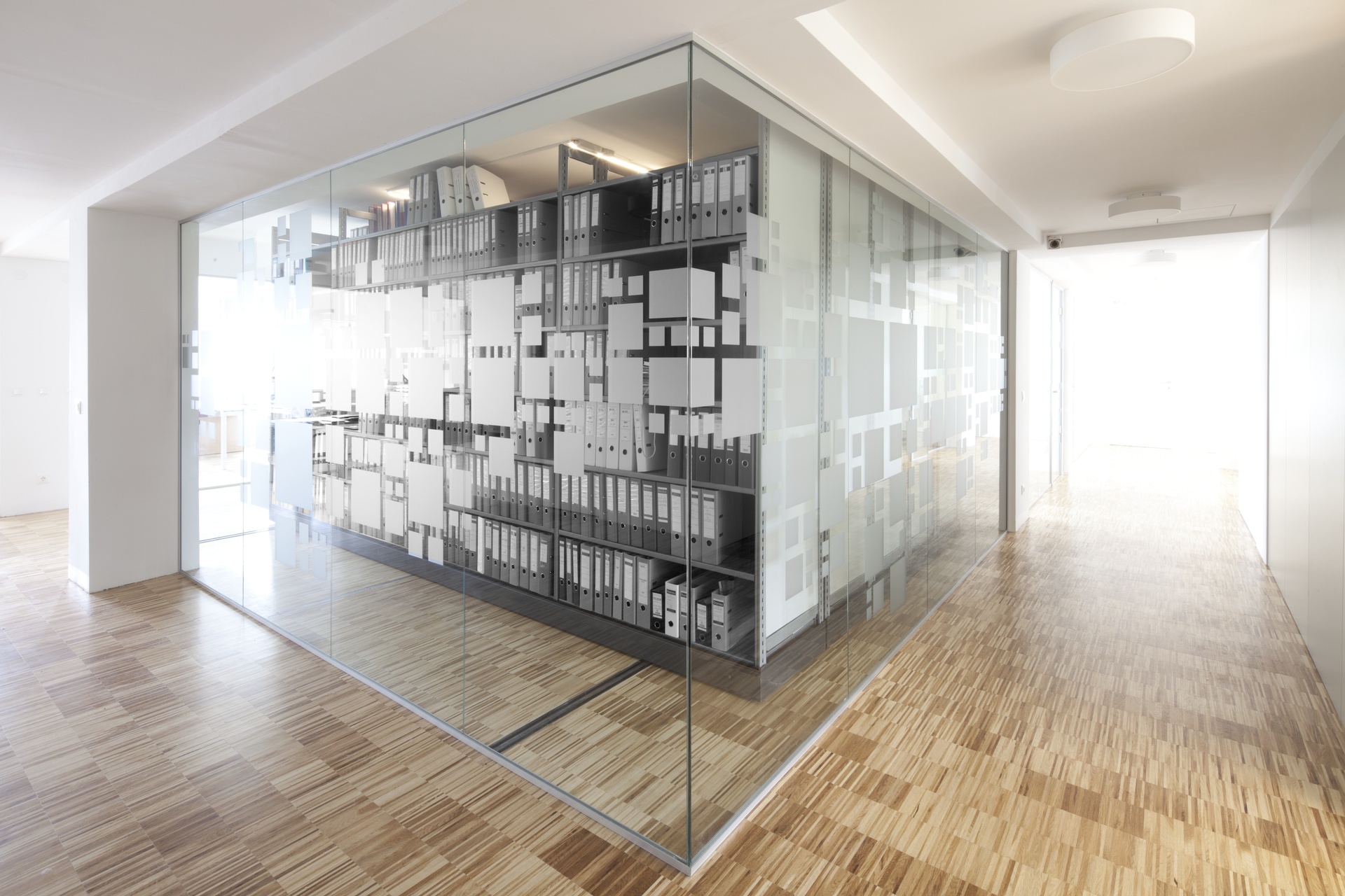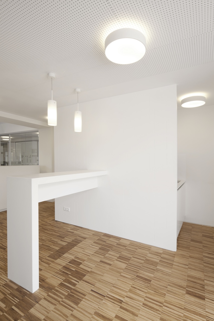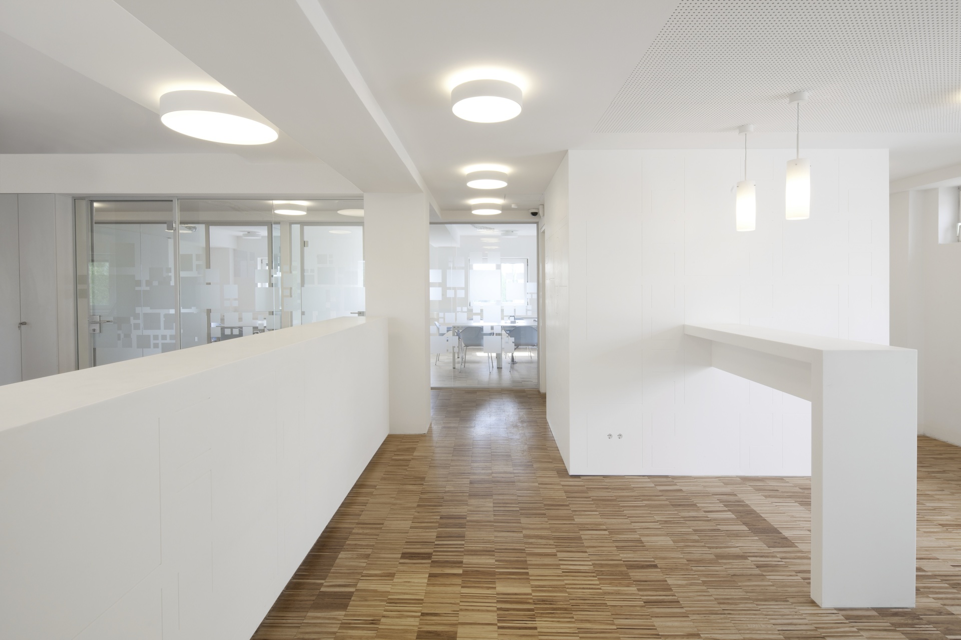 So wurden großflächige Panele als Schiebetüren ausgeführt, die speziell entwickelte grafische Muster zieren, welche aus der Überlagerung verschiedener Tapetenmuster aus unterschiedlichsten Epochen entstehen. Diese Gestaltungsidee verweist auf den Arbeitsprozess beim Renovieren von Wohnungen. Weiters wurde das Quadrat aus dem Logo als Folierung auf den Glasflächen der Trennwände variiert, sowie als feine Linienstruktur in diverse Möbel, wie zB. dem Pult eingefräst. Zur Realisierung des Projekts wurde das gesamte oberste Stockwerk des Gebäudes mit seinem Bestand aus den 80er Jahren entkernt und mit neuer Raumaufteilung wiederhergestellt. (Text: Architekten)