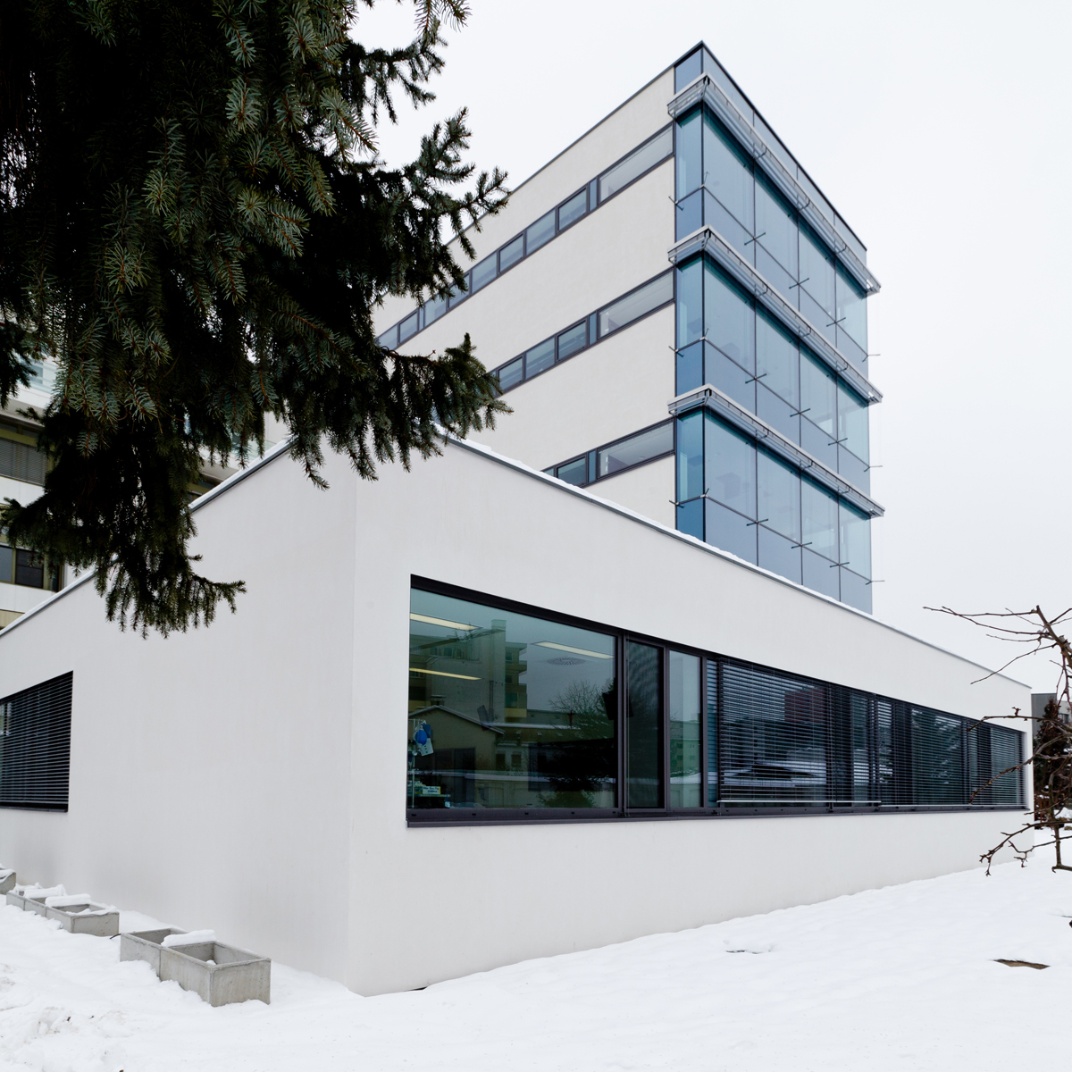 Ziel des Entwurfs war es, eine zeitgemäße Gebäudegestaltung als unaufdringliche Fortschreibung des in mehreren Etappen entstandenen Bestandsgebäudes zu schaffen. Auch im Inneren wird diese Haltung deutlich, wo warme Töne ohne allzu starke Kontraste Wohnlichkeit vermitteln und hochwertige Oberflächen Zeitlosigkeit erzeugen.