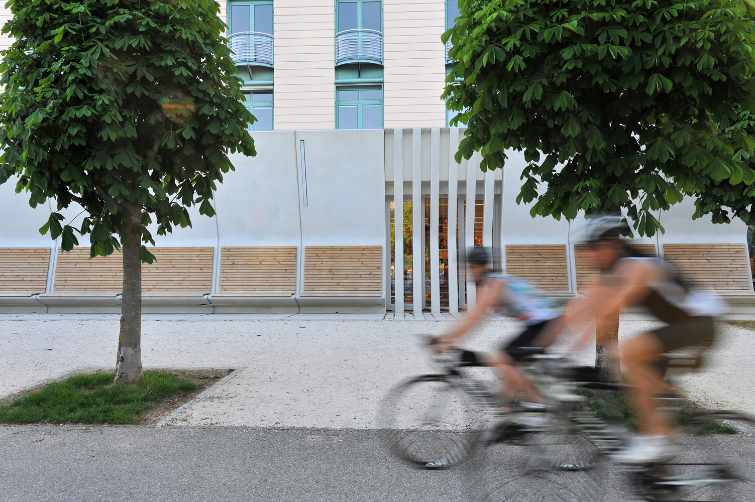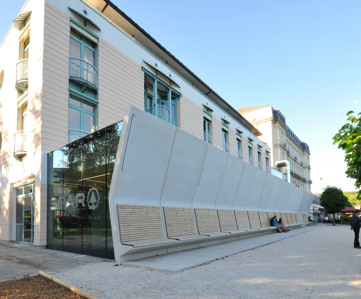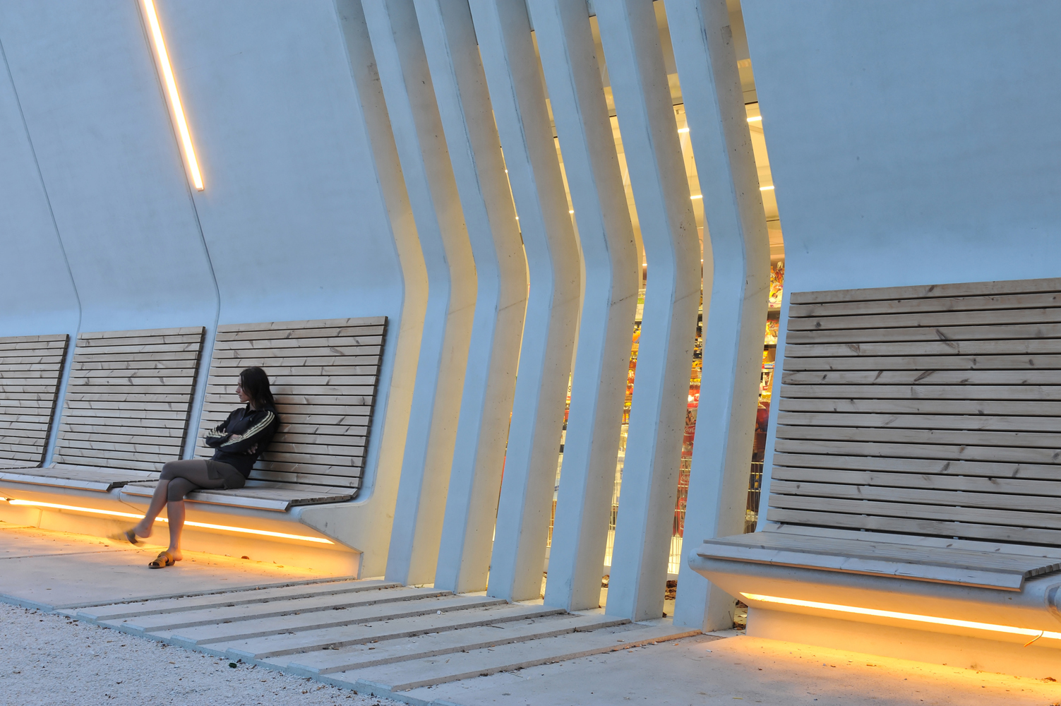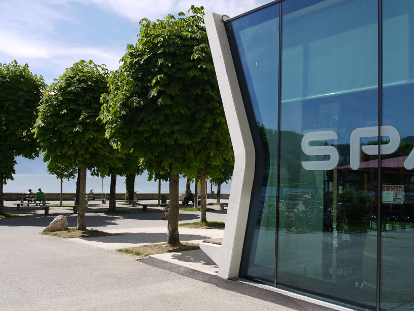 Der Spar-Markt am Ufer des Traunsees, im Zentrum von Gmunden soll vergrößert werden. Der Spar-Markt im Erdgeschoss des Hotel Esplanade wird um ca. 5 m in RichtungTtraunsee erweitert. Die Erweiterungsflächen des Spar-Marktes entstehen eigentlich durch eine Neugestaltung des öffentlichen Raumes. Ein Stadtmöbel in Form einer „Sonnenbank“ bietet eine neue Attraktion für die Passanten an der Esplanade. Auf dieser Bank kann das Seepanorama, das Sonnen genossen werden - sowie „Bespielungen“ aller art stattfinden. Die leicht geknickte Form des Stadtmöbels wirkt beschützend und erinnert entfernt an eine Laube. Die Sitzauflagen aus Holz sollen speziell in der Übergangszeit für guten Sitzkomfort dienen. Das Stadtmöbel wird aus Fertigteilen in Architekturbeton hergestellt. Dieses hochwertige Material mit steincharakteristik sorgt für dauerhafte Eleganz. Eine indirekte Beleuchtung unter der Sitzfläche erhellt den Vorbereich und gibt dem Stadtmöbel bei Dunkelheit besondere Qualität.Hinter dieser, als Stadtmöbel ausgeführten Wand, liegen die Erweiterungsflächen von Spar. Eine transparente Glasfassade schließt die neuen Verkaufsflächen seitlich ab. Das alte Gebäude bleibt dadurch in seiner Kontur erlebbar und umgekehrt ist das Innere hier von außen sichtbar. Die Dachfläche des Zubaus wird extensiv mit grünem Pflanzgranulat begrünt. (Text: Architekten)