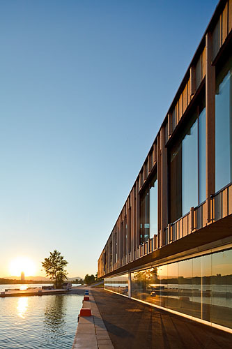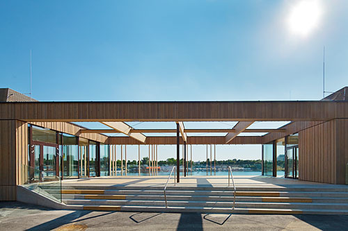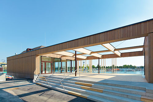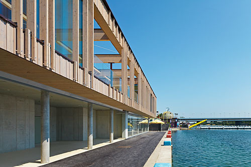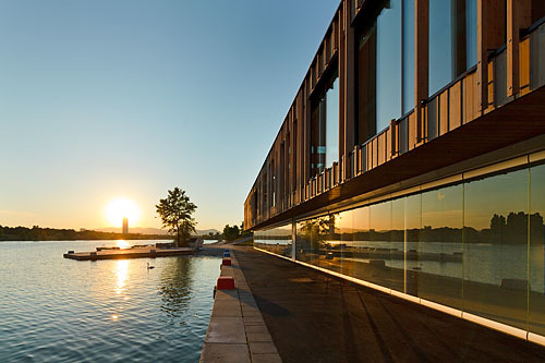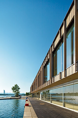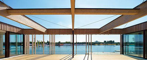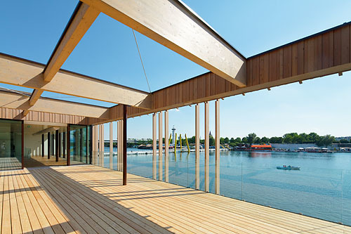 Die Stahlrahmenkonstruktion des Obergeschosses ist mit vorgefertigten Holztafel-Elementen und KHL-Platten ausgefacht und mit einer hinterlüfteten Schalung aus Lärchenholz umschlossen. Sägeraue Holzlamellen verkleiden die Haustechnikaufbauten am Dach. Der Holz-Leichtbau sitzt auf der Erdgeschosszone und bildet mit seinen filigranen Holzlamellen und Panoramafenstern einen starken Kontrast zum soliden Sockel, der allen Hochwasserereignissen trotzen muss.