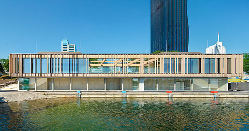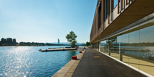 Der Pavillon umfasst zwei Ebenen, von denen die obere auf der Wasserseite auskragt. Der Besucher betritt das Gebäude über die zentrale Terrasse und wird von hier aus zu den beiden seitlich situierten Gastronomie-Einrichtungen weitergeleitet. Die wasserseitigen Fronten der Restaurants bieten durch ihre großzügige Verglasung eine eindrucksvolle Panoramasicht auf die Neue Donau.