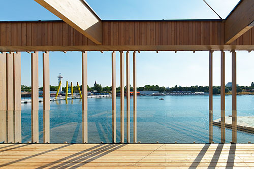 Die Erdgeschoss-Ebene dient als schattiger, wettergeschützter Freiraum, erweitert durch die vorgelagerten Terrassen und mit direkter Verbindung zum Wasser. Die zu erwartenden Überflutungen wurden als Element des besonderen Standortes bewusst in das Gestaltungskonzept integriert. Die untere Ebene liegt über dem Wasserspiegel, wird aber bei Hochwasserereignissen geflutet. Der glatte Kubus ist weitgehend ohne Nischen und Fugen ausgebildet, um Aufräumarbeiten nach Hochwasserereignissen zusätzlich zu erleichtern. Die Konstruktion besteht aus dreiseitig angeordneten massiven Umfassungswänden und einer aufgelagerten Stahlbetondecke. Die Öffnungen zu den rückwärtigen Sanitärbereichen im Erdgeschoss sind mit wasserdichten Schließeinrichtungen ausgestattet. Alle übrigen technischen Einrichtungen und die Gastronomieküche sind in der oberen Ebene angeordnet.