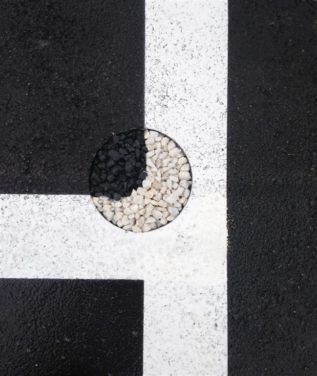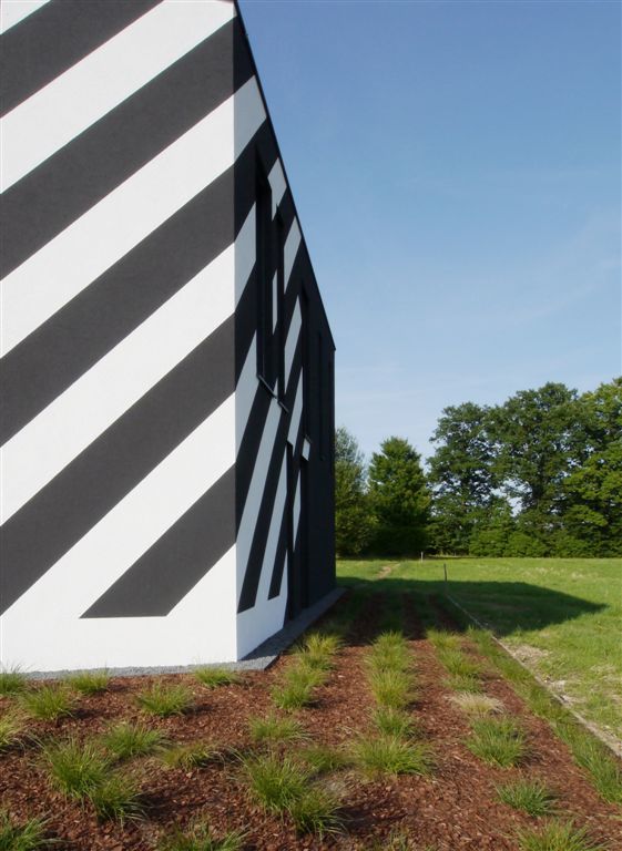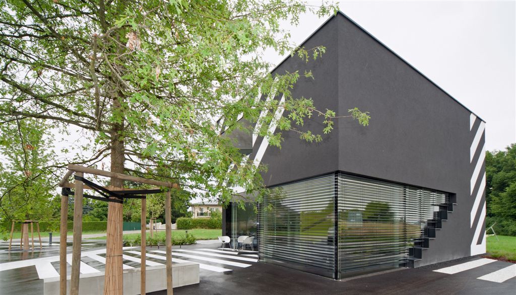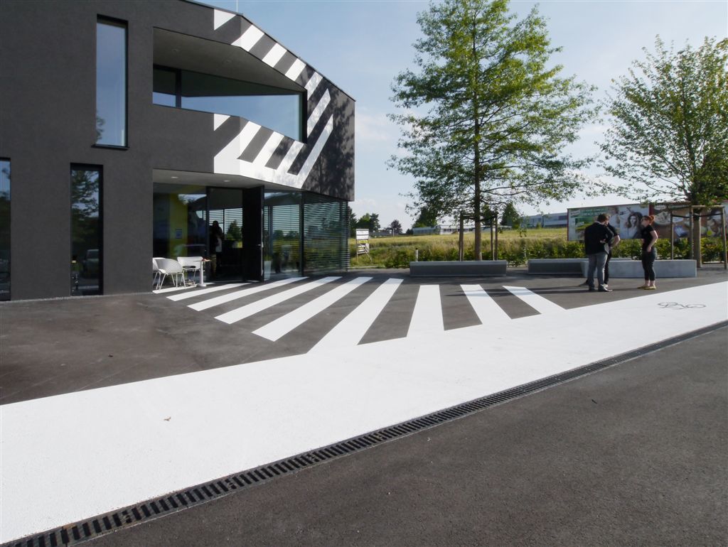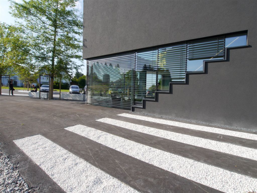 Die Freiraumgestaltung und das äußere Erscheinungsbild des im Grundriss polygonalen, zweigeschoßigen Baukörpers bilden eine monolithische Einheit. Die an der Süd- und Westseite an das Gebäude anschließende Asphaltfläche zieht sich in Form eines asphaltgrauen Putzes übers gesamte Haus und nimmt dabei die grafisch abstrahierten, weißen Bodenmarkierungen mit. Die schmalen, raumhohen Fenster sitzen locker in den Fassaden verstreut.