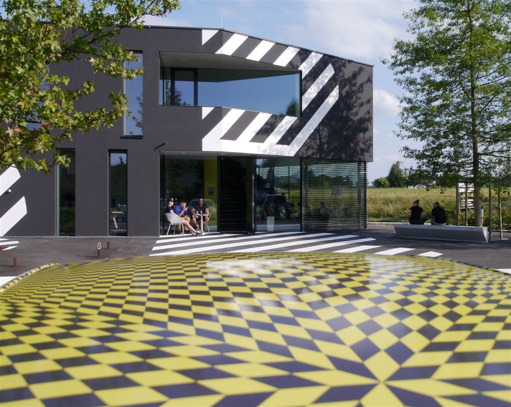 Das Entwurfskonzept geht also von einem Bauplatz aus, der als erweiterter Bestandteil des Straßennetzes mit Asphalt überzogen ist, aus dem sich die geforderte Baumasse rausdrückt bzw. hochzieht und folgerichtig mit einer asphaltgrauen Oberfläche, samt weißer Straßenmarkierungen überzogen in Erscheinung tritt. Die daraus resultierende, sehr stark grafische Erscheinung des Gebäudes wurde in weiterer Folge zum Leitfaden für das gesamte „Corporate Design“ des Unternehmens. Vom Firmenlogo bis hin zu den Beklebungen der Fahrschulautos findet diese Architekturkonzeption seine logische und überaus konsequente Fortführung und führt zu einem sehr eindeutigen Gesamterscheinungsbild der Fahrschule.