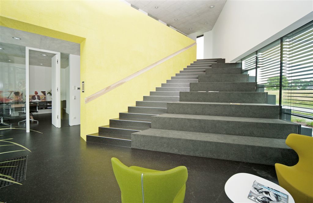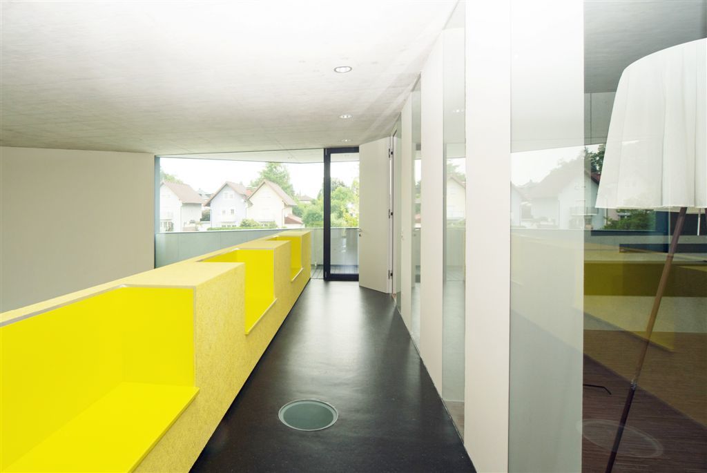 Diese zweigeschossige Erschließungszone wird begleitet von einen mit CI-Gelb gestrichenen, „Hera-Design-Platten“ belegten Verbau der im Obergeschoß als Brüstung dient und drei Sitznischen im Gangbereich eingeschnitten hat. Dieses Möbel ist von allen Aufenthaltsbereichen aus zumindest ausschnittsweise zu sehen und bildet somit zugleich ein räumlich, wie gestalterisch verbindendes Element. Gemeinsam mit den Sichtbetondecken, den weißen Wänden und dem schwarzen Linoleumboden bzw. den Holzböden in Vortrags- und Besprechungsraum bildet es das klare und reduzierte Oberflächenkonzept des gesamten Hauses.
