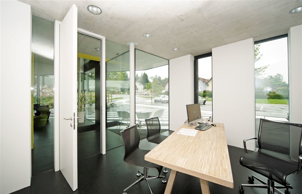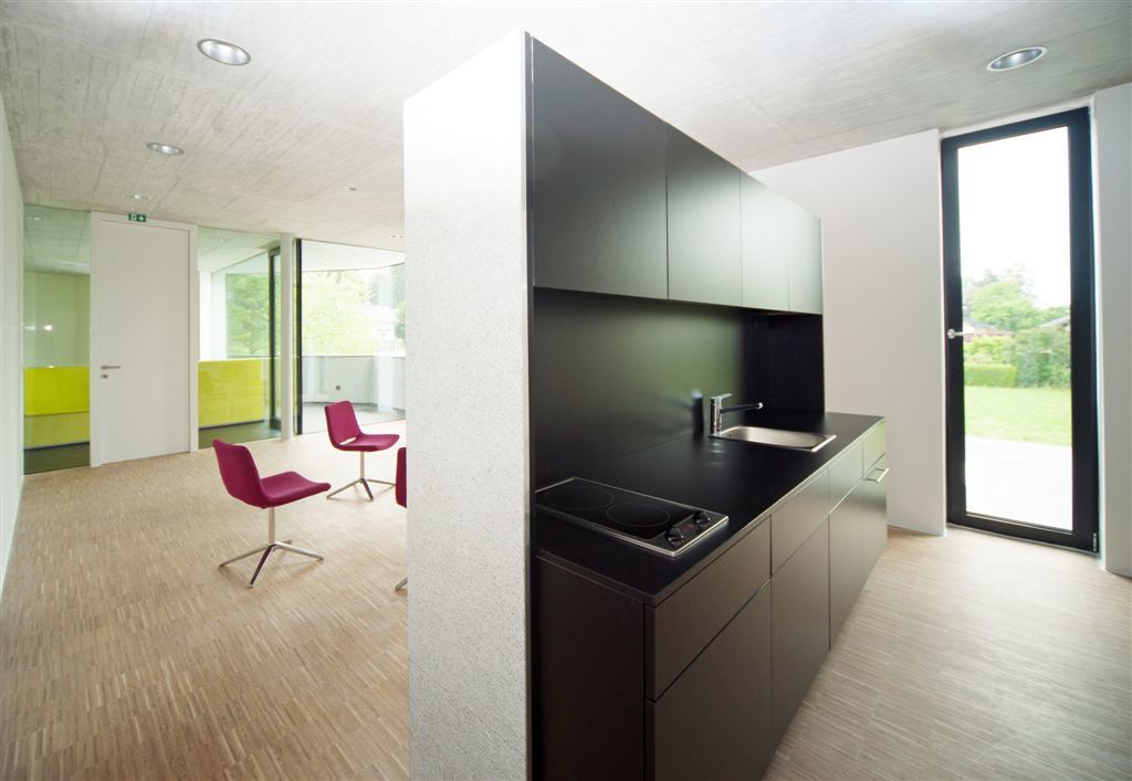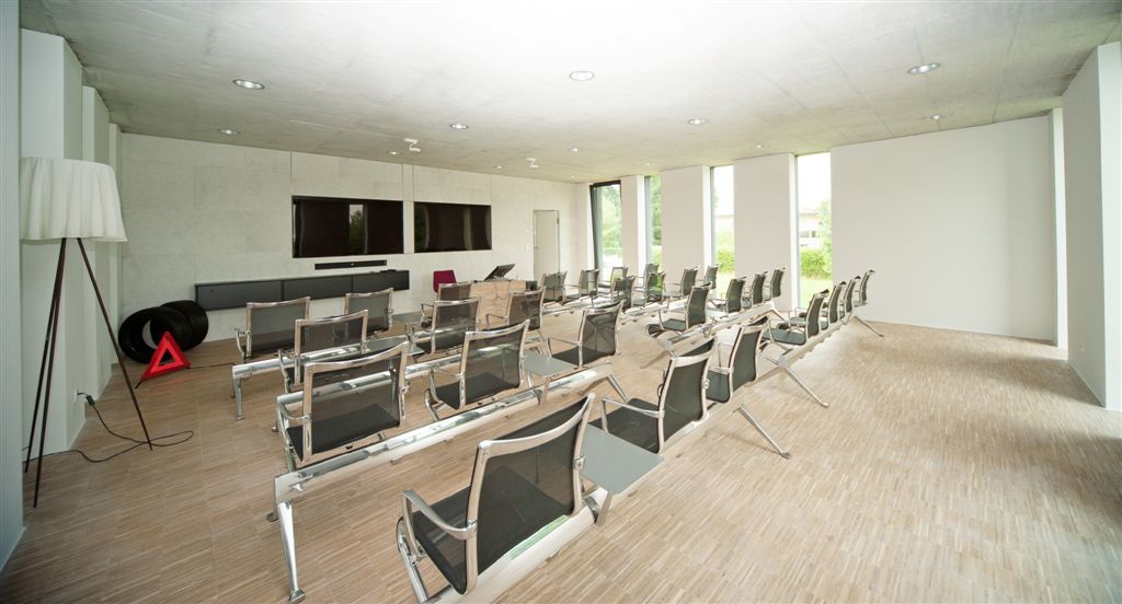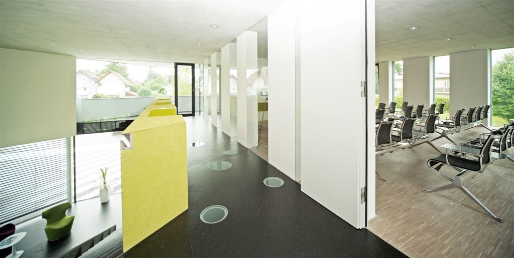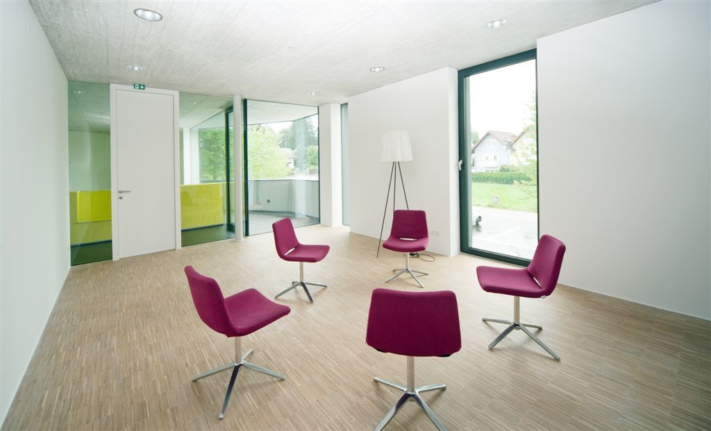 Im Obergeschoß gelangt man direkt von der Treppe in den Vortragsraum der über raumhohe Innenverglasungen, die das Fassadenöffnungsbild in Inneren wiederspiegeln, visuelle Kommunikation zum Gangbereich hin ermöglicht. Die vollflächig mit „Hera-Design-Platten“ belegte Wand im Rücken des Vortragenden dient zum Einen der Schallabsorption und zum Anderen sind darin zwei große, bündig versenkte Präsentationsbildschirme eingebaut. Über eine ebenso bündig eingebaute Tapetentür gelangt man direkt in eine Teeküche die nur durch eine kleine, freistehende Miniküchenzeile vom Besprechungsraum getrennt ist. Dieser öffnet sich wiederrum durch raumhohe Verglasungen hin zum galeriearten Gang bzw. zur eingeschnittenen Loggia, die zum Frischluftschnappen oder eben zur kleinen Rauchpause Platz bietet.