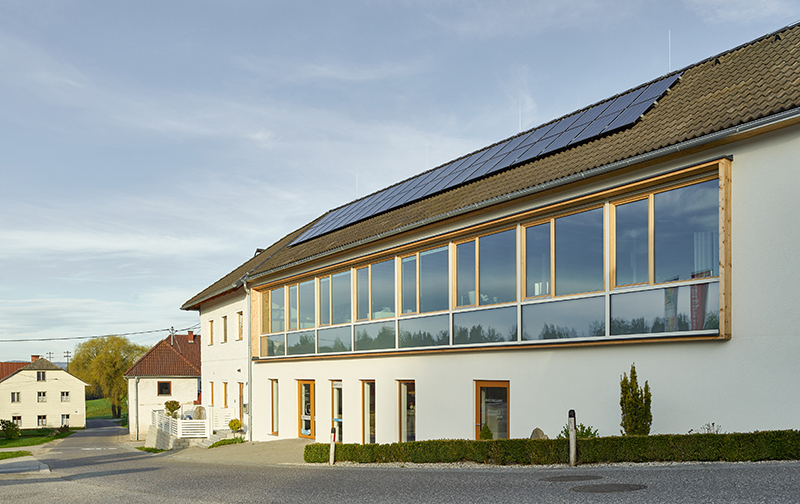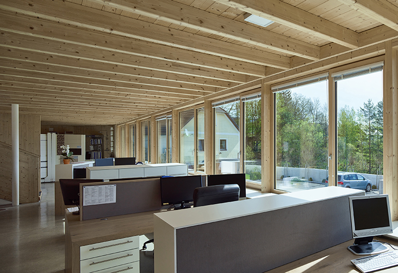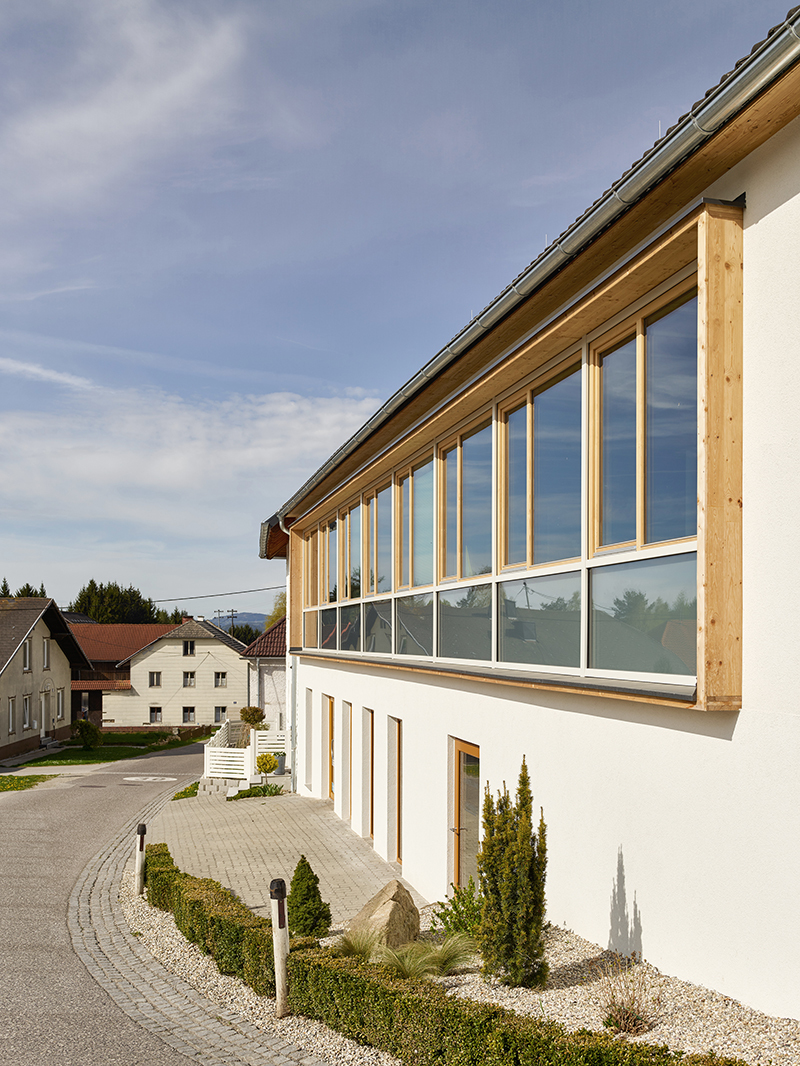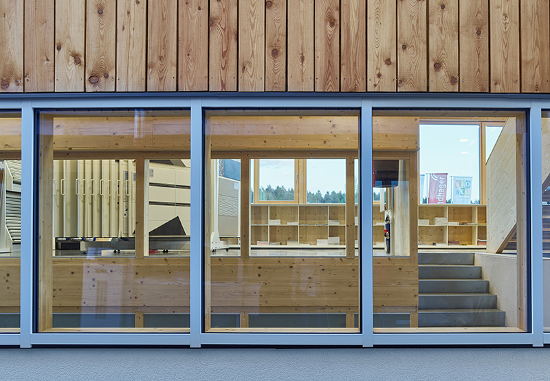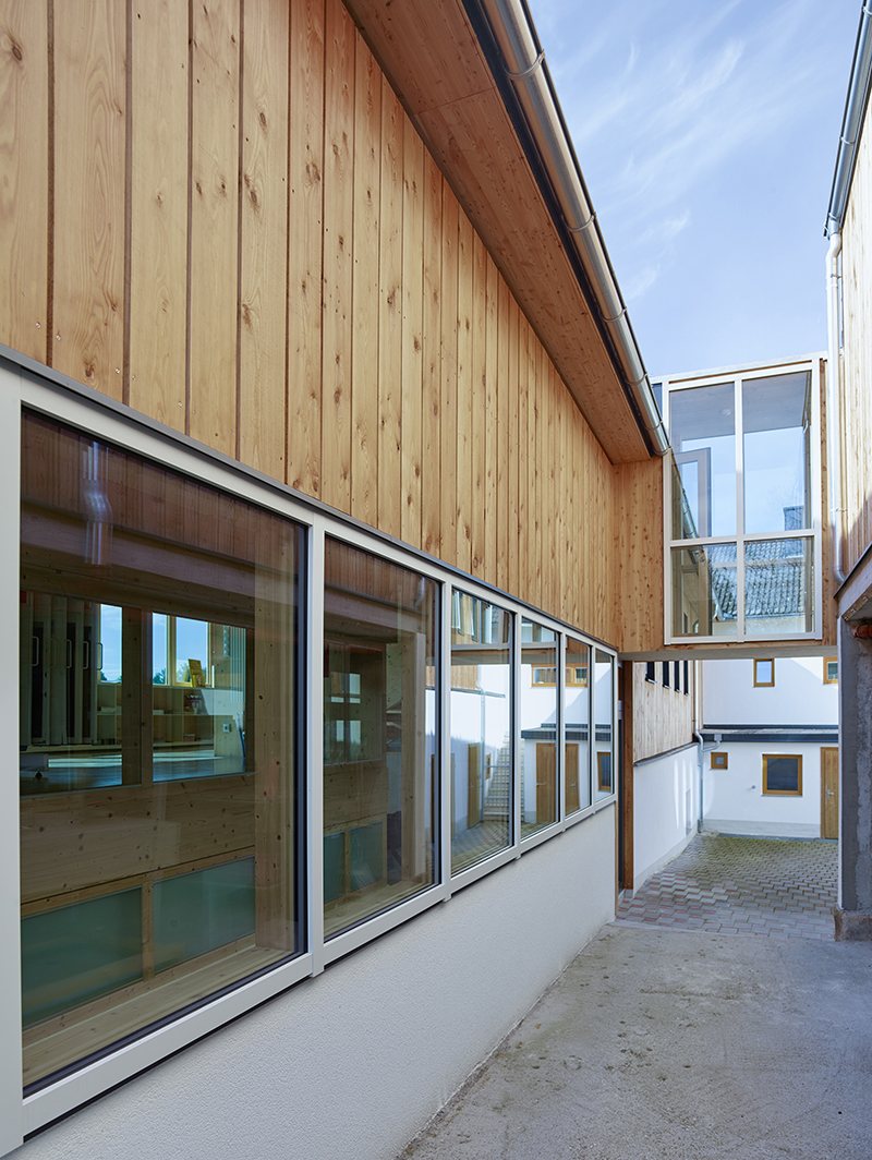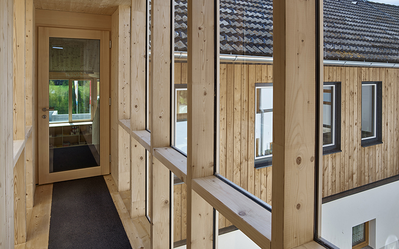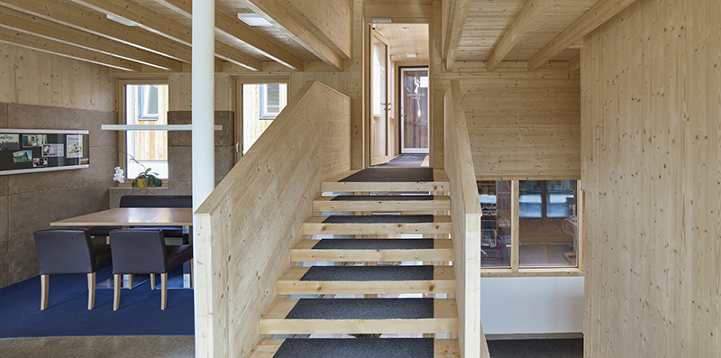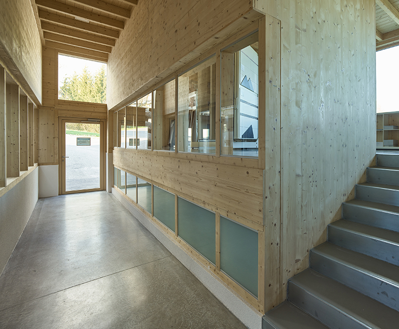 Die gesamten Aufbauten (Tragstruktur, tragende Wände, Dachkonstruktion, Verbindungsstege und Stiegen etc.) wurden unter Einbindung lokaler Firmen in Holzbauweise errichtet und auch zum Großteil sichtbar belassen. Die traditionell bäuerliche Bauweise - Holzbau auf massivem Sockel - konnte hier auf eine neue Art interpretiert werden.