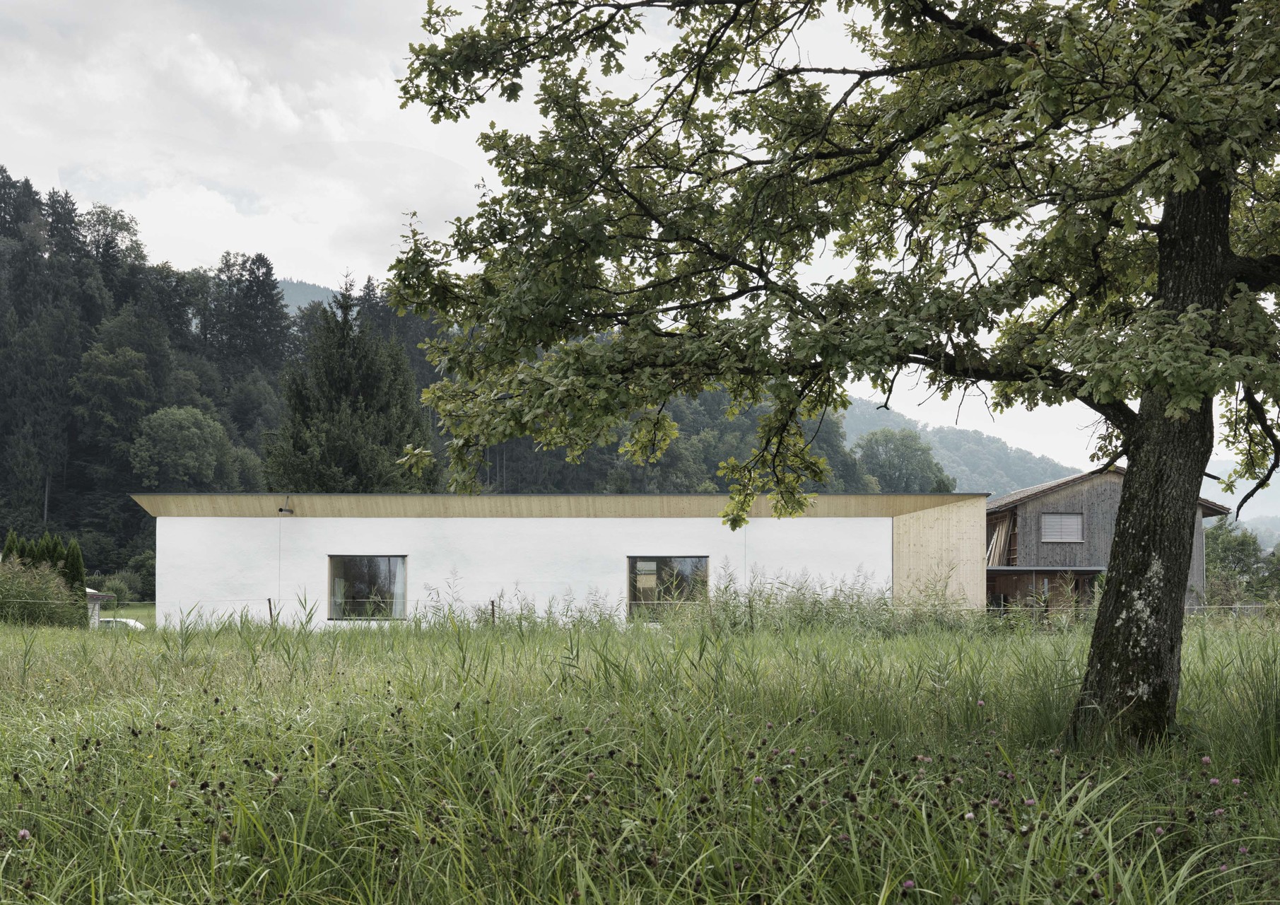 Das Gebäude macht sich die sich im Jahresverlauf ändernden Sonneneinstrahlungswinkel zu Nutze. Die Konstruktionshöhe und die Form des Daches unterstützen die ideale Wärmeeinstrahlung – die tiefe, nach innen geneigte Laibung des Vordachs dient im Sommer als Schattenspender und nutzt die flach stehende Sonne im Winter als zusätzliche Wärmequelle.