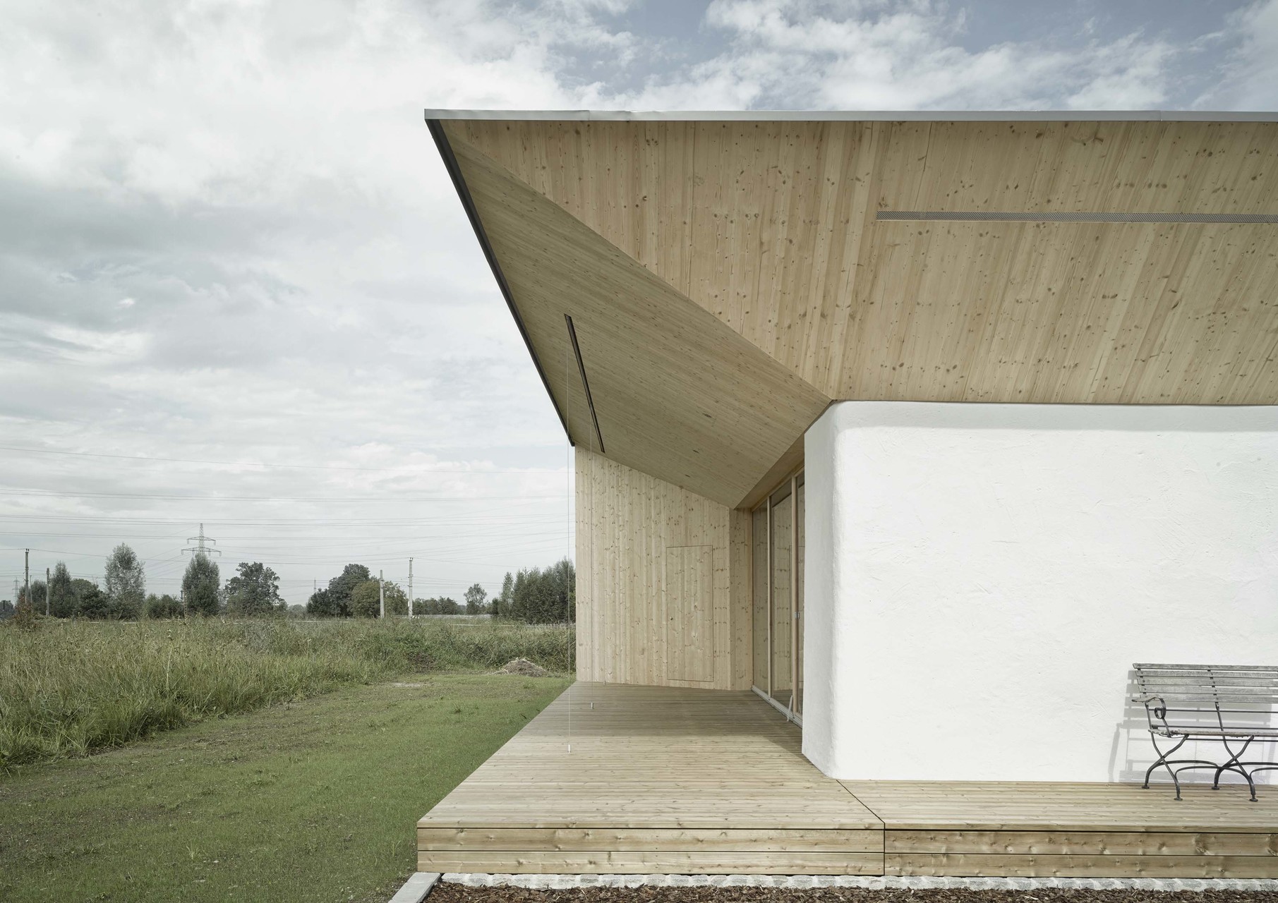 Stroh kommt bei diesem Wohnhaus nicht nur als ökologisches Dämmmaterial zum Einsatz. Übereinandergestapelte Strohballen bilden außerdem die vollständige Tragkonstruktion. Die bis zu 1,20 Meter dicken Strohwände sind außen mit Kalk und innen mit Lehm verputzt. Somit ist der gesamte Wandaufbau kompostierbar. Auf den lastabtragenden Strohwänden liegt die Dachkonstruktion aus Holz, welche mit Stroh gedämmt ist. In die massiven Außenwände sind tiefe Öffnungen eingeschnitten, die heimelige Nischen zum Verweilen schaffen.