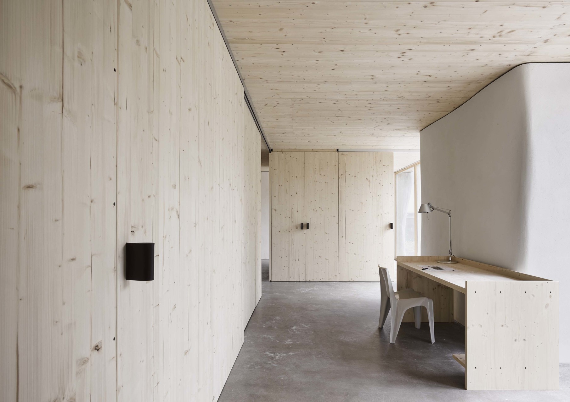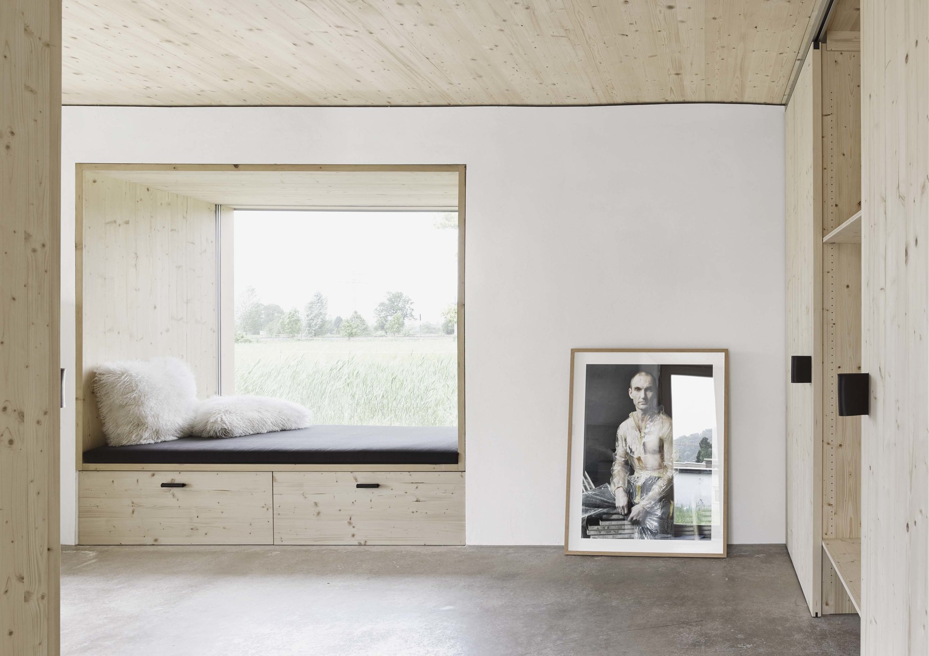 Aufgrund der idealen Dämmwirkung der massigen Strohwände konnte die Haustechnik auf ein absolutes Minimum reduziert werden. Ein einfacher Kachelofen dient der Beheizung der gesamten Fläche des nachhaltig produzierten Hauses. Der Fußboden ist im Verbund mit der Bodenplatte hergestellt, um eine große Speichermasse zu erhalten, die tagsüber Wärme aufnimmt und abends abgibt. (Text: Julia Ess nach einem Text des Architekten)