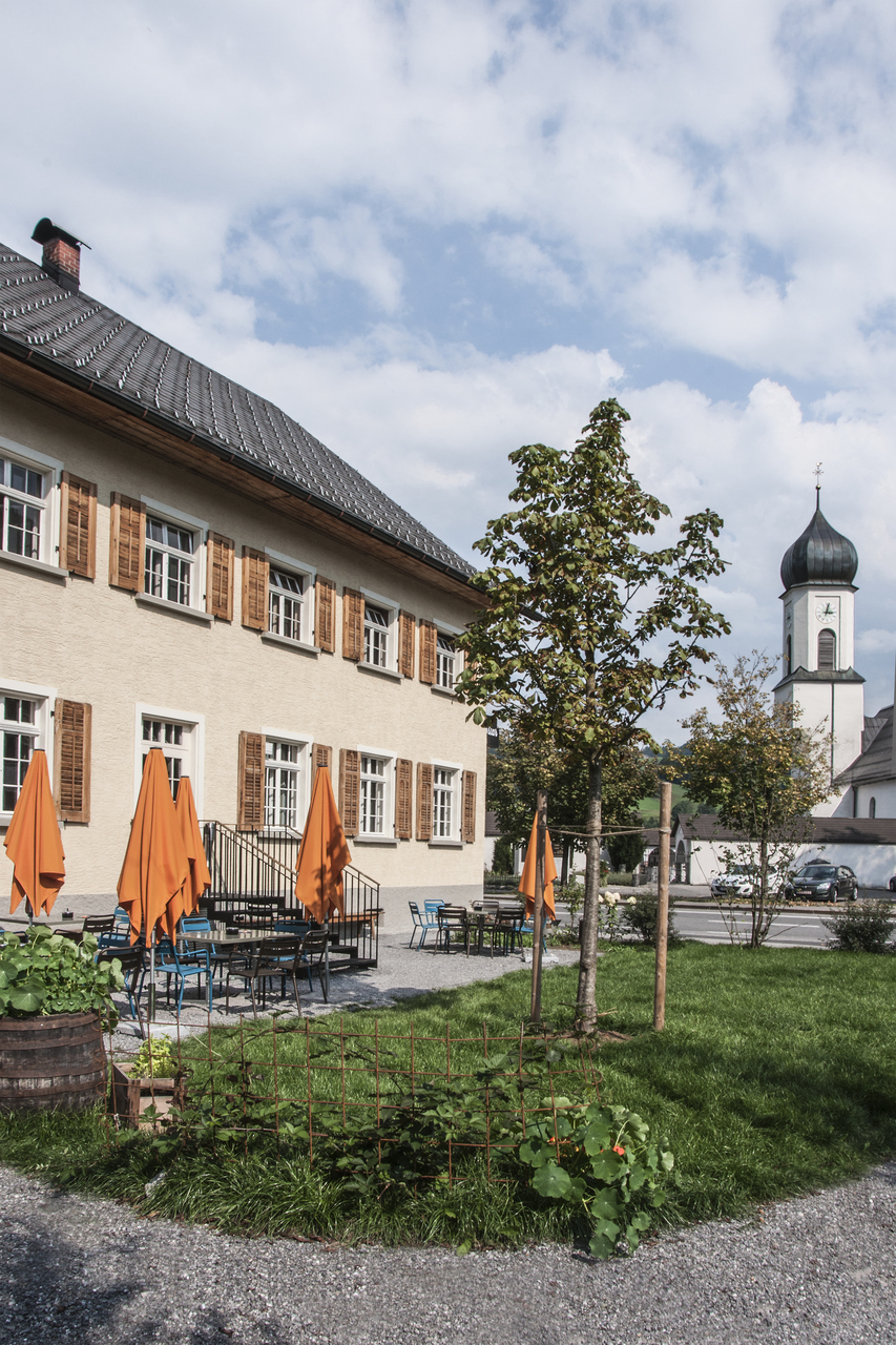 Die markante Fassade in streng symmetrischer Fensterordnung mit dem vorgesetzten, zweiseitigen Treppenpodest wurde lediglich gereinigt. Die feingliedrigen Holzkastenfenster wurden saniert, der südseitige Gastgarten wieder aktiviert und mit einer dezenten Stahltreppe mit dem Gastraum verbunden.