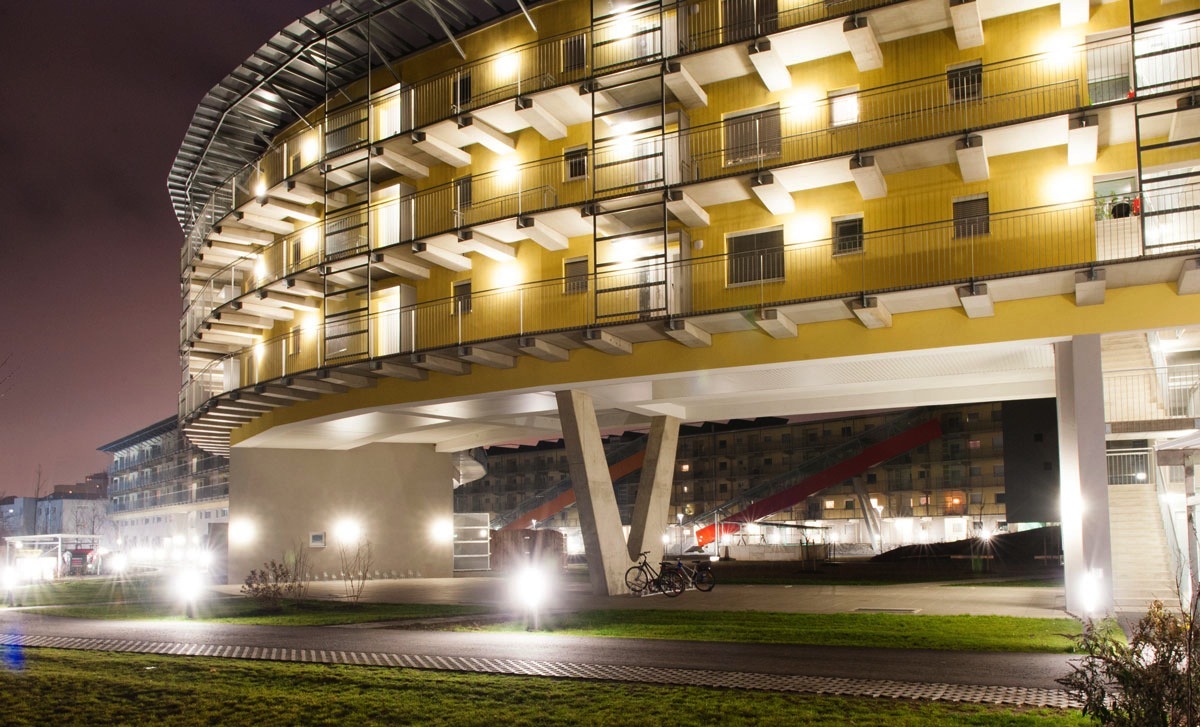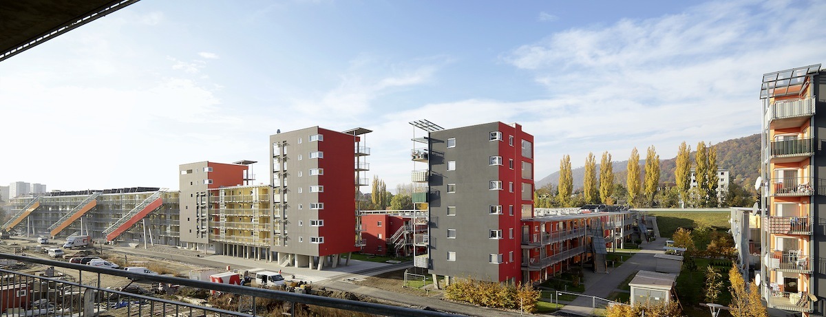 Nussmüller Architekten entwarfen einen durchgängigen, sich zentral aufweitenden Grünraum entlang der ÖV-Trasse, gleichzeitig der Stadt als auch dem Wohnbau zugehörig. Eine die Trasse begleitende Rad- und Fußwegeverbindung sollte ebenfalls realisiert werden. Im Osten wird dieser Raum durch einen langen geschwungenen fünfgeschoßigen Baukörper definiert, dessen Wohnungen zu diesem orientiert sind. Großzügige Durchgänge über zwei Geschoße durchbrechen den Riegel und gewährleisten Offenheit. Während die zentrale Achse im Südwesten noch von einem länglichen Baukörper begleitet wird, löst sich dieser im Norden in sieben- bis achtgeschoßige Punkthäuser auf. Diese Hochpunkte markieren zugleich jenen Teil, an dem sich das Grundstück bis zur Wienerstraße erstreckt. Die hier angrenzenden Baukörper sind normal zur zentralen Achse ausgerichtet, bis schließlich eine steil ansteigende Wiese das Areal zur Wienerstraße hin abgrenzt. Von der Wienerstraße aus erinnert die Rückseite dieser Rampe durch ihre Betonoberflächen an die Außenansicht einer Stadiontribüne. Darunter befinden sich jedoch überdachte PKW-Abstellplätze und die Einfahrt zur Tiefgarage. Sie funktioniert als Schallschutz gegenüber der Wienerstraße.