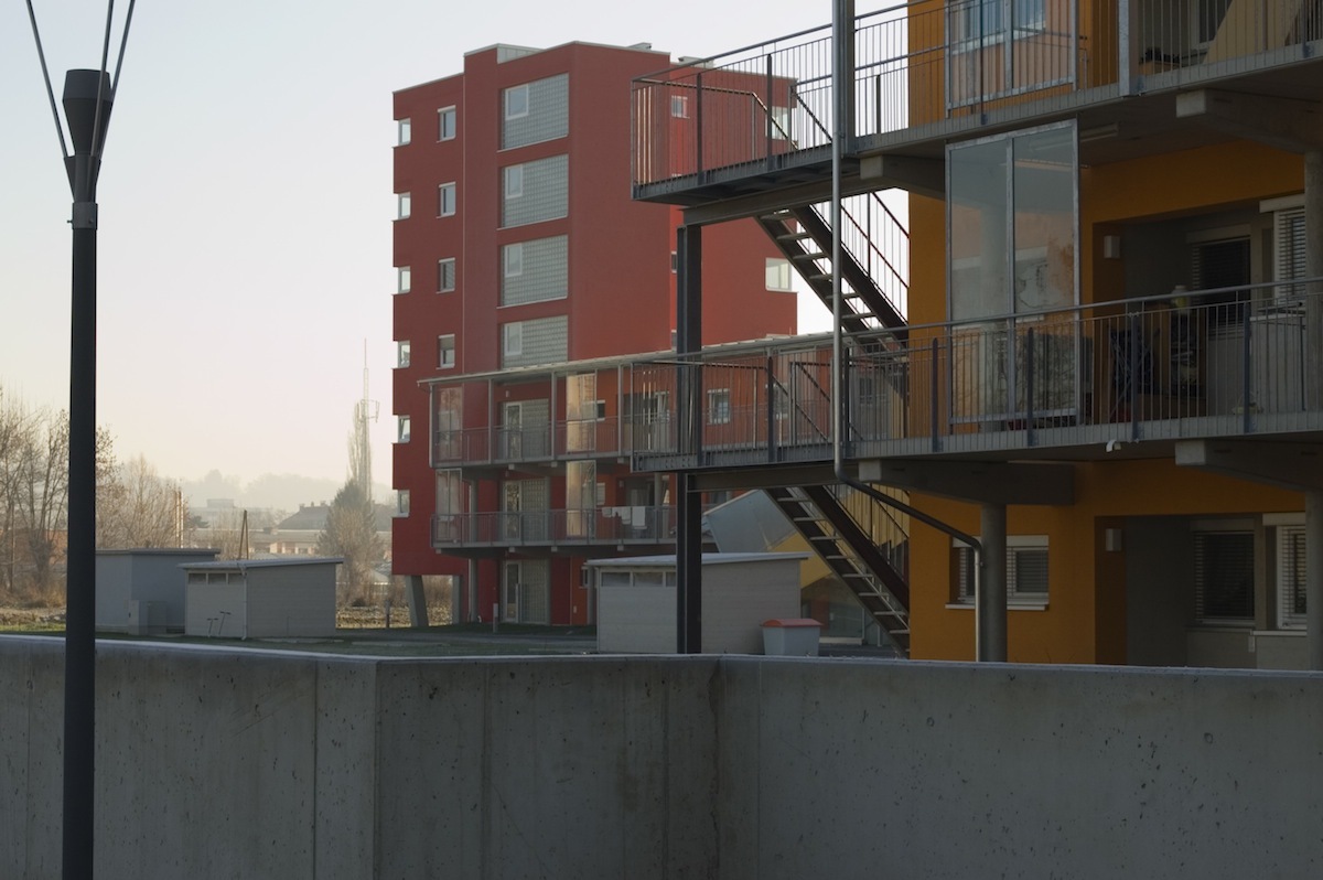 Auch in den Obergeschoßen gewährleisten die abgesetzten Laubengänge im Zusammenspiel mit Eingangsnischen eine sauber definierte Zugangssituation und Kommunikationsraum. Die Balkone gewinnen, ebenfalls mittels Nischen an Tiefe und erweitern damit die querlüftbaren Grundrisse in den Außenraum.