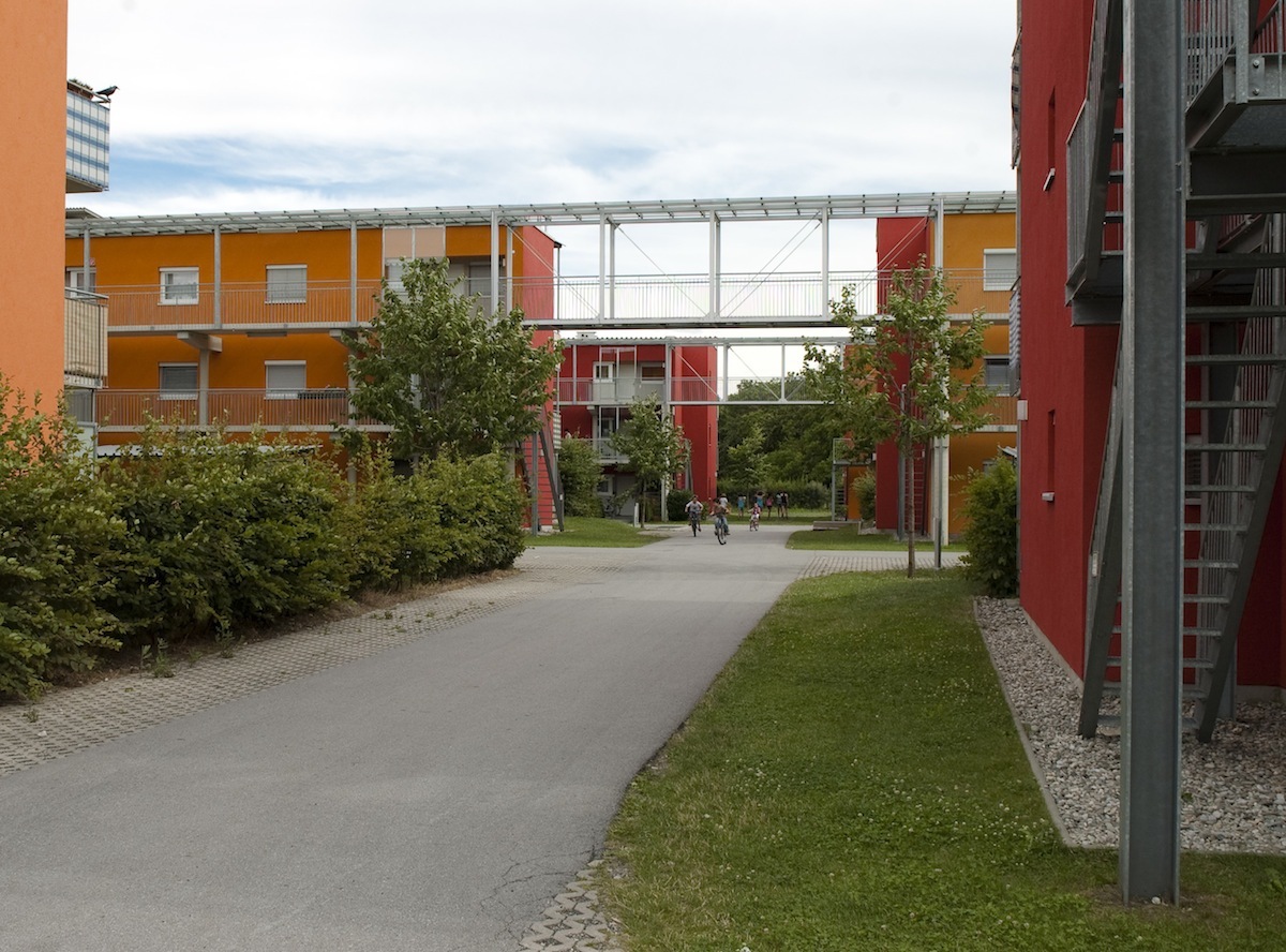 Die einzelnen Baukörper werden mittels Laubengang erschlossen, was zum Erreichen der Barrierefreiheit vorteilhaft ist. Die Treppenaufgänge zu den Laubengängen sind aus deren Achse herausgeschwenkt. Der Übergang zwischen öffentlichen und privaten Bereichen auf Erdgeschoßebene wird dadurch und über Eingangsnischen und Grünflächen definiert. Die Gestaltung dieses Übergangs auf der Wohnseite wird weitestgehend den Bewohner:innen überlassen.