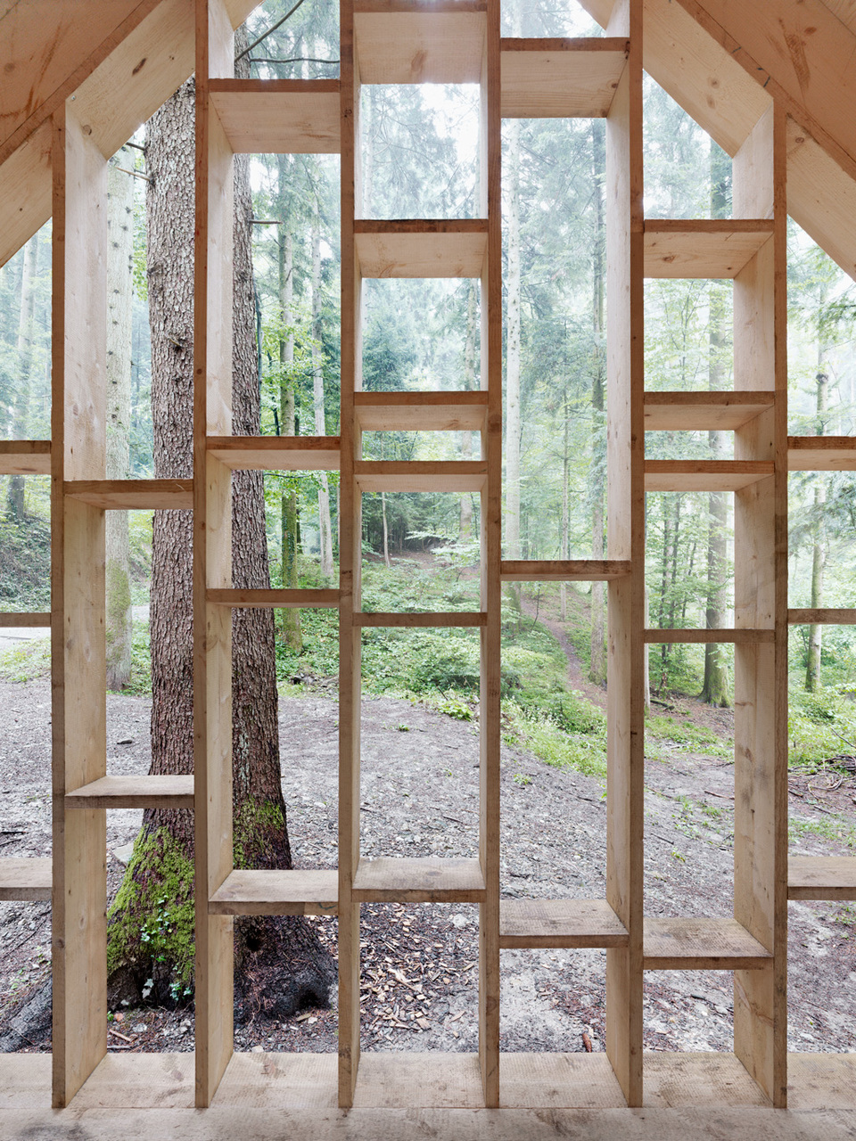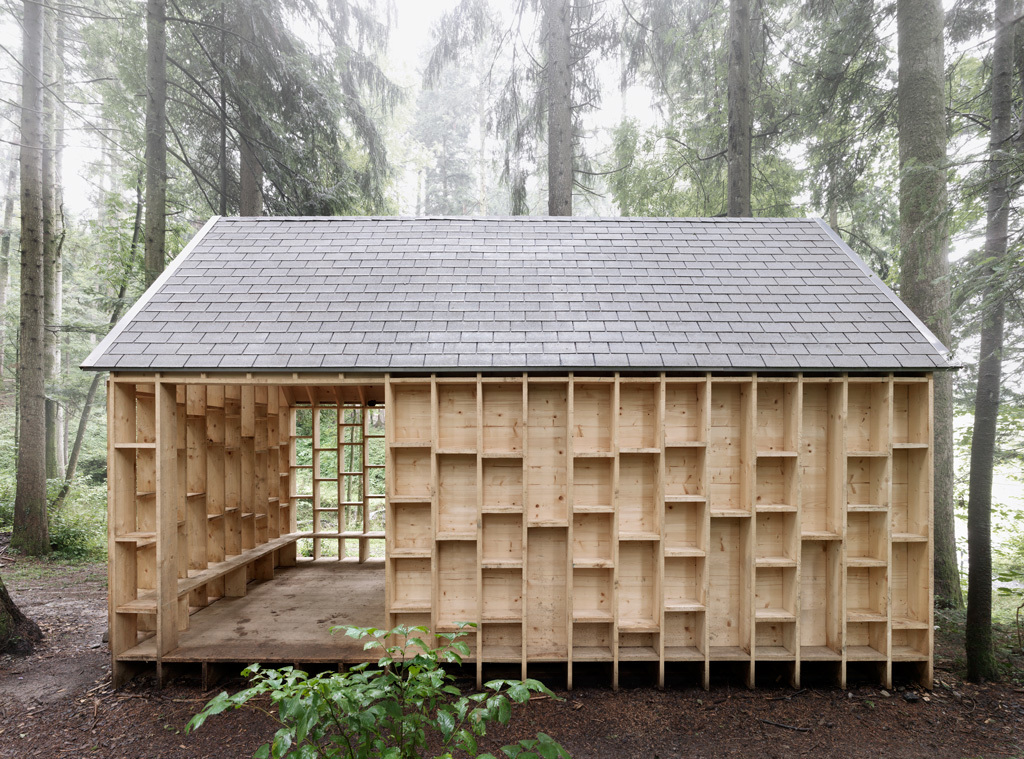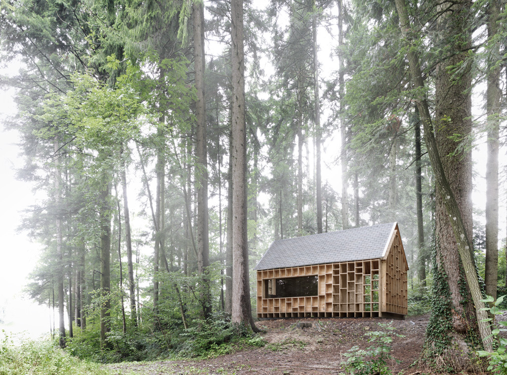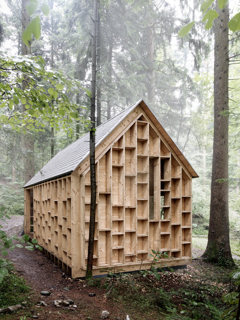 In erster Linie wird der Bau allerdings von außen genutzt. Das Holzhaus wurde deshalb als „Setzkasten“ konzipiert. Die Fassade ist ein umlaufendes Regal, dient als Aufbewahrungsort für Fundstücke, als Insektenhotel oder Futterstelle. Als offene Wandkonstruktion umhüllt es den überdachten Schopfbereich vor dem Schutzraum.
