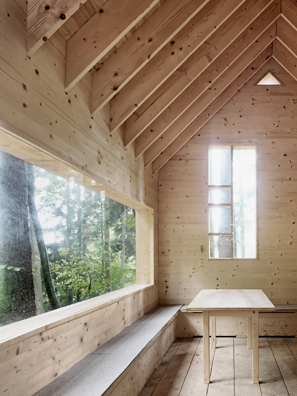 Holz war für dieses Objekt mitten im Wald das naheliegende Material. Ein Kriterium war zudem die Leichtigkeit der Konstruktion: Falls die Gruppe einmal umziehen muss, kann der Bau von den Fundamenten gelöst und an einen neuen Standort übersiedelt werden. Das Haupttragwerk besteht aus umlaufenden Fichte-Massivholzrahmen (30mm, sägerau). Sie sind innen mit einer Nut-Feder-Schalung aus Fichte beplankt. Die Dachschalung wurde mit Bitumenschindeln gedeckt. (Text: Tobias Hagleitner nach einem Text des Architekten)