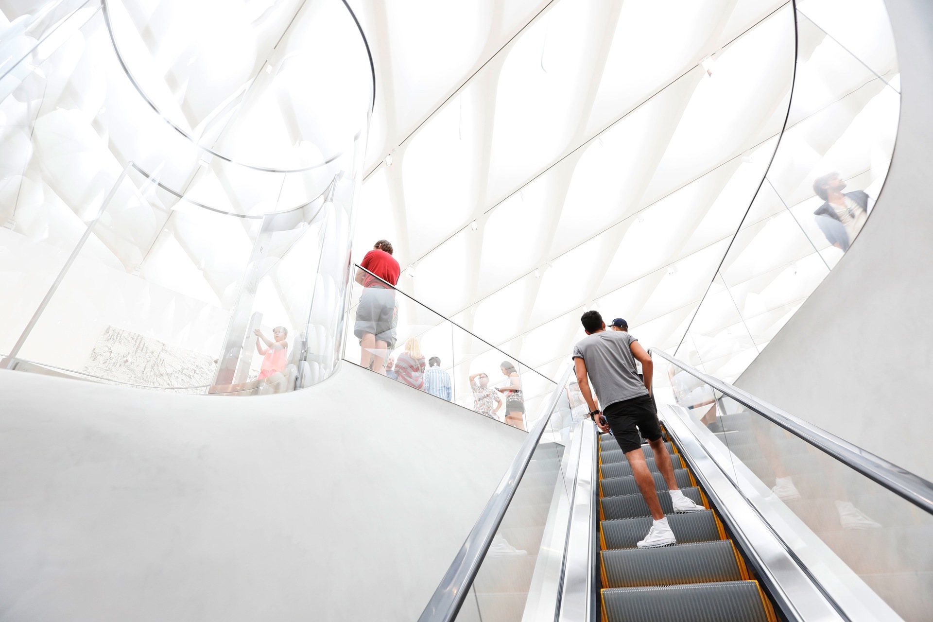 Obwohl die Oberlichter den Waben der Aussenfassade ähnlich sind, erinnert der Gesamteindruck der Räume an das Eli Broad Museum des Los Angeles County Museum (LACMA), das Renzo Piano vor knapp sieben Jahren für dieselbe Sammlung fertiggestellt hat und bei der ebenfalls eine Rolltreppe ins Obergeschoss führt. Bei Diller Scofidio Renfro, die mit der lokalen Firma Gensler kooperierten, wird allerdings im Gegensatz dazu die Ankunft theatralisch inszeniert. Ein gläserner runder Aufzug, ebenso wie die Rolltreppe, lässt die Besucher im Zentrum des Ausstellungsraums wie aus dem Nichts auftauchen, sie scheinen sich inmitten eines Theaterstücks wiederzufinden. Auch hier geht es um das Sehen und Gesehenwerden.