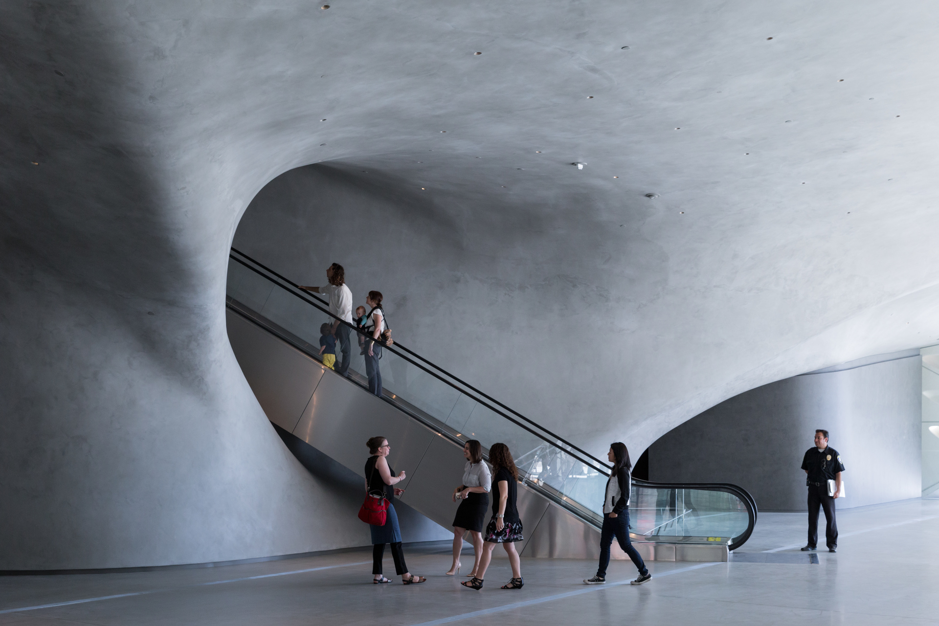 Hinter dem Schleier der Museumslobby herrscht eine andere Atmosphäre. Der Vorhang zeigt sich selbstbewusst als eigenständiges Gebilde und setzt sich von der dahinter liegenden Glasfassade ab. Es entsteht ein schmaler Gang im Aussenraum. Dunkle, höhlenartig gewölbte Betonwände führen zum kleineren Ausstellungsbereich (mit 1300 m²) für zeitgenössische Kunst. Ein Tunnel mit einer schmalen, 32 m langen Rolltreppe führt durch eine kleine, lichtdurchflutete Öffnung ins 2. Obergeschoss. Der fast 4000 m² grosse stützenfreie Raum mit seinen 7 m hohen Decken, in dem flexible Ausstellungswände in einem 3 × 3-Meter-Raster beliebig installiert werden können, wird über 318 nördlich orientierte Oberlichter einheitlich mit Tageslicht beleuchtet (Abbildung).