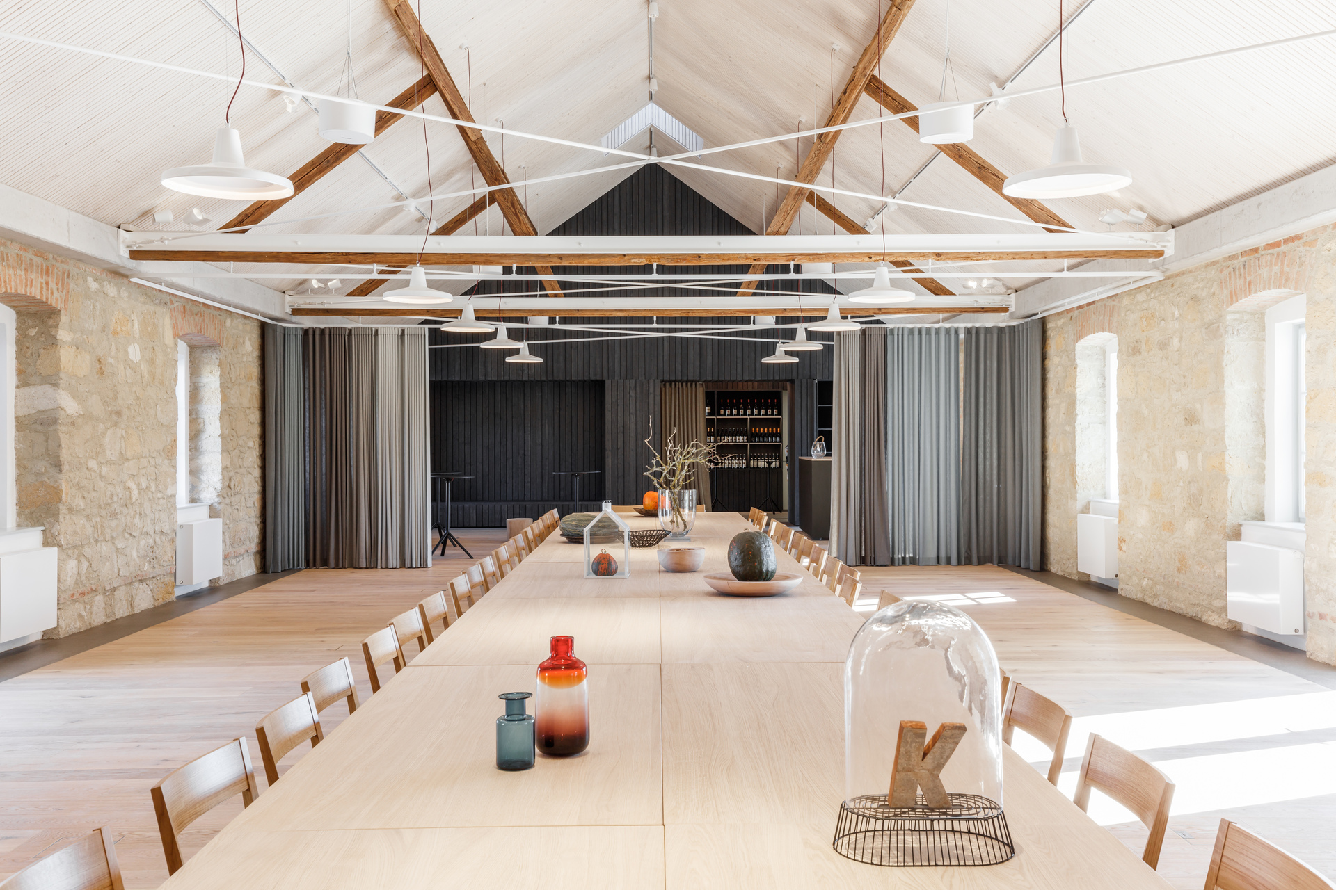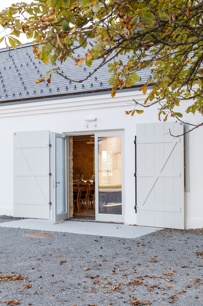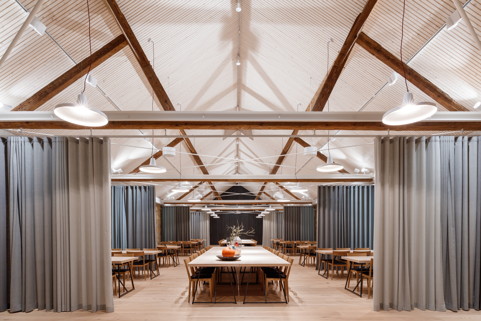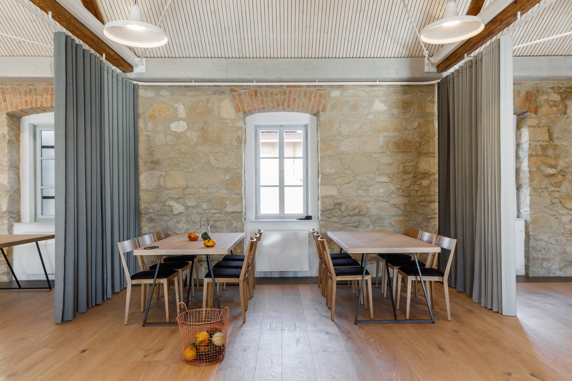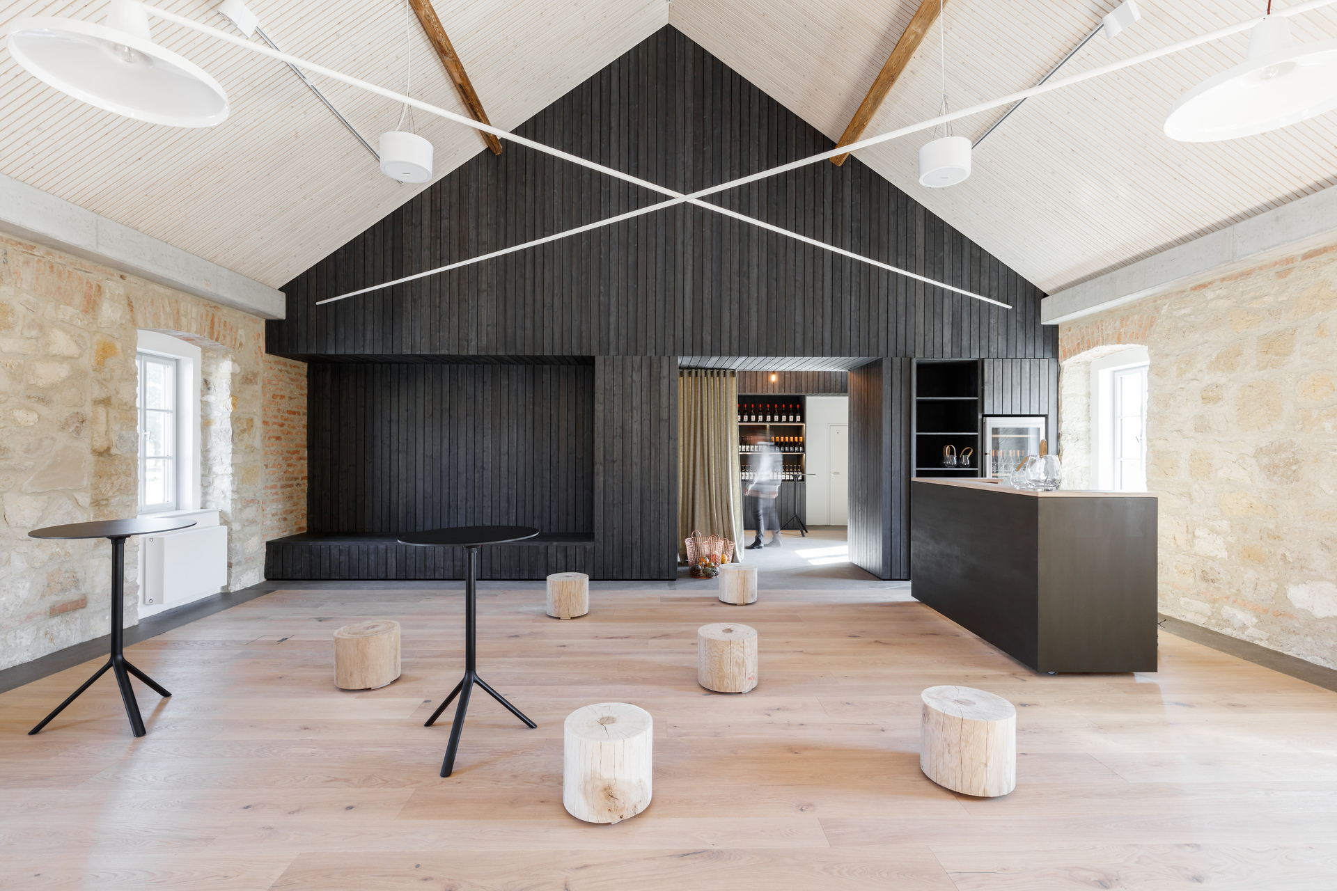 Weiß und Schwarz-Töne ergänzen die vorgefundene Palette an Naturfarben vom Ocker des Kalksteins über das Rot der Ziegelausmauerungen bis zum Dunkelbraun des historischen Dachtragwerks und machen von außen auf die neue Nutzung aufmerksam.