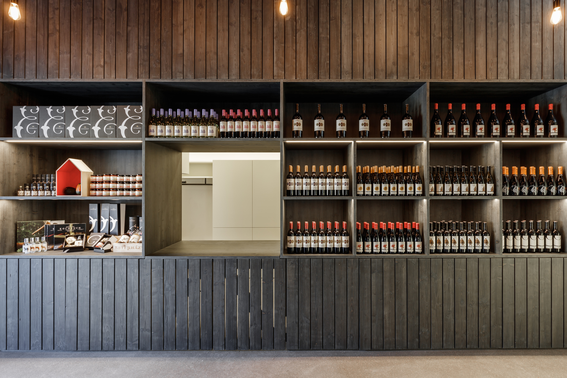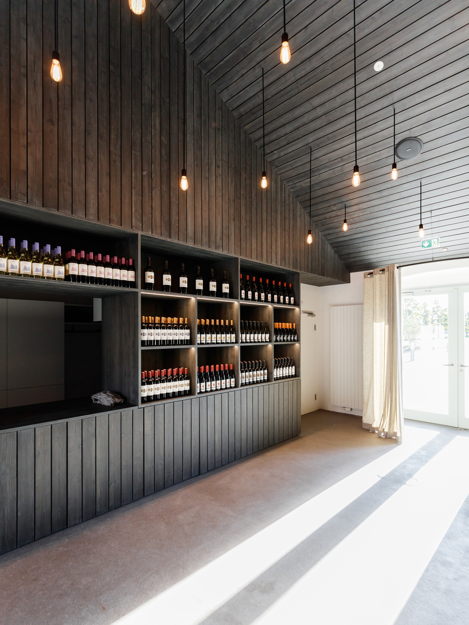 Im Inneren wird das ehemals in Kleinwohnungen unterteilte Gebäude komplett entkernt. Einzig die sorgfältig gemauerten Außenwände aus Sandstein bleiben bestehen. Diese tragen wesentlich zum Erscheinungsbild und zur Atmosphäre des neuen Veranstaltungsortes bei. Anthrazitfarbene Holzkörper definieren den offenen Raum und schaffen Platz für die nötigen dienenden Funktionen wie Garderobe, Küche und WC.
