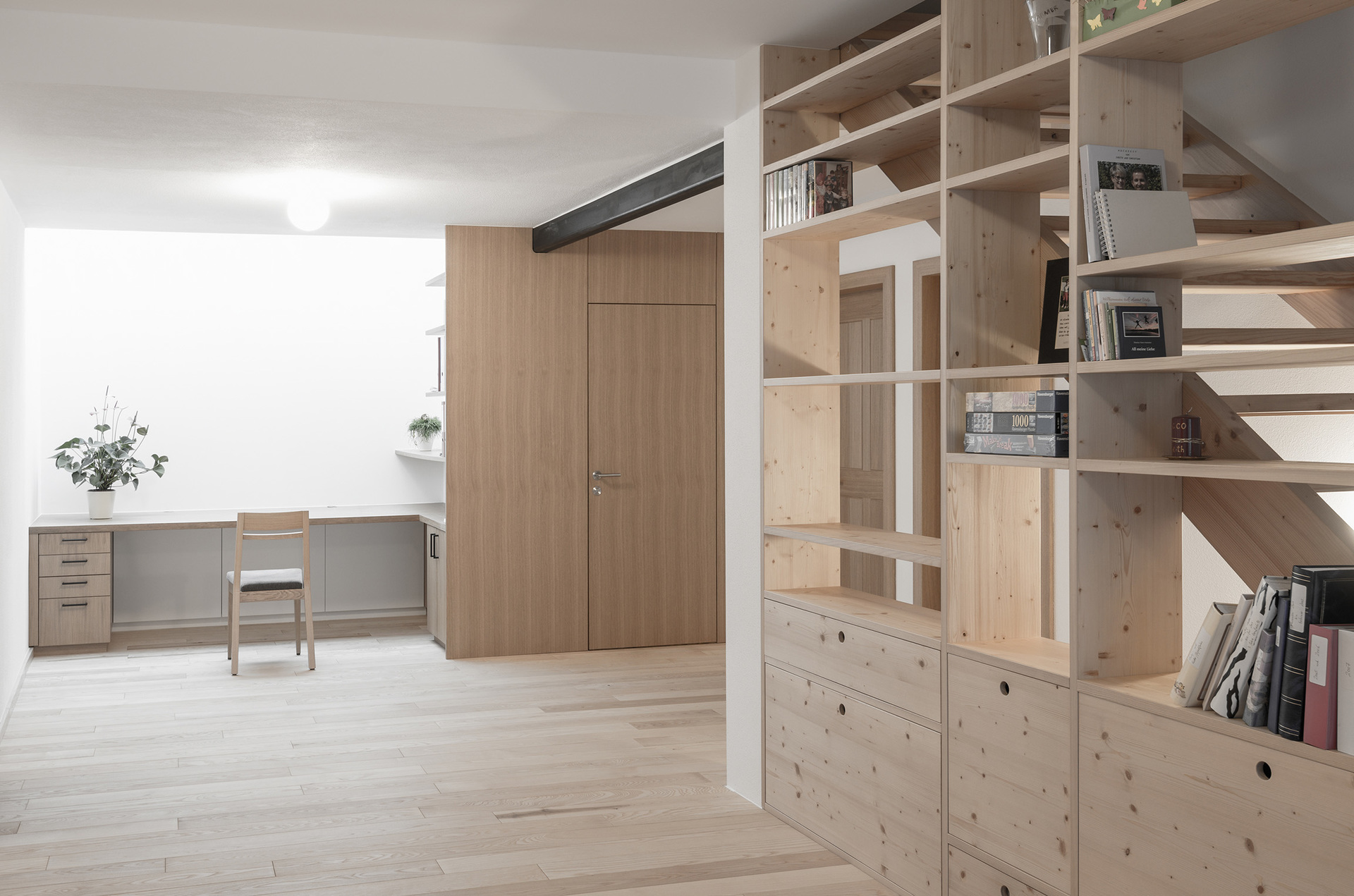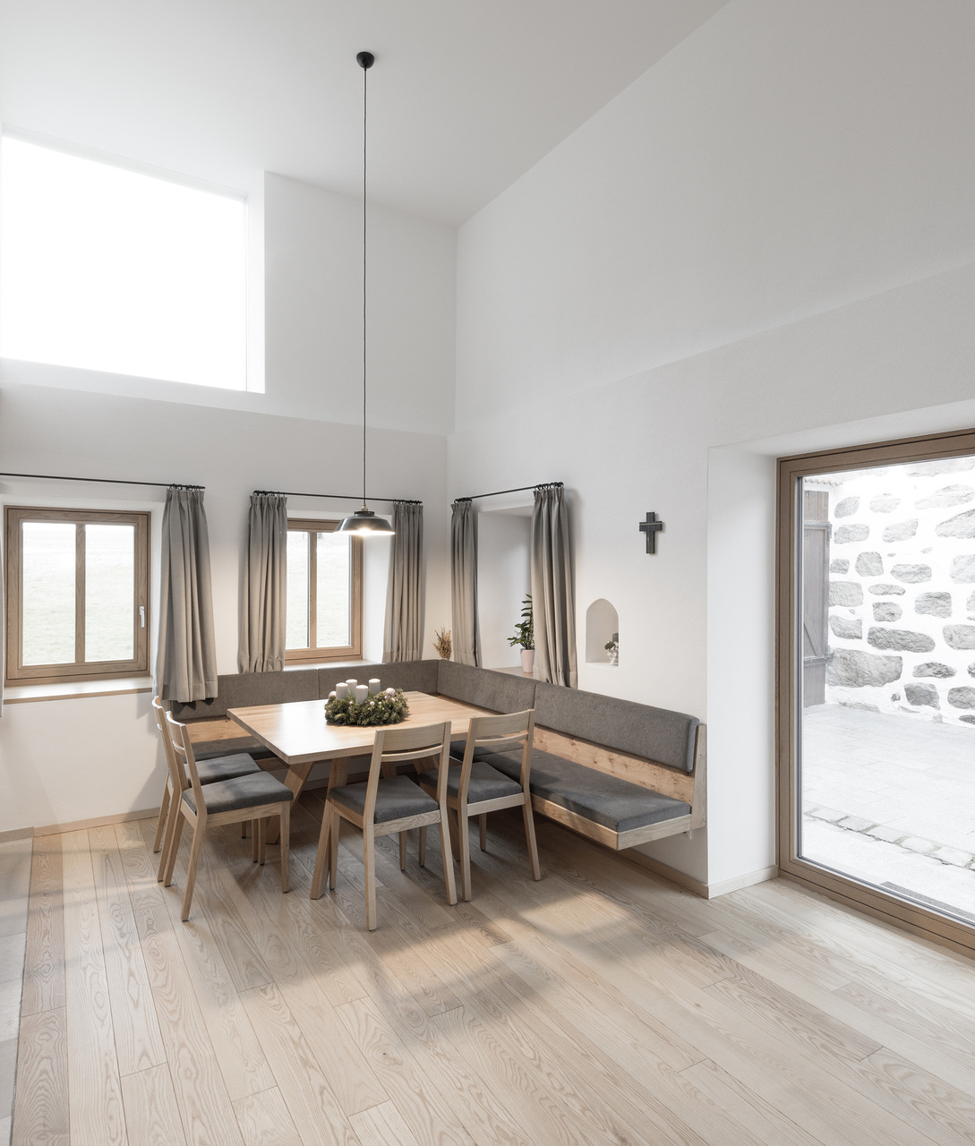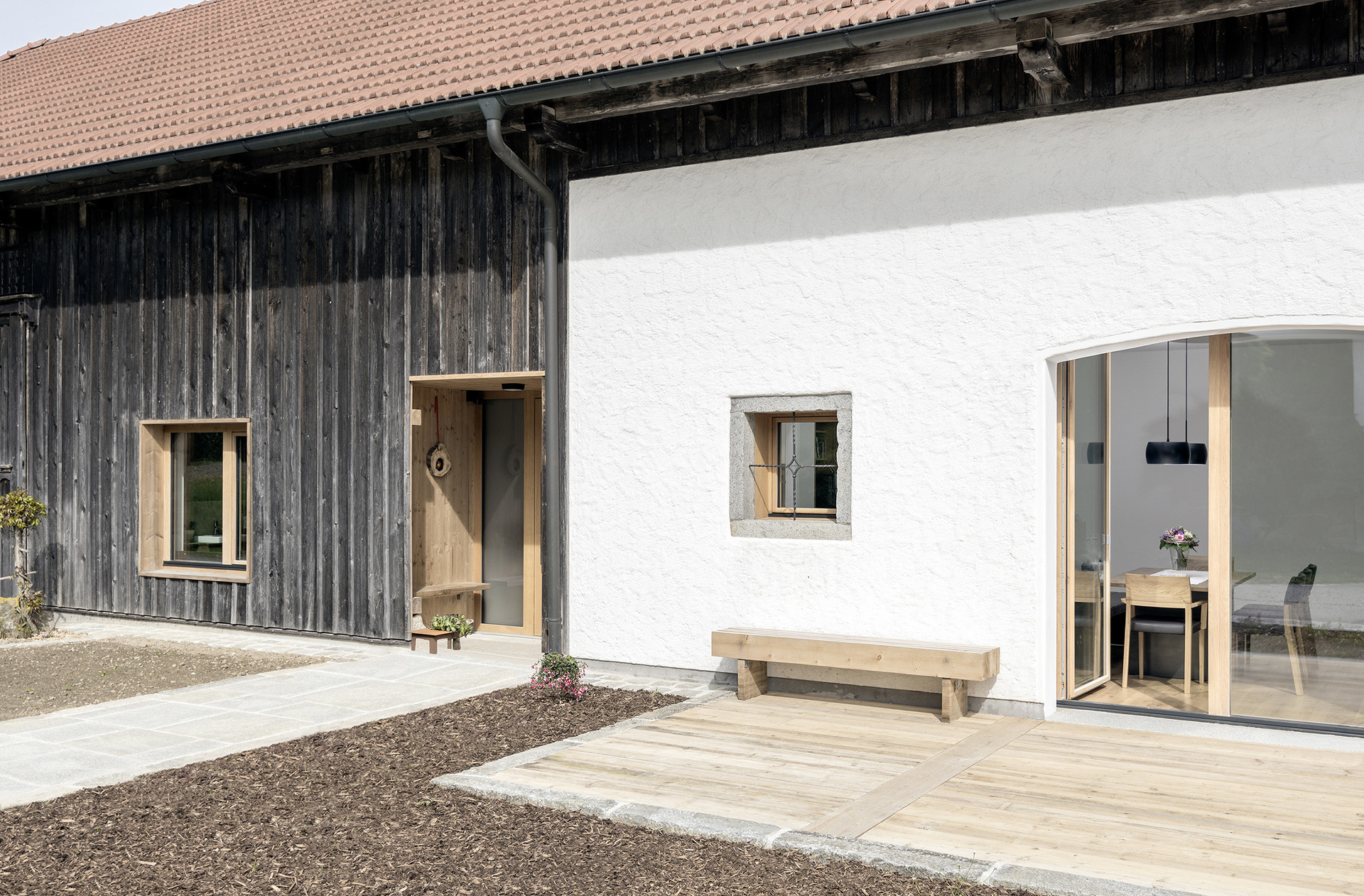 Im renovierten Hausstock leben nun die Jungen. Im ehemaligen Stadl und der Garage die Alten. Der Stall wird zur neuen Garage mit Werkstatt und Hackgutheizung. Der einstige Heizungsraum zur Fitness-Sauna. Nettes Detail am Rande: Die Baustelle war von Außen kaum wahrnehmbar. Für die Nachbarn war plötzlich ein Wohnzimmer in der Garage. (Text: Architekten)