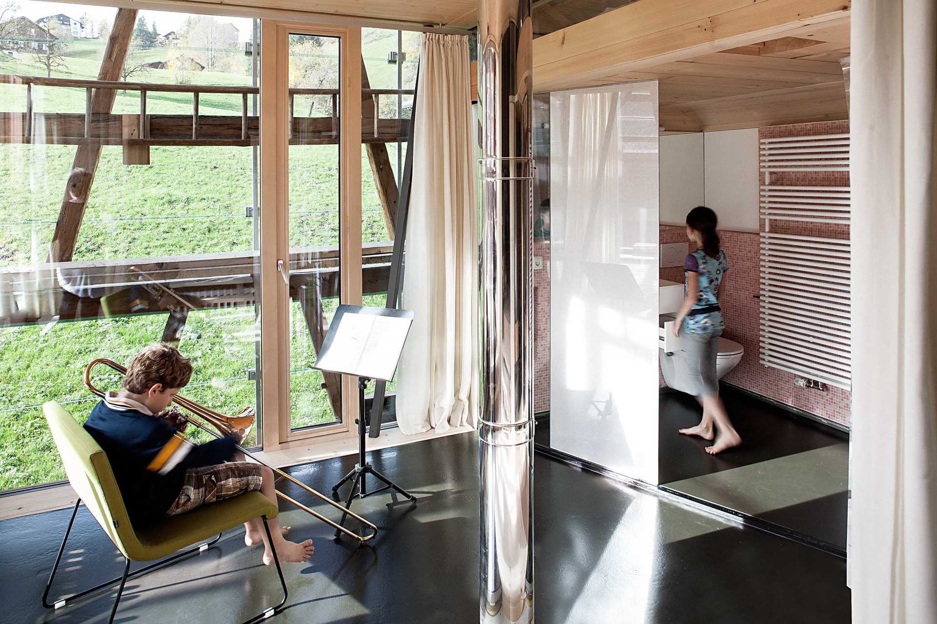 Unkompliziert betritt man die Räumlichkeiten. Über die Stalltreppe gelangt der Besucher auf eine Art Vorplatz, oder Hof, innerhalb des umbauten Raums und steht nach der doppelflügeligen Glas-Eingangstür am Esstisch an. Die Küche mit Holz-Kochherd, Arbeitsfläche aus großgemusterten Zementfliesen, Fronten Email verkleidet, bildet ein Gegenüber zur Aufschließung der weiteren Ebenen. Das Schlafzimmer mit Elternbad hält sich im Hintergrund, der Durchblick reicht jedoch bis zur Haustüre. Über die Treppe mit den grauen MDF-Einbaumöbeln (Musikinstrumentenschrank) gelangt man zum offenen Arbeitsbereich. Dieser orientiert sich zu einem Freiplätzchen, ebenso die Waschküche. Separat erreichbar ist das Musikzimmer vom Carport aus, außerdem das obere Niveau der Zonen für die Kinder, mit der alten Holztreppe im Kaltraum. (Text: Martina Pfeifer Steiner)