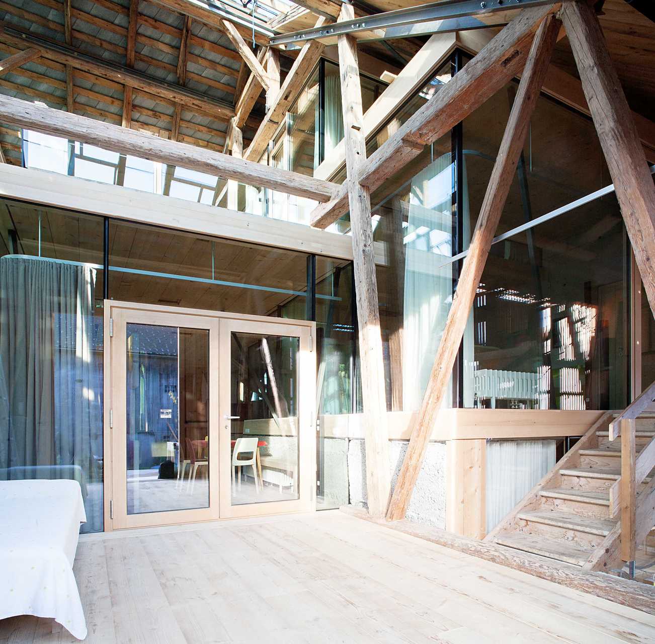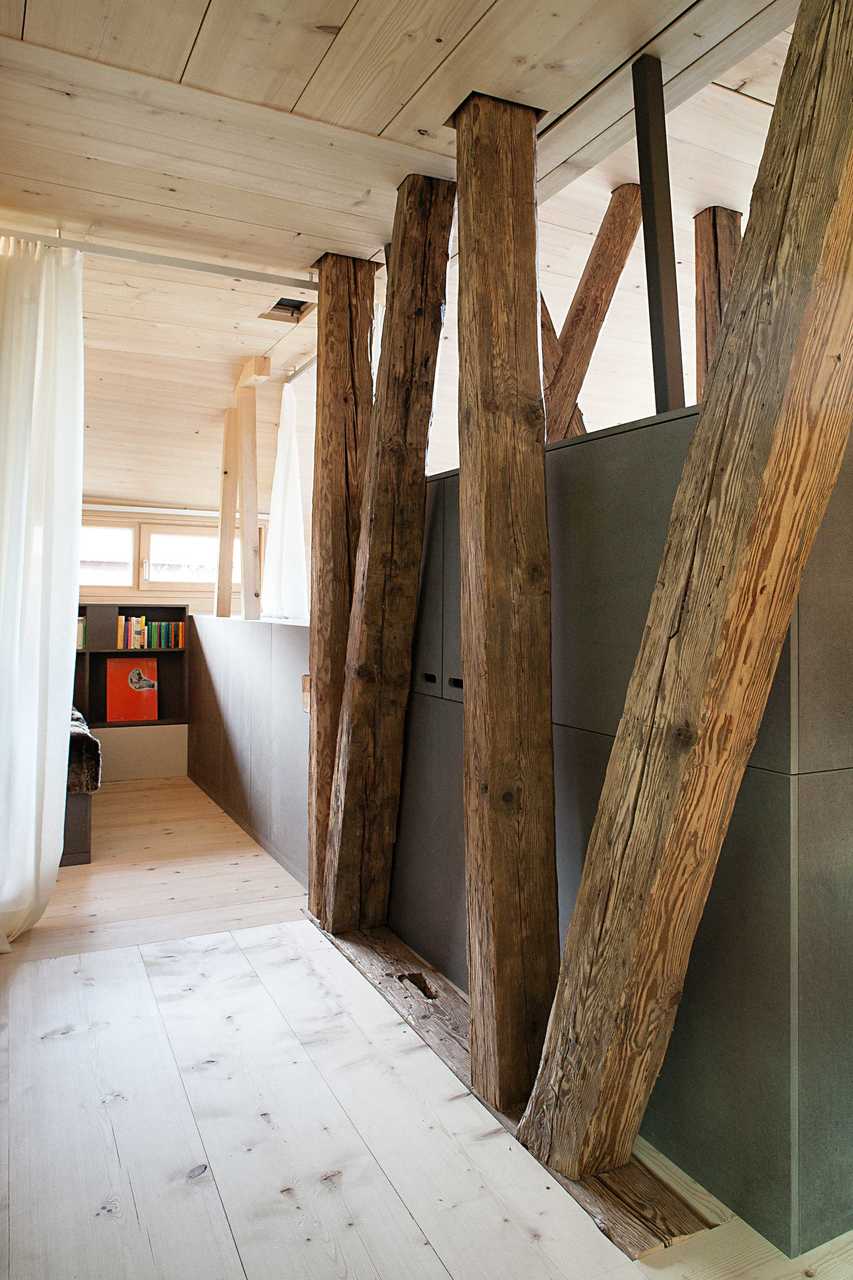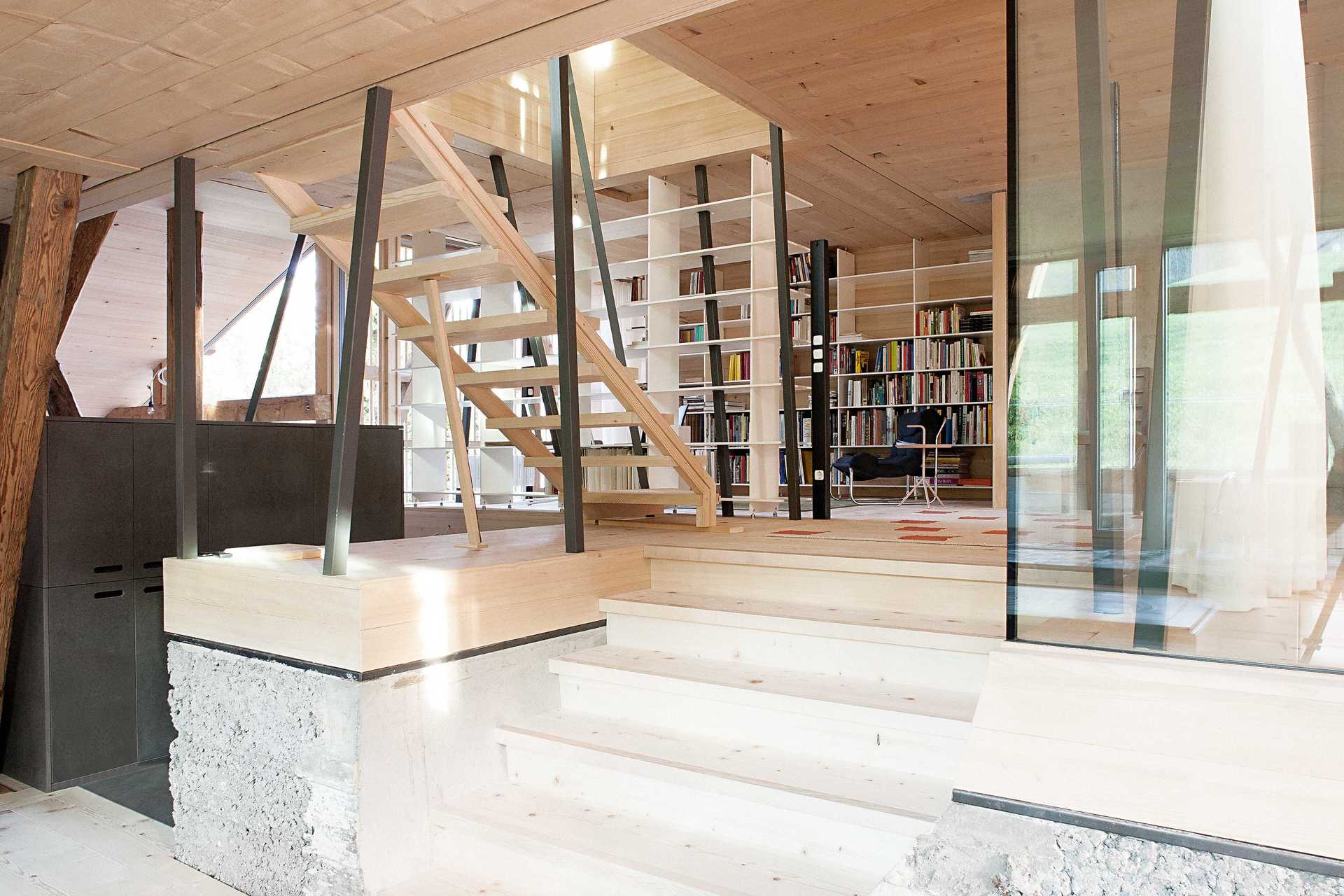 Völlig losgelöst ist die alte Tragstruktur der Scheune von den auf einem abstrakten Säulenwald schwebenden Wohnebenen, es gibt nur den Anschluss zum Vorderhaus, ansonsten nichts als Glas und die Plateaus aus massivem Holz. 25 zart dimensionierte Stahlsäulen sind in statisch logischen Stellungen, schräg, als Pendelstützen, nie in einer Ecke, nie parallel zu anderen Linien, bewusst ästhetisch, angeordnet. Um den Säulenwald vor Ort komponieren zu können, wird ein Befestigungssystem mit Kopf- und Fußteil entwickelt, in welches die in Überlängen gelieferten Stützen, nach dem individuellen Anpassen eingefädelt und verschraubt sind. Die Wohnebenen berühren die hüllende Konstruktion also nicht, die gestaffelte Raumabfolge lässt durch Glasstreifen auch zwischen den Levels die Sonne durchscheinen. Eher niedrige Raumhöhen, wie in der Bibliothek, relativieren sich in der Gesamtheit. Es gibt keine Fenster, sondern nur interessante Ausschnitte, aus ungewohnten Perspektiven.