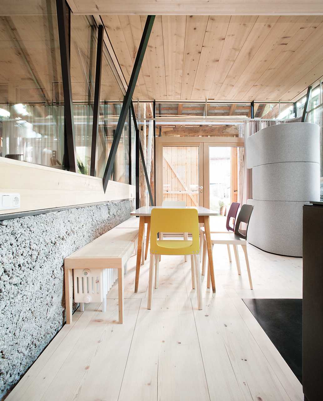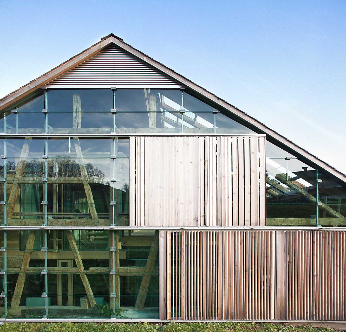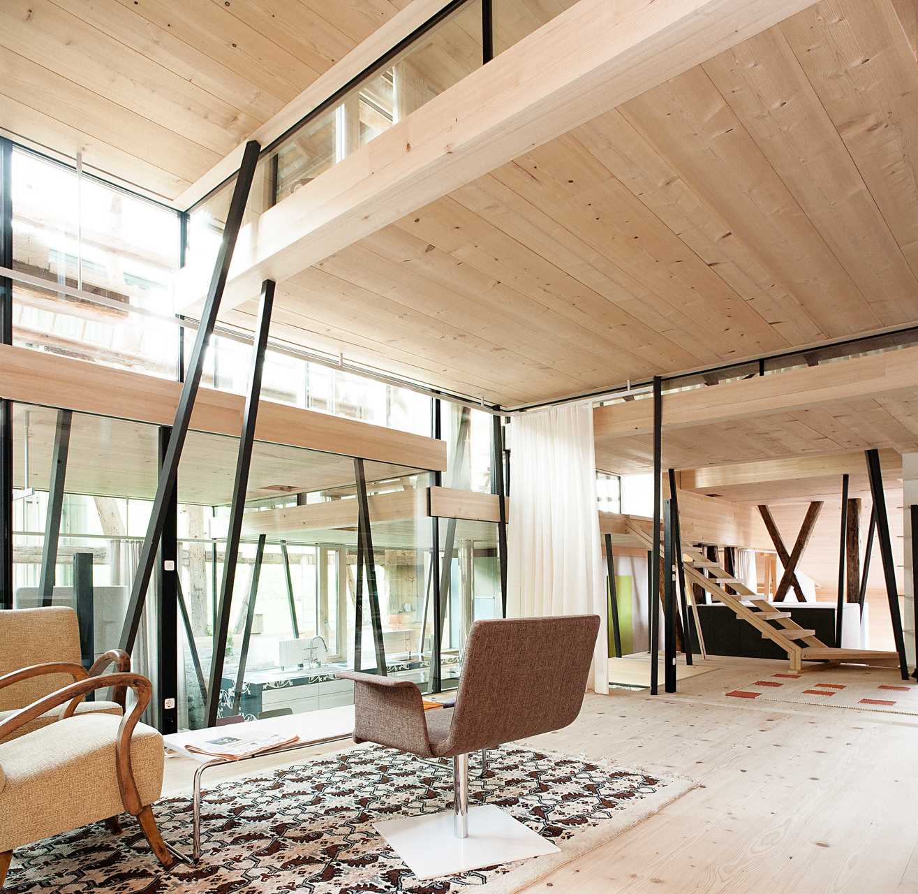 Völlig losgelöst ist die alte Tragstruktur der Scheune von den auf einem abstrakten Säulenwald schwebenden Wohnebenen, es gibt nur den Anschluss zum Vorderhaus, ansonsten nichts als Glas und die Plateaus aus massivem Holz. 25 zart dimensionierte Stahlsäulen sind in statisch logischen Stellungen, schräg, als Pendelstützen, nie in einer Ecke, nie parallel zu anderen Linien, bewusst ästhetisch, angeordnet. Um den Säulenwald vor Ort komponieren zu können, wird ein Befestigungssystem mit Kopf- und Fußteil entwickelt, in welches die in Überlängen gelieferten Stützen, nach dem individuellen Anpassen eingefädelt und verschraubt sind. Die Wohnebenen berühren die hüllende Konstruktion also nicht, die gestaffelte Raumabfolge lässt durch Glasstreifen auch zwischen den Levels die Sonne durchscheinen. Eher niedrige Raumhöhen, wie in der Bibliothek, relativieren sich in der Gesamtheit. Es gibt keine Fenster, sondern nur interessante Ausschnitte, aus ungewohnten Perspektiven.