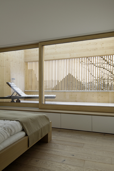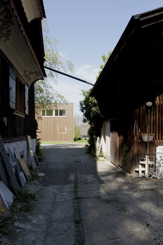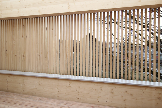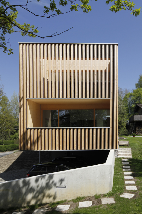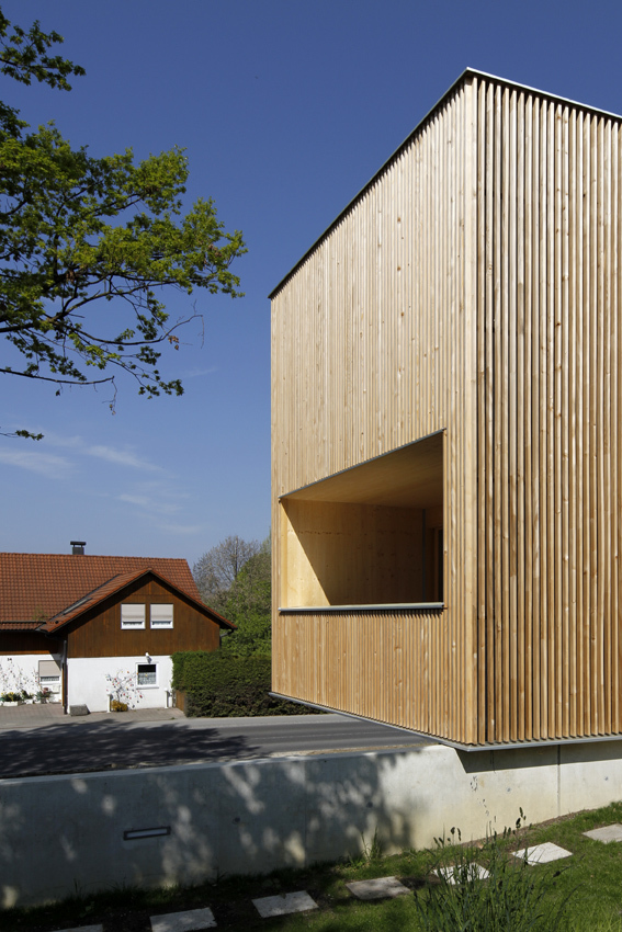 Der kompakte Baukörper besitzt eine vertikal verlaufende und luftig angeordnete Weißtannenfassade. Straßenseitig präsentiert sich das Einfamilienhaus sehr geschlossen: Nur ein langrechteckiges Fenster ist in die Fassade eingeschnitten; alle weiteren Fenster an dieser Gebäudeseite verstecken sich hinter der Holzlattung, die hier wie ein Filter wirkt. Ostseitig, in Richtung Garten, besitzt das Wohnhaus mehrere Fensteröffnungen unterschiedlicher Größe. Sie lenken die Blicke – sorgfältig ausgewählt – in die umgebende Landschaft.