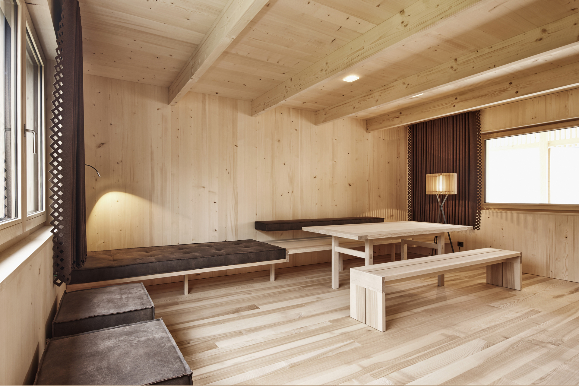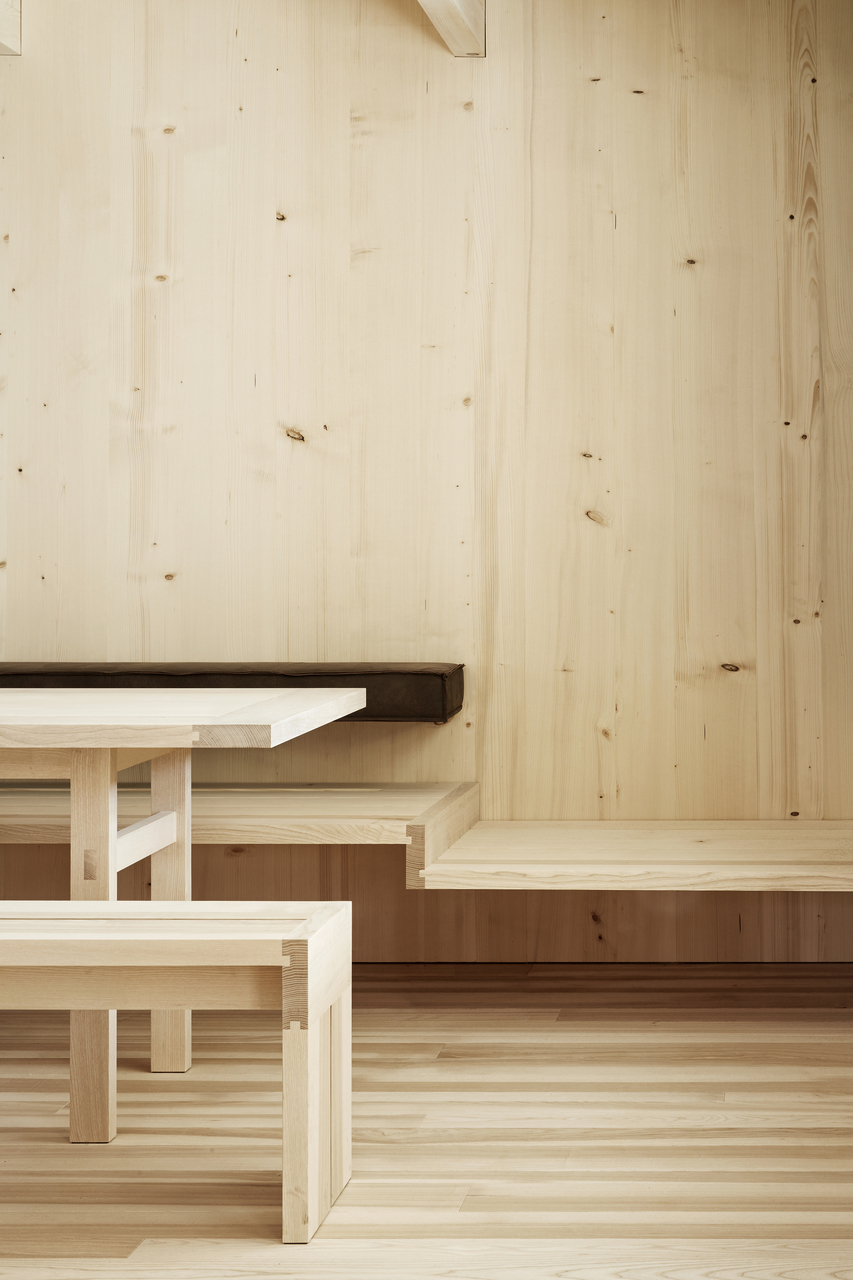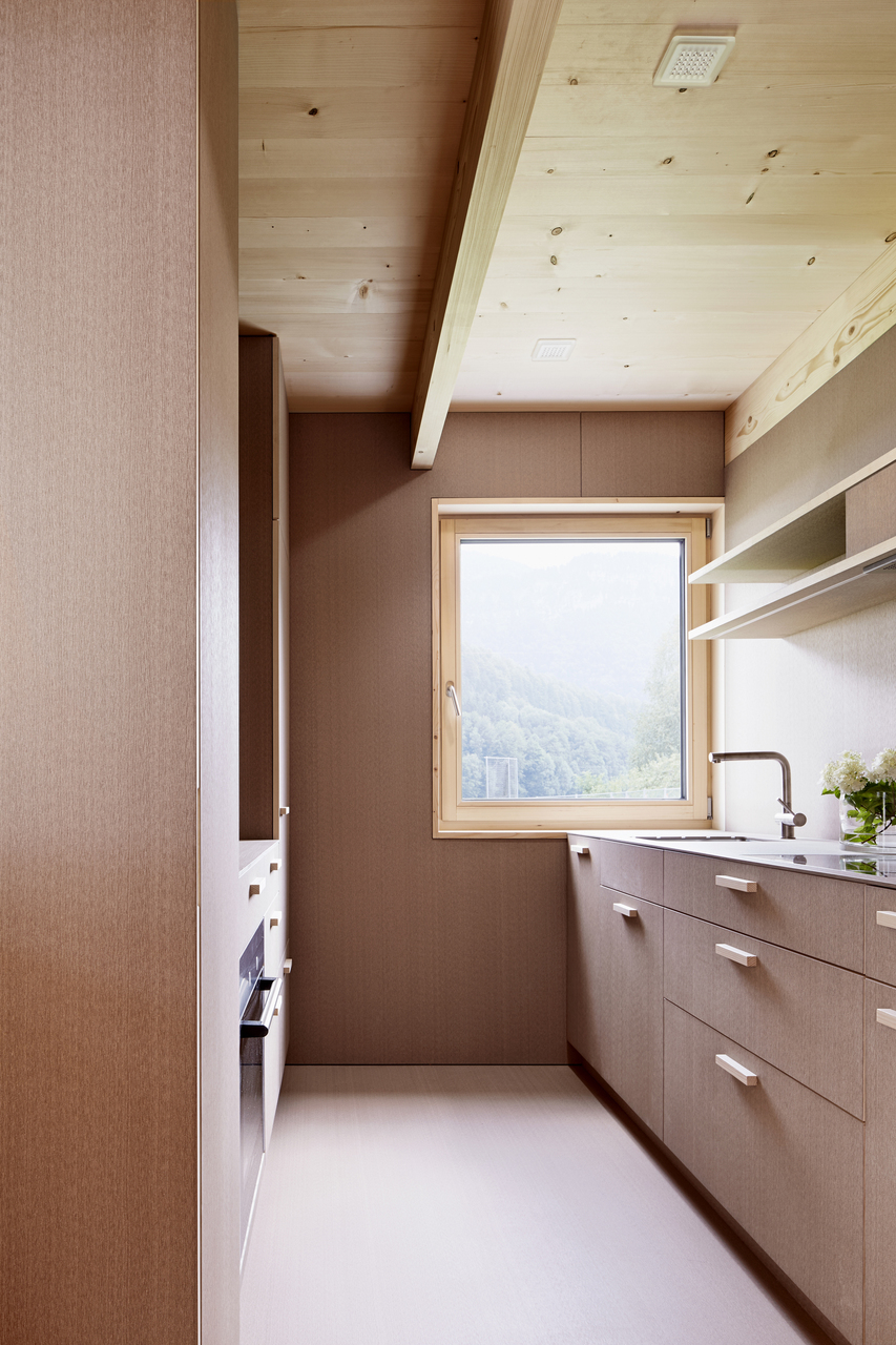 Die gesamte Massivholzkonstruktion und Fassade, Wände und Decken sind aus heimischer Fichte. Im Bereich des Schopfs ist die geschlossene Fichtenholzfassade aufgelockert. Hier bietet ein Holzscreen aus vertikal verlaufenden Lamellen einen konstruktiven Sonnenschutz und verhindert Einblicke. Sämtliche Möbel sowie der Boden sind aus Bregenzerwälder Braunkern-Esche.