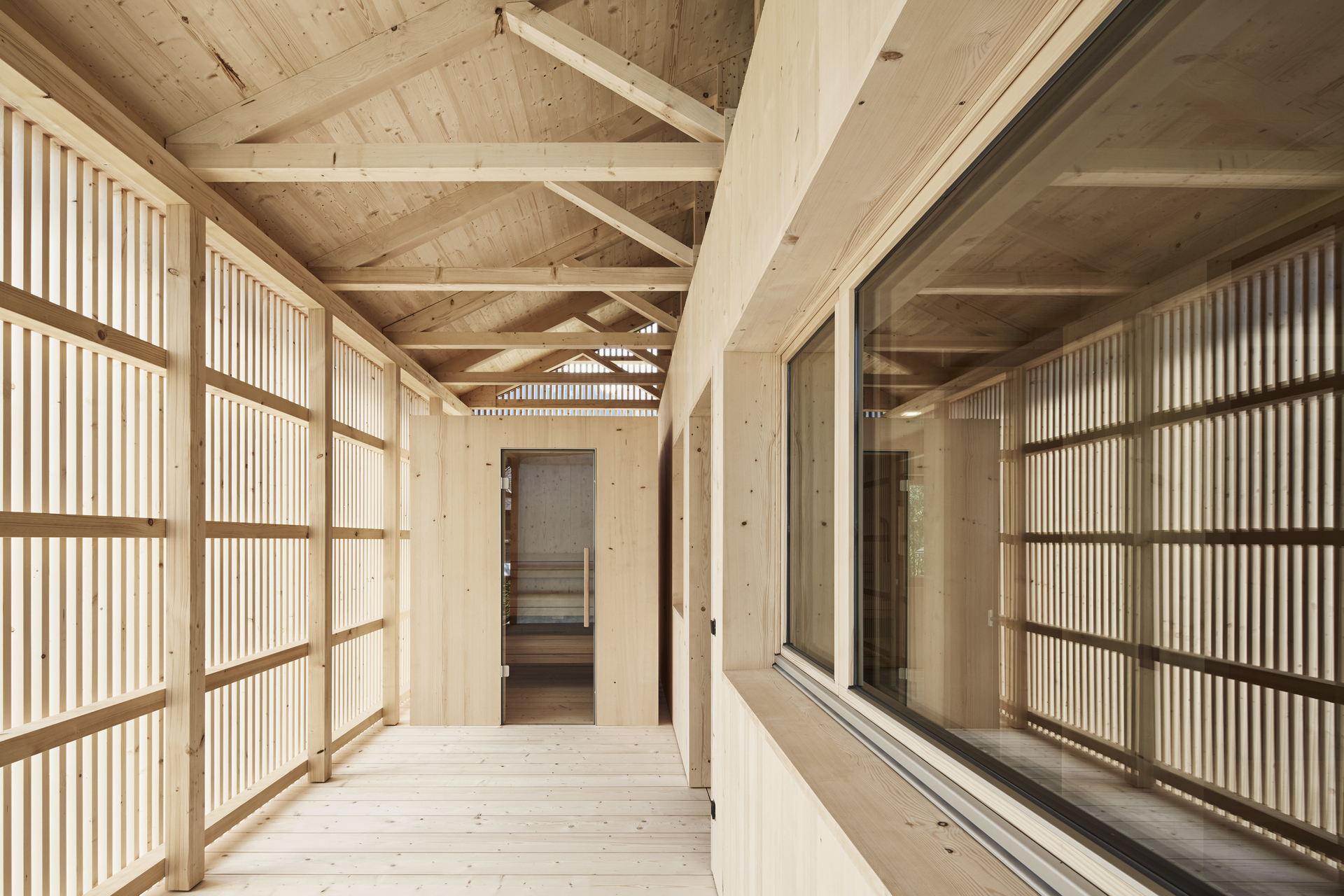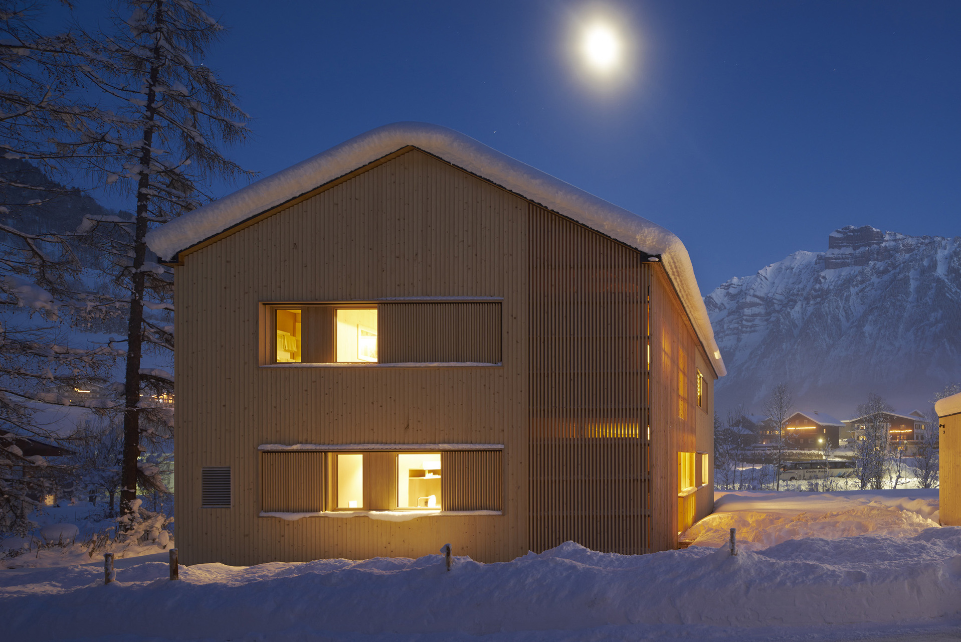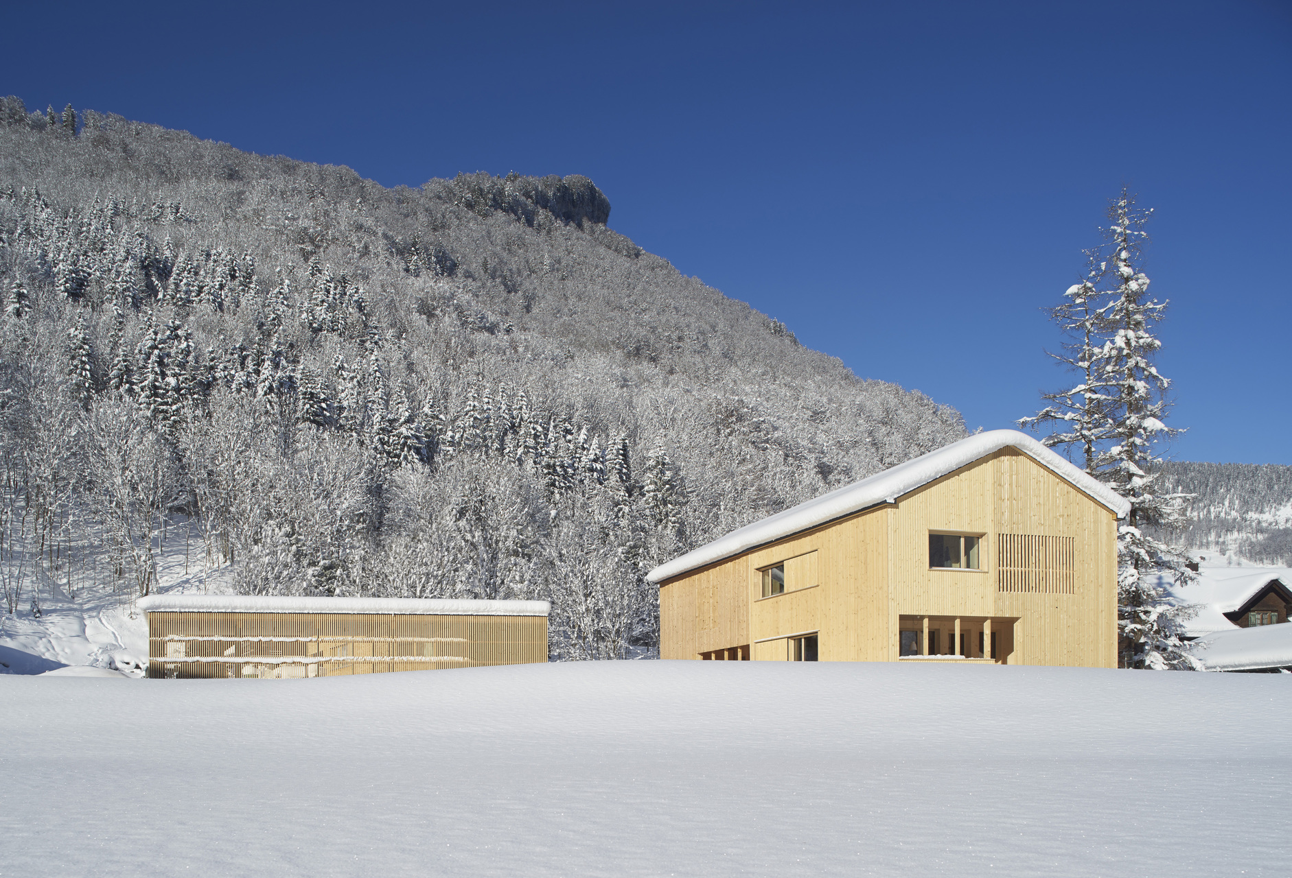 Die gesamte Massivholzkonstruktion und Fassade, Wände und Decken sind aus heimischer Fichte. Im Bereich des Schopfs ist die geschlossene Fichtenholzfassade aufgelockert. Hier bietet ein Holzscreen aus vertikal verlaufenden Lamellen einen konstruktiven Sonnenschutz und verhindert Einblicke. Sämtliche Möbel sowie der Boden sind aus Bregenzerwälder Braunkern-Esche.