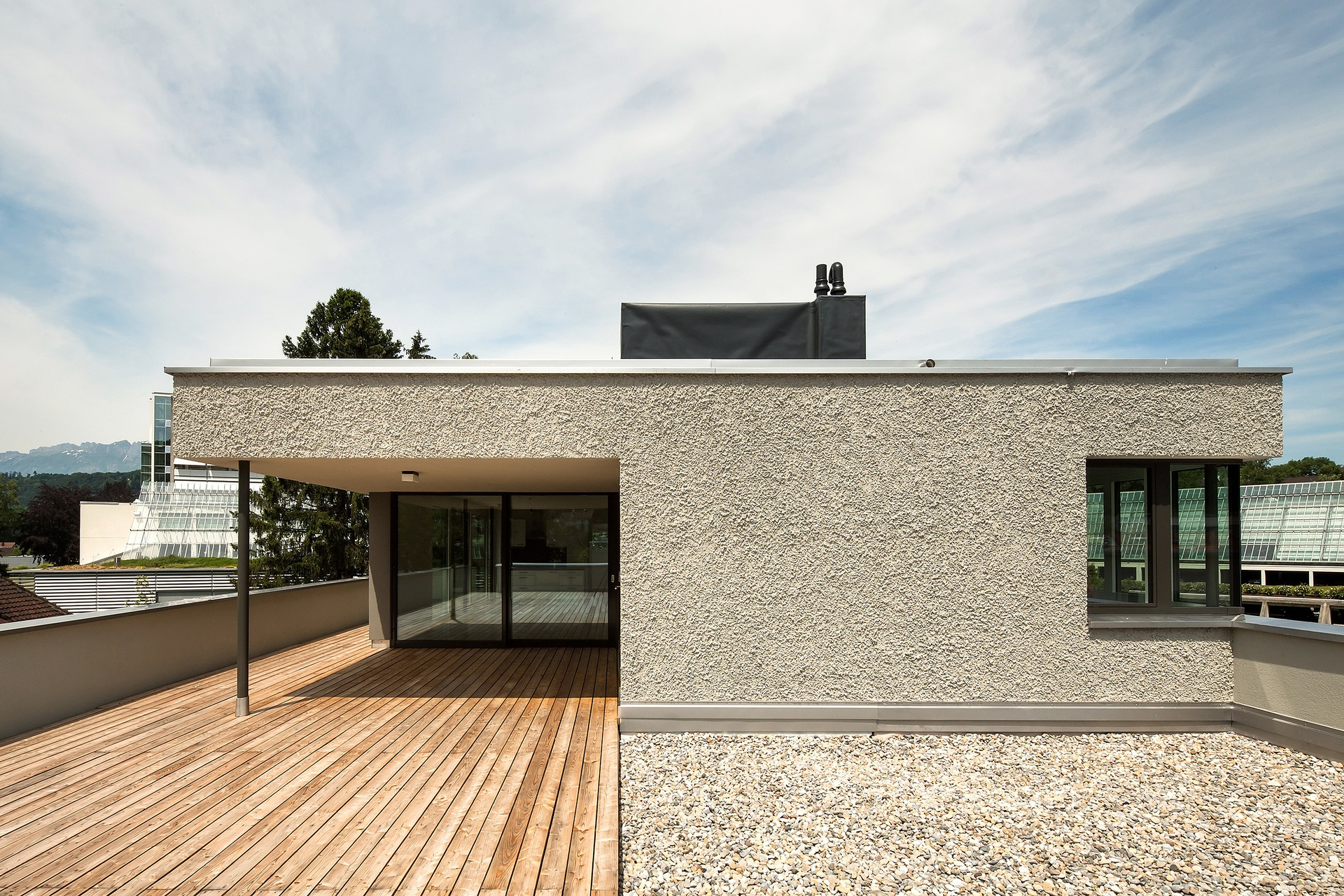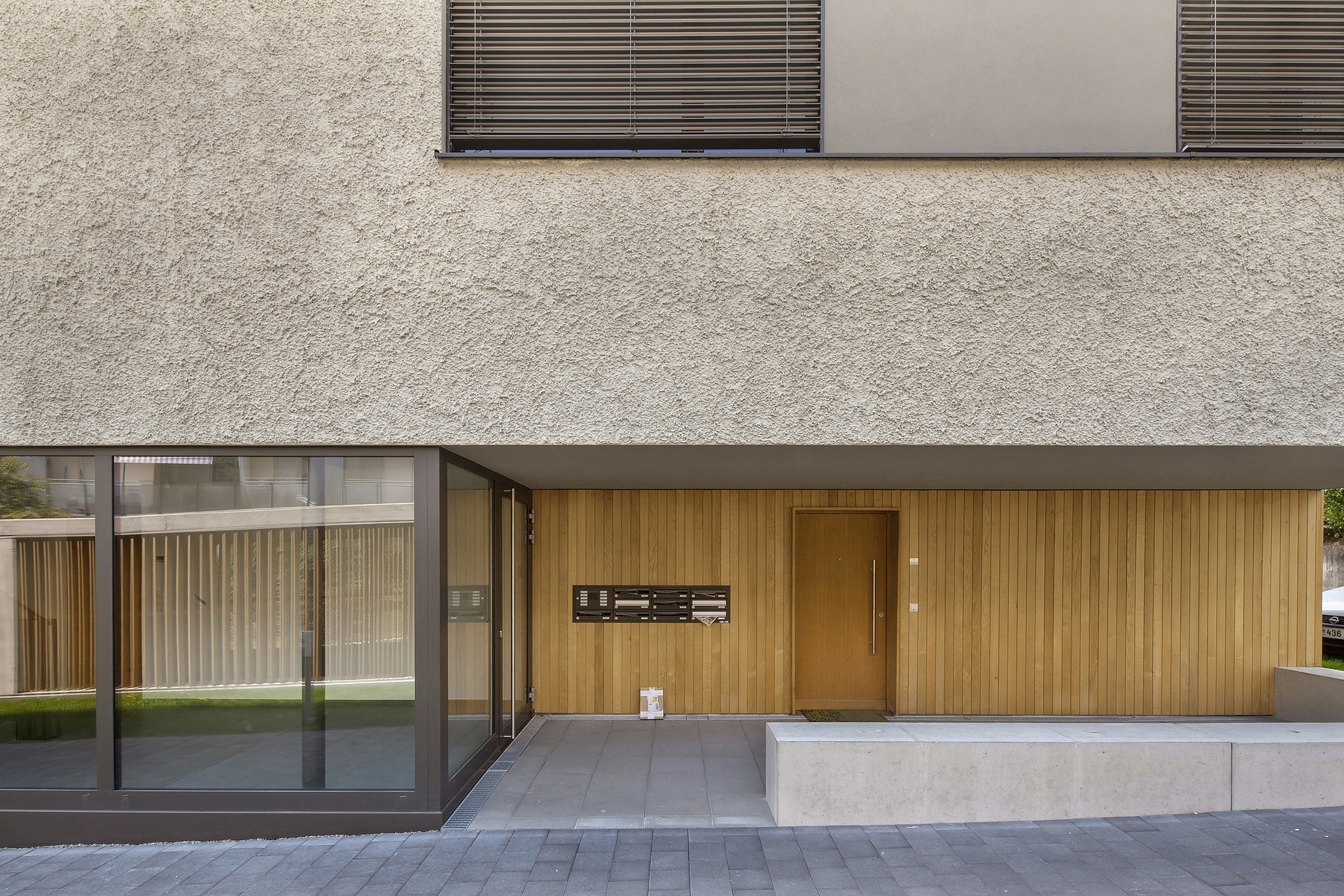 Die Erschließung der beiden Häuser erfolgt von der Nordseite. Tiefe Gebäudeeinschnitte im Erdgeschoß bilden gedeckte Eingangsbereiche, an die Innen Foyers mit Stiegenhaus anschließen. Einen angenehmen Kontrast zur groben, warmgrauen Putzoberfläche der Fassade setzt hier die glatte Eichenschalung.