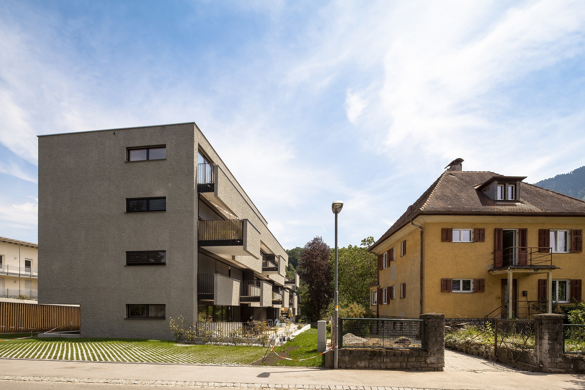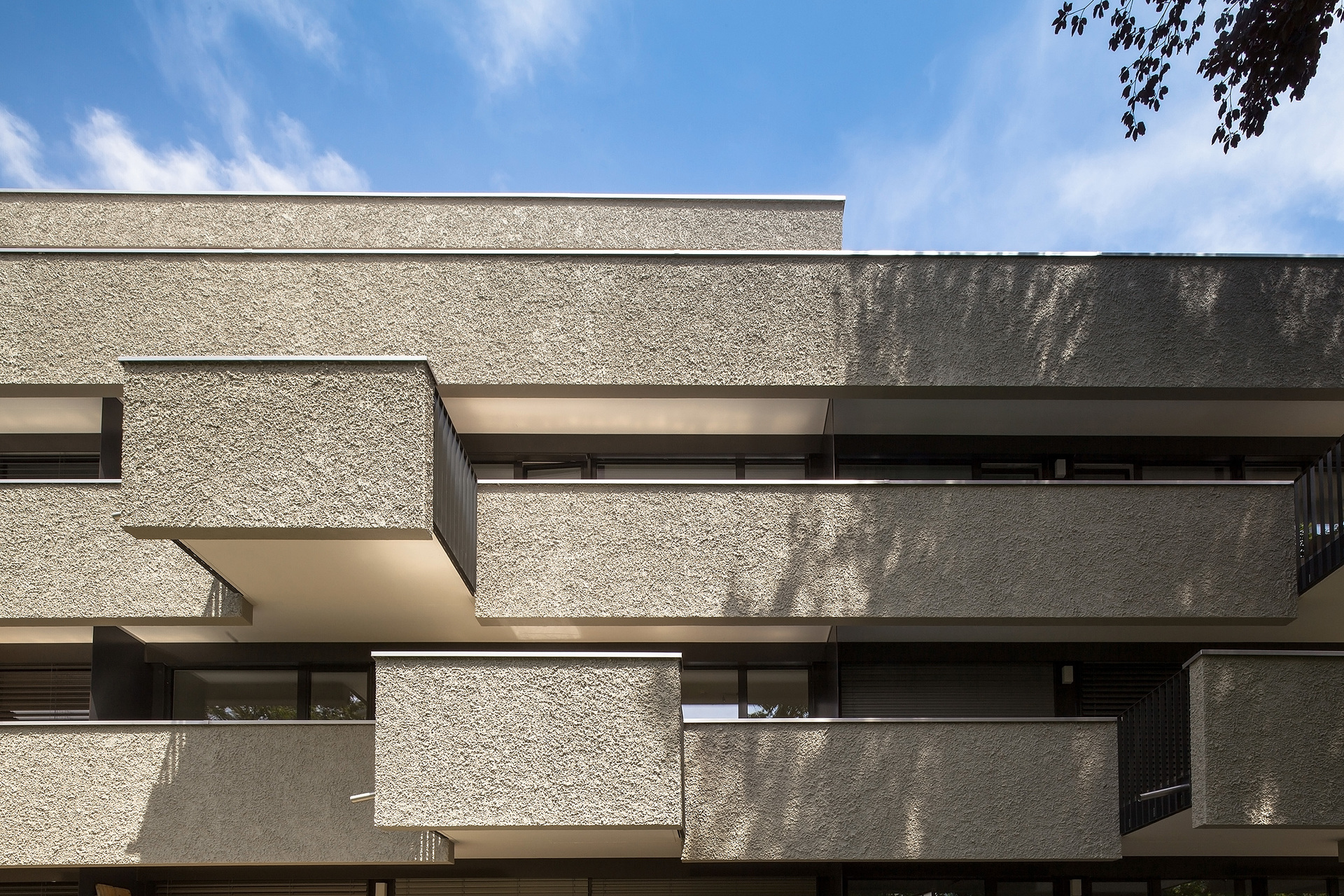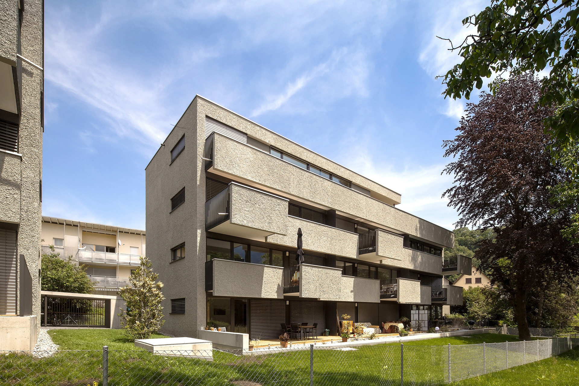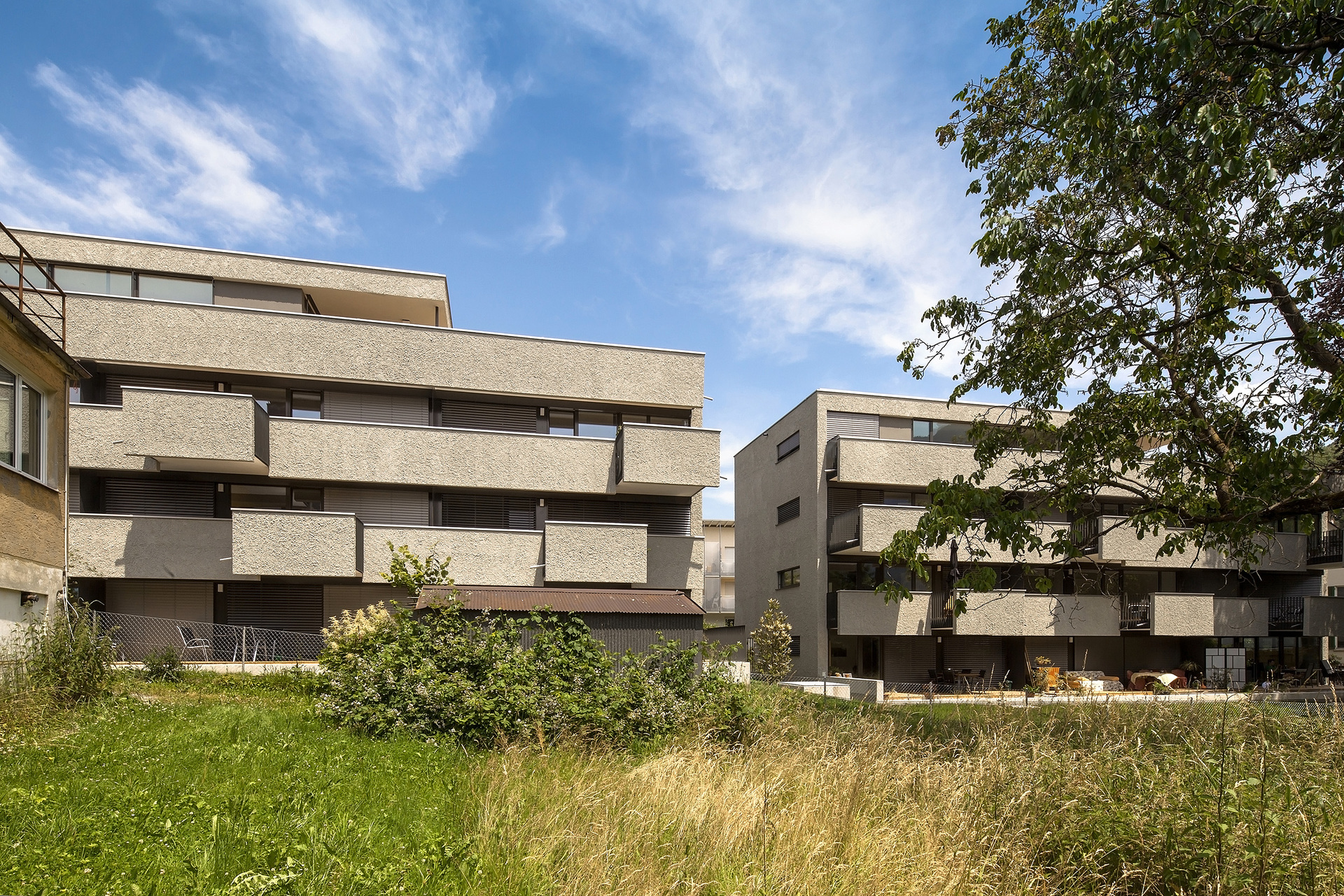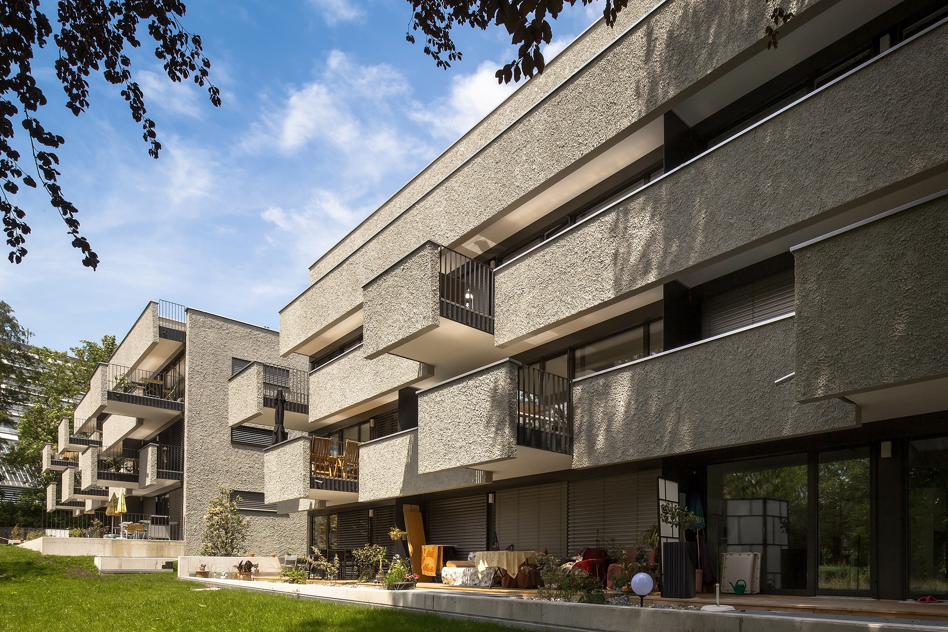 Die identen Wohnbauten besitzen jeweils zehn 2 bis 4-Zimmer-Mietwohnungen. Diese sind alle nach Südwesten hin orientiert und raumhoch verglast. Auf ganzer Länge sind den Obergeschoßen Balkone vorgelagert, die als Witterungs- und Sonnenschutz dienen. Jeder Balkon besitzt eine räumliche Erweiterung, die wie aus der übrigen Brüstung herausgefahren wirkt und Platz für einen großzügigen Sitzplatz unter freiem Himmel bietet. Durch die versetzte und asymmetrische Anordnung der hervortretenden Balkonelemente werden ein lebendiges Fassadenbild und eine starke plastische Wirkung erzielt. Die Wohnungen im Erdgeschoß verfügen über Terrassen mit Gartenzugang; die beiden Penthousewohnungen besitzen großzügige, teilweise gedeckte Dachterrassen. (Text: Julia Ess nach einem Text der Architekten)