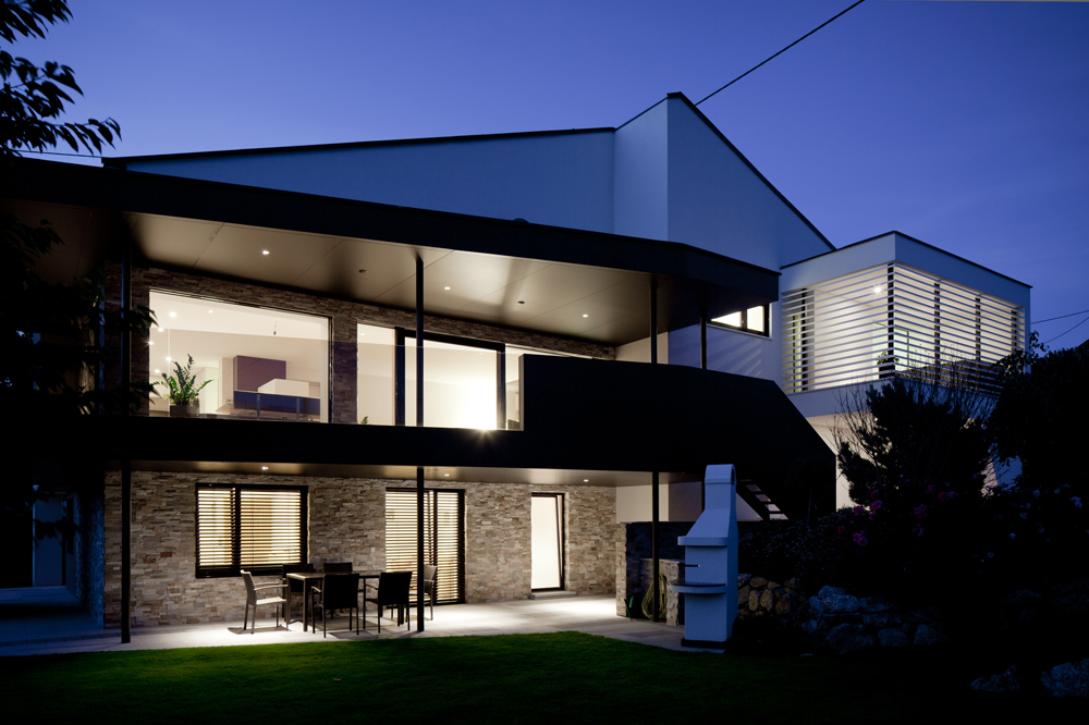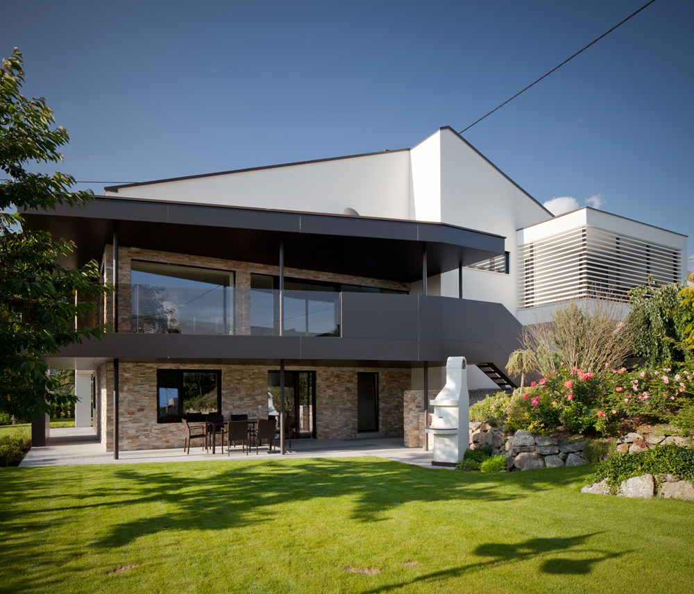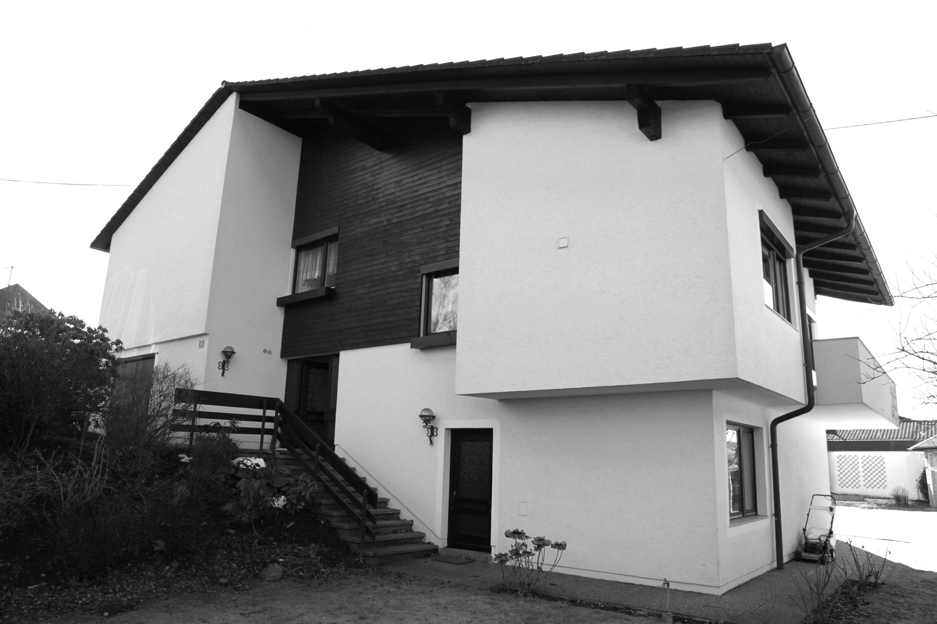 Die alte zugebaute Garage sollte in das Haus integriert werden, um einen einheitlichen Hauscharakter herzustellen. Dieser Anbau war prädestiniert für zusätzlichen Wohnraum im Obergeschoss. Ein Holzaufbau erweitert die gewünschte Schlafebene. Damit die Garageneinfahrten und der Eingangsbereich wetterbedingt geschützt werden, wurde diese Holzkonstruktion nach vorne gezogen und verlängert.