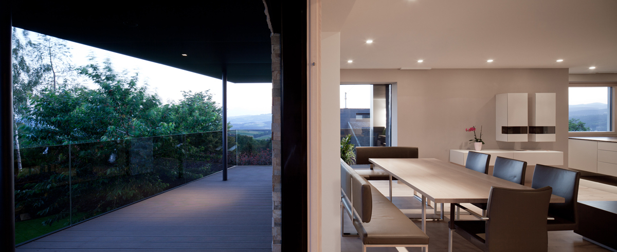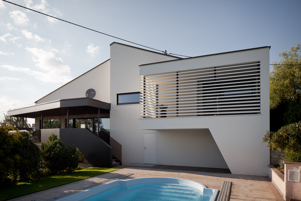 Im unteren Halbgeschoss befinden sich die mittels großer Fenster lichtdurchfluteten eigentlichen Wohnräume. Das erweiterte Obergeschoss bietet nicht nur Platz für Schlafraum und Badezimmer, sondern auch für eine geschützte Terrasse mit Wellnessbereich. Diese zwei Halbgeschosse können nun mittels einem neu realisierten Verbindungsgang intern erreicht werden. Das alte Stiegenhaus blieb, jedoch wird es nicht mehr in den eigentlichen Wohnraum integriert. Die im Keller gelegene Wohnung ist Altbestand und dient als Wohnung für Gäste. (Text: Architekten)