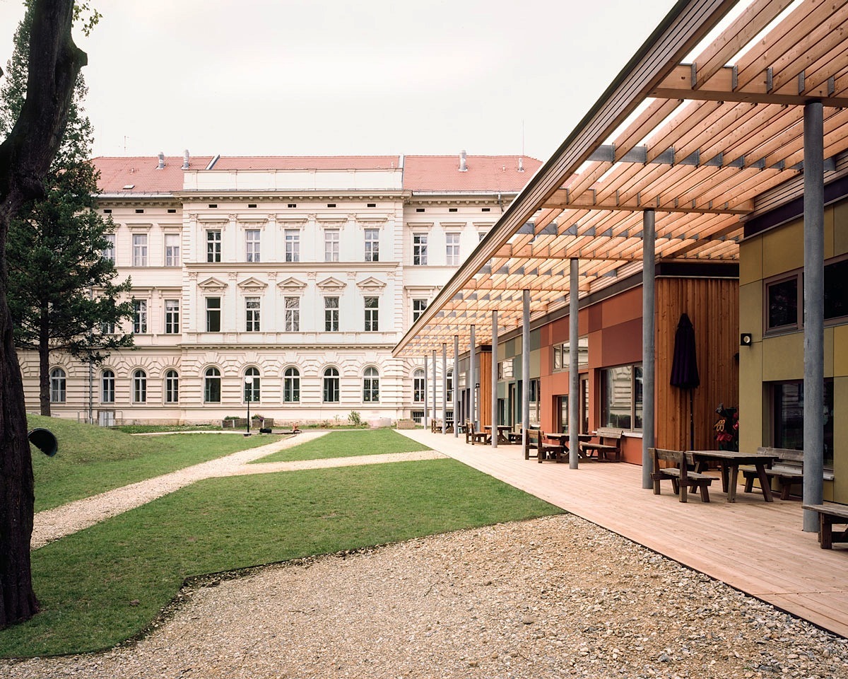 Vom Land Steiermark zum Wettbewerb geladen positionieren Nussmüller Architekten das benötigte Raumprogramm in Form eines nahezu quadratischen Pavillons am Campus des Förderzentrums für Sprach- und Hörbildung am Rosenberggürtel in Graz. Ein kompakter Solitär. Der, wenn auch „nur“ eingeschoßig, sich aufgrund seiner Proportion den ihm gebührenden Raum an der Seite des erhabenen, dreigeschoßigen Haupthaus selbstbewusst einnimmt. Und aufgrund seiner Ausführung als Holzbau – am von altem Baumbestand geprägten Grundstück – in fröhlicher Gelassenheit die vorhandene Atmosphäre keineswegs bricht. Diese Idee sei maßgeblich ausschlaggebend gewesen zum Gewinn des Wettbewerbs. Raum für 72 Kinder und 26 betreuende Personen aufgrund der besonderen Förderung der Kinder hinsichtlich Hör- und Sprachentwicklung.