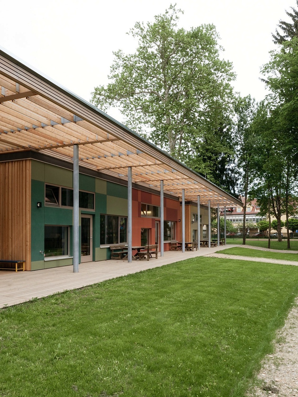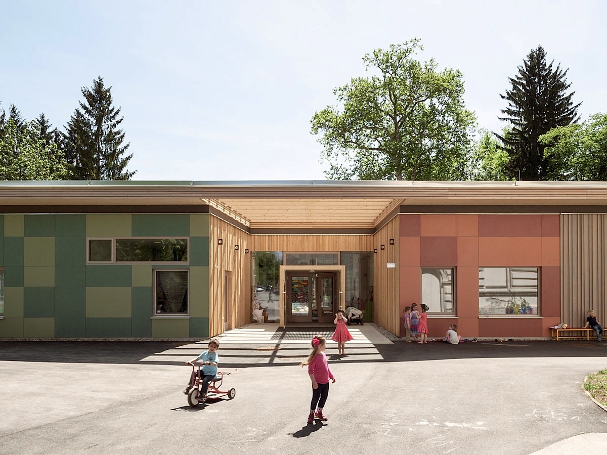 Im Park. Bei der Wahl der Farbtöne hat sich das Gebäude des Kindergartens Rosenberg die Natur zum Vorbild genommen. Das erlebbare Baumaterial Holz, die Lichtgestaltung und die Fensterpositionierung heben die Gegensätzlichkeit Innenraum/Außenraum auf. Unmittelbar ineinander übergehende qualitativ unterschiedliche Bereiche – in ihrer Funktion jedoch klar lesbar – begleiten und unterstützen die Kinder in ihrem Sein und Lernen. Im Hier und Jetzt.