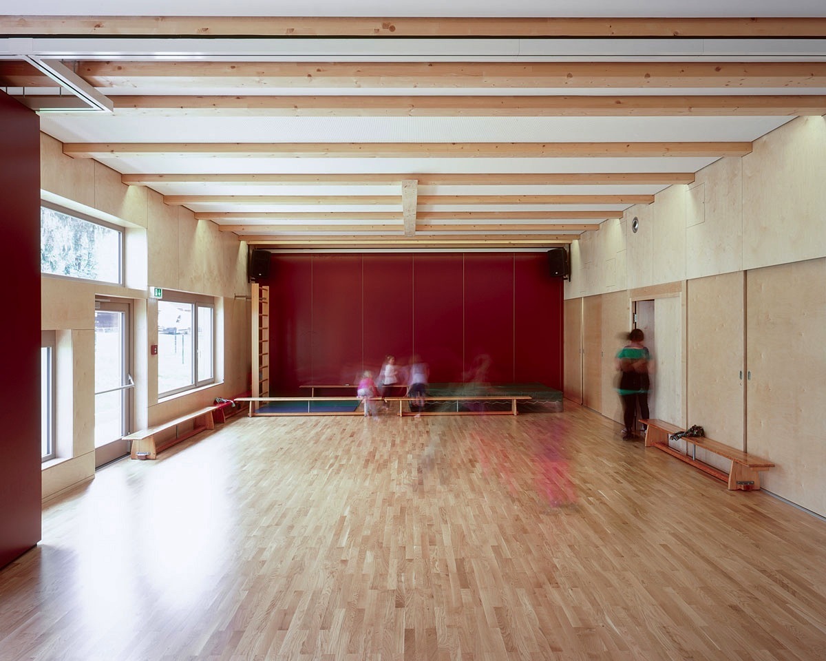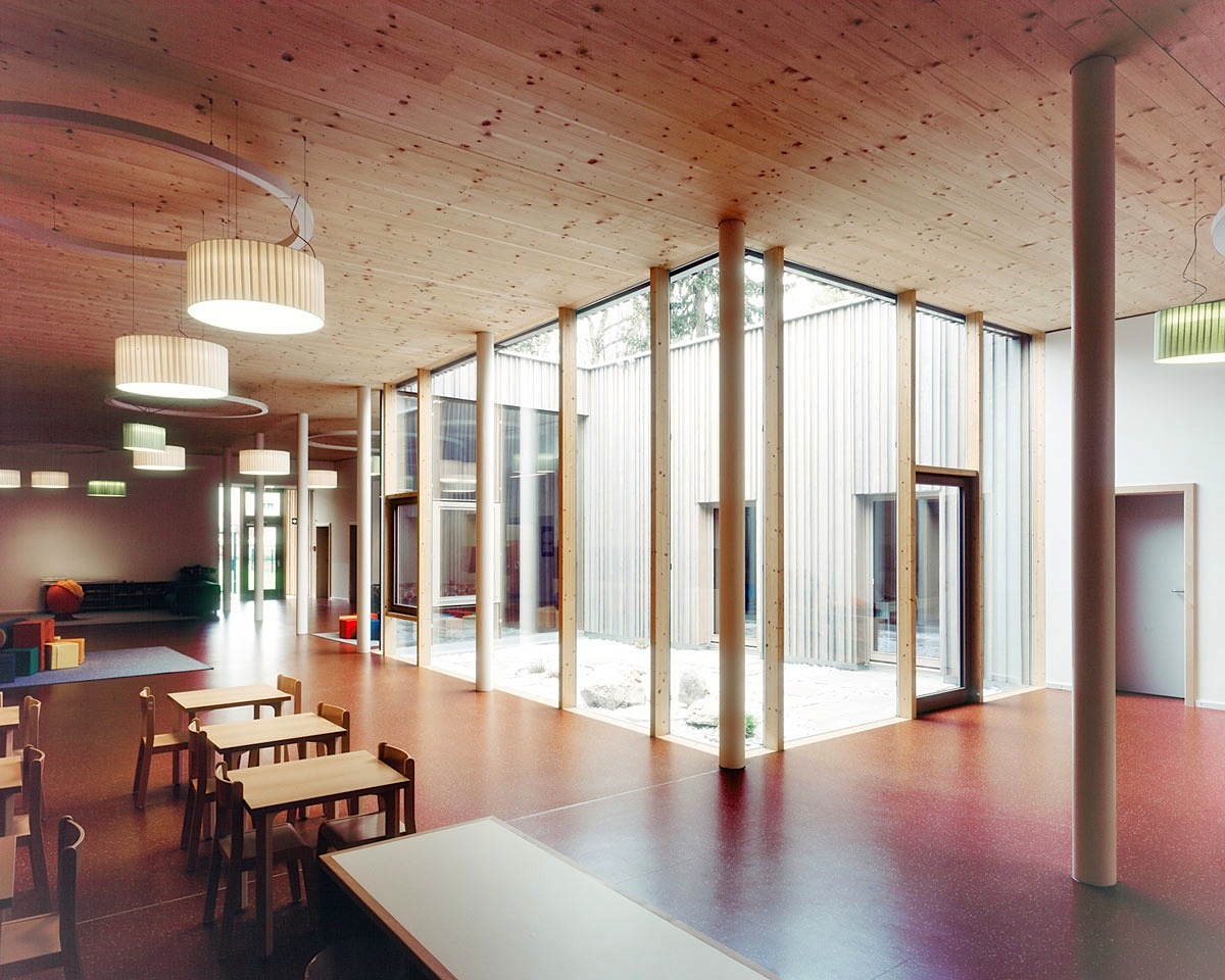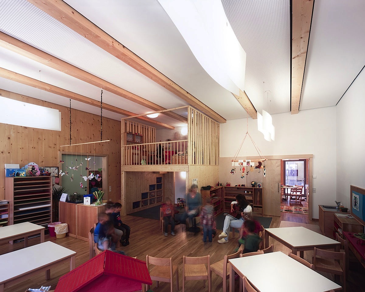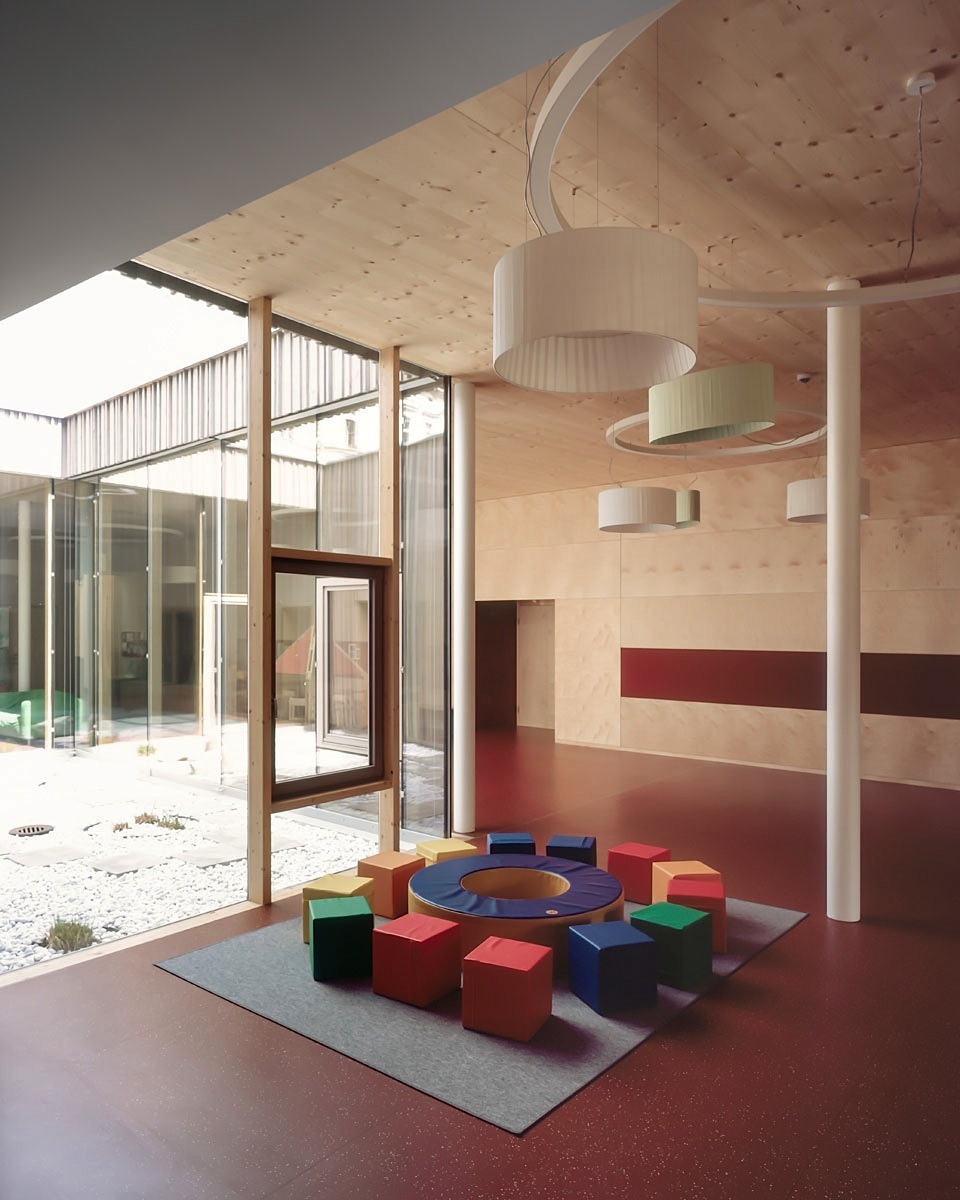 Viel Tageslicht im tiefen Gebäudeinneren: ein Atrium. War der Zentralraum ursprünglich als Verbindungsglied/ Erschließungsraum der einzelnen Funktionen gedacht, so ist er in der Praxis zum Herzstück des Kindergartens geworden. Seine differenzierte Belichtungssituation schafft im streng linearen Grundriss stimmungsvolle, weich ineinander übergehende Bereiche, in denen sich die Kinder gerne aufhalten. Thematische kleine Inseln zum gruppenübergreifenden Spiel im sanften Lichtermeer.