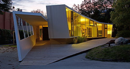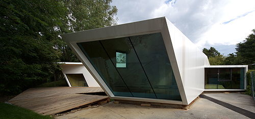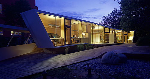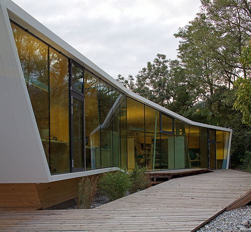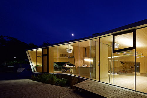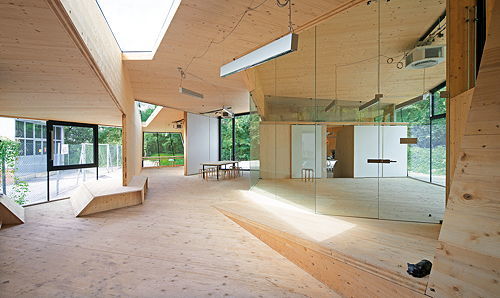 Entstanden ist ein pavillonartiges Werkstättengebäude, das nicht nur den Kindern und Jugendlichen als Nutzer:innen ein optimales Raumangebot bietet, sondern auch den Park durch seine einzigartige Architektur bereichert. Ausgehend von den unterschiedlichen Raumanforderungen entwickelten die Studierenden ein Kontinuum aus hellen, offenen, niederen und erhöhten Bereichen: eine Materialwerkstatt und eine Medienwerkstatt, ein Malatelier und ein alle Bereiche vernetzender Kommunikationsraum zum Arbeiten und Chillen, außerdem ein Büro mit Teeküche und zwei Nasszellen. Vorgelagerte Terrassen und raumhohe Glasfronten verbinden den geschwungenen Baukörper mit der Umgebung, im Inneren bilden schräge Böden und Wände einen fließenden Übergang zwischen den einzelnen Bereichen mit ihren unterschiedlichen Atmosphären und Arbeitsmöglichkeiten. Nicht nur das Werkstattgebäude selbst und die ca. 200 m² Terrassenfläche, sondern auch die gesamte Inneneinrichtung wurde von den Studierenden geplant und umgesetzt.